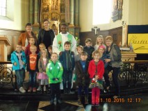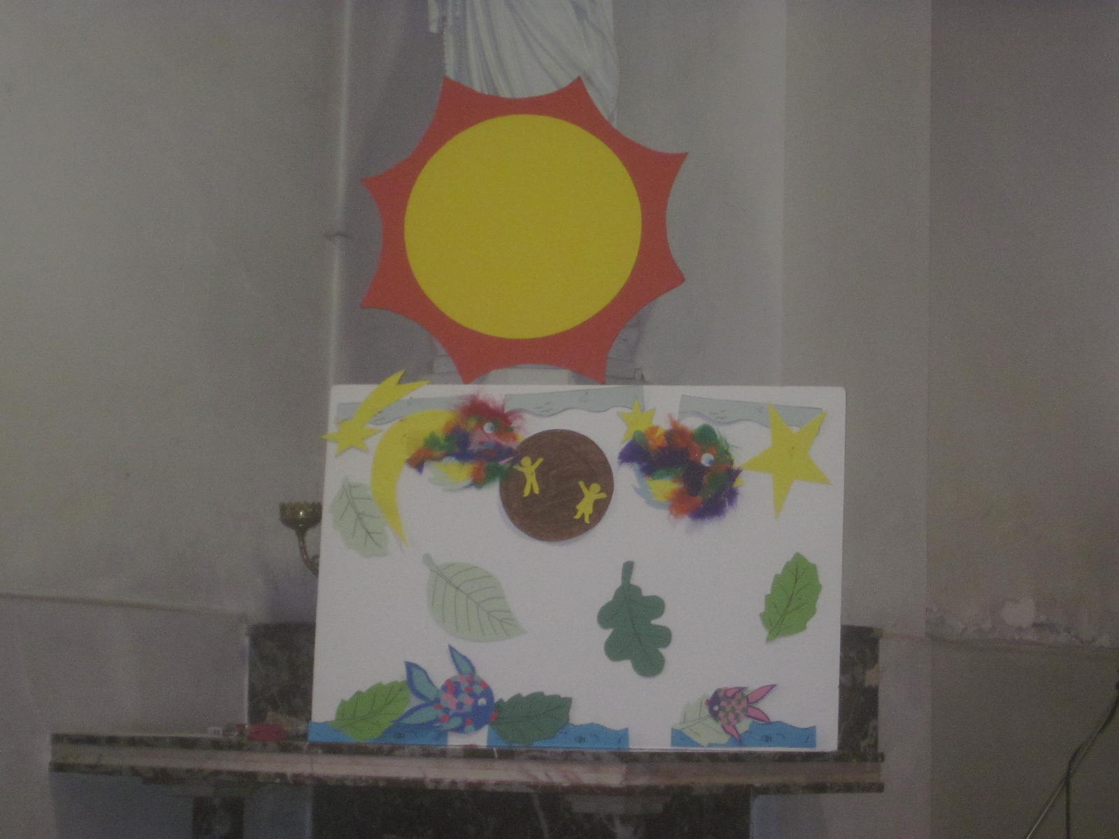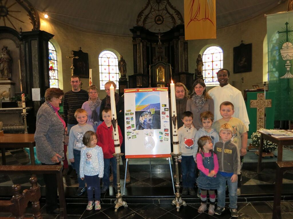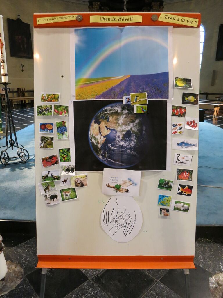 Secteur de Vresse Le samedi 14 novembre à Alle, les enfants de première primaire du Secteur Pastoral de Vresse et leurs parents étaient invités à venir commencer un parcours d’éveil à la foi en vue de la préparation à la première communion. Après une présentation des enfants, une animation sur le thème de l’arc en ciel a permis à chacun de partager sur la signification des couleurs de l’arc en ciel, dans la vie courante, et au niveau religieux. Nous avons ensuite eu une prière sur le thème de l’arc en ciel, puis une maman a lu une histoire sympa. Un petit tour au jardin nous a permis de parler de la création, notamment de la nature, qu’il est important de respecter. De là, nous avons aussi parlé de la créativité que pouvaient avoir les humains. De retour dans l’église,nous avons lu le Récit de la Création, et, au fur et à mesure les enfants apportaient des images qui représentaient les différentes étapes de la création, pour les regrouper autour d’une photo de la Terre. Ensuite, nous avons chanté le Cantique de la Création. Puis, nous nous sommes intéressés au pain : les ingrédients nécessaires, puis comment le préparer, en finissant évidemment par parler du partage du pain par Jésus. Nous avons aussi parlé des sens (le goût, l’odorat, etc…) , aidés par une mini-dégustation (de miel principalement). Une prière à suivi, puis le signe de croix. Nous avons terminé par l’écoute d’un chant : le Psaume de la Création.