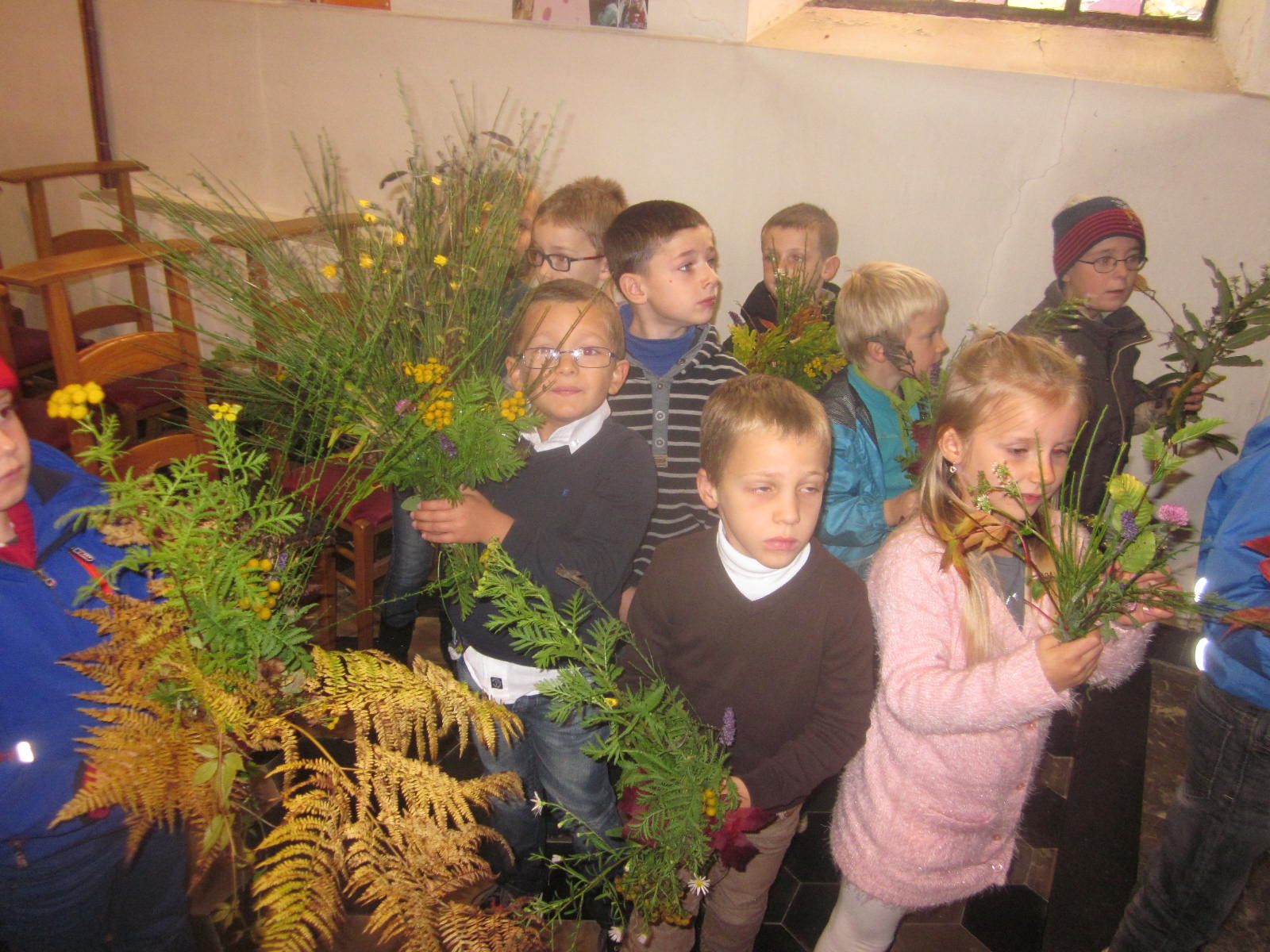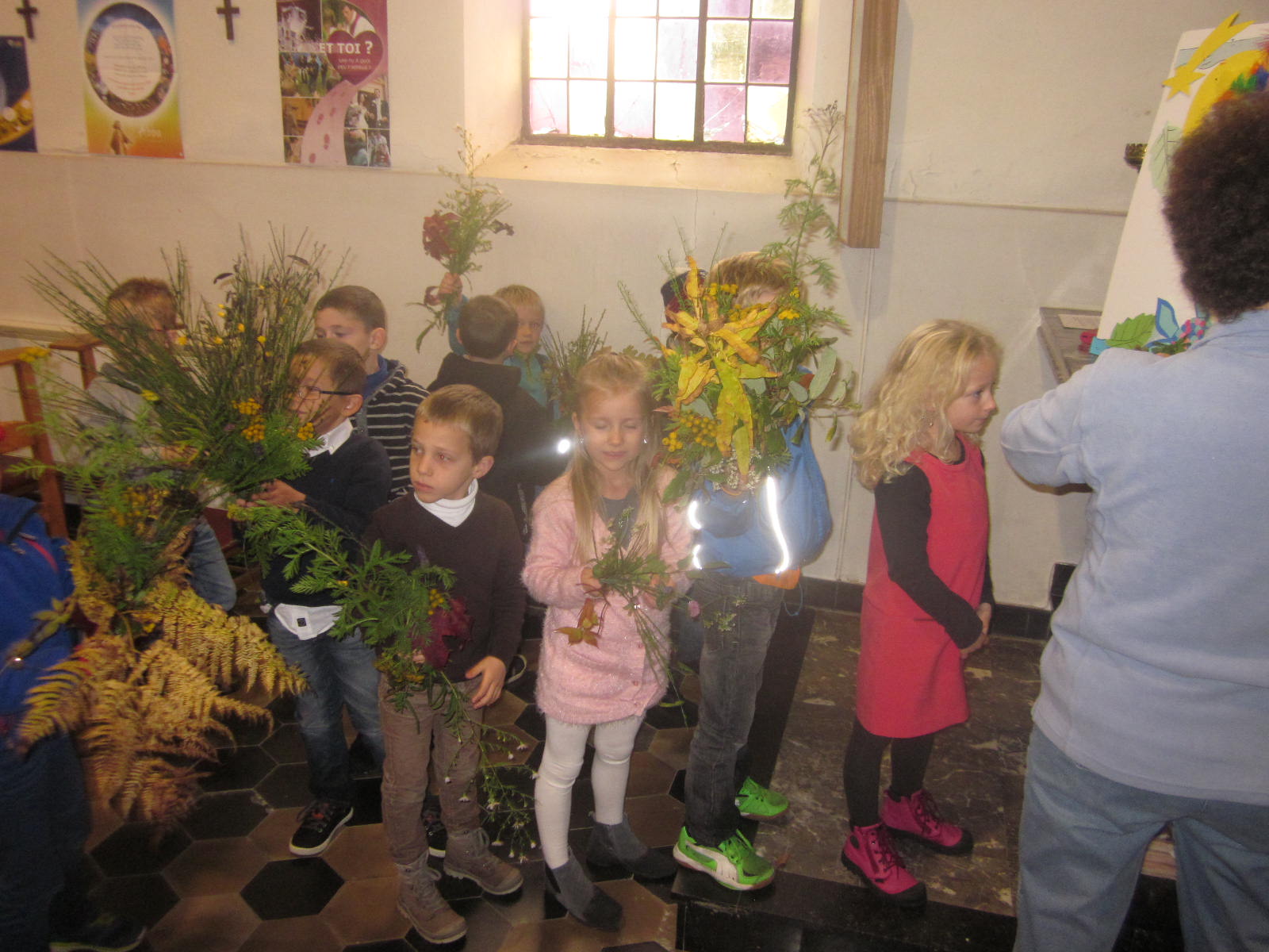 Secteur de Bièvre/Daverdisse : Douze enfants de première primaire de notre secteur, accompagnés de 5 adultes et deux animatrices, ont découvert, dans la joie et la bonne humeur, le nouveau parcours d’éveil à la foi à la chapelle de la Gare de Graide ce dimanche 18 octobre. Le premier chemin s’appelle « l’éveil à la vie ». Au programme de cette matinée : accueil et présentation – prière de l’arc-en-ciel – promenade à la découverte de la création (photo en haut à gauche) et confection d’un bouquet champêtre à reprendre à la maison (photos en bas à gauche et à droite) – récit de la Création (Genèse 1,1-2,4) adapté et animé (photo du panneau complet en haut à droite) – jeu de mimes et cris des animaux. A la fin de cette heure et demie, les enfants ont partagé un petit temps d’action de grâce à Dieu pour la Création si belle et l’abbé Dussart a béni (souhaité du bien – le meilleur pour eux) les enfants. Pour clôturer cette belle matinée, un apéritif partagé a réuni parents, grands parents, enfants, prêtre et animatrices !
