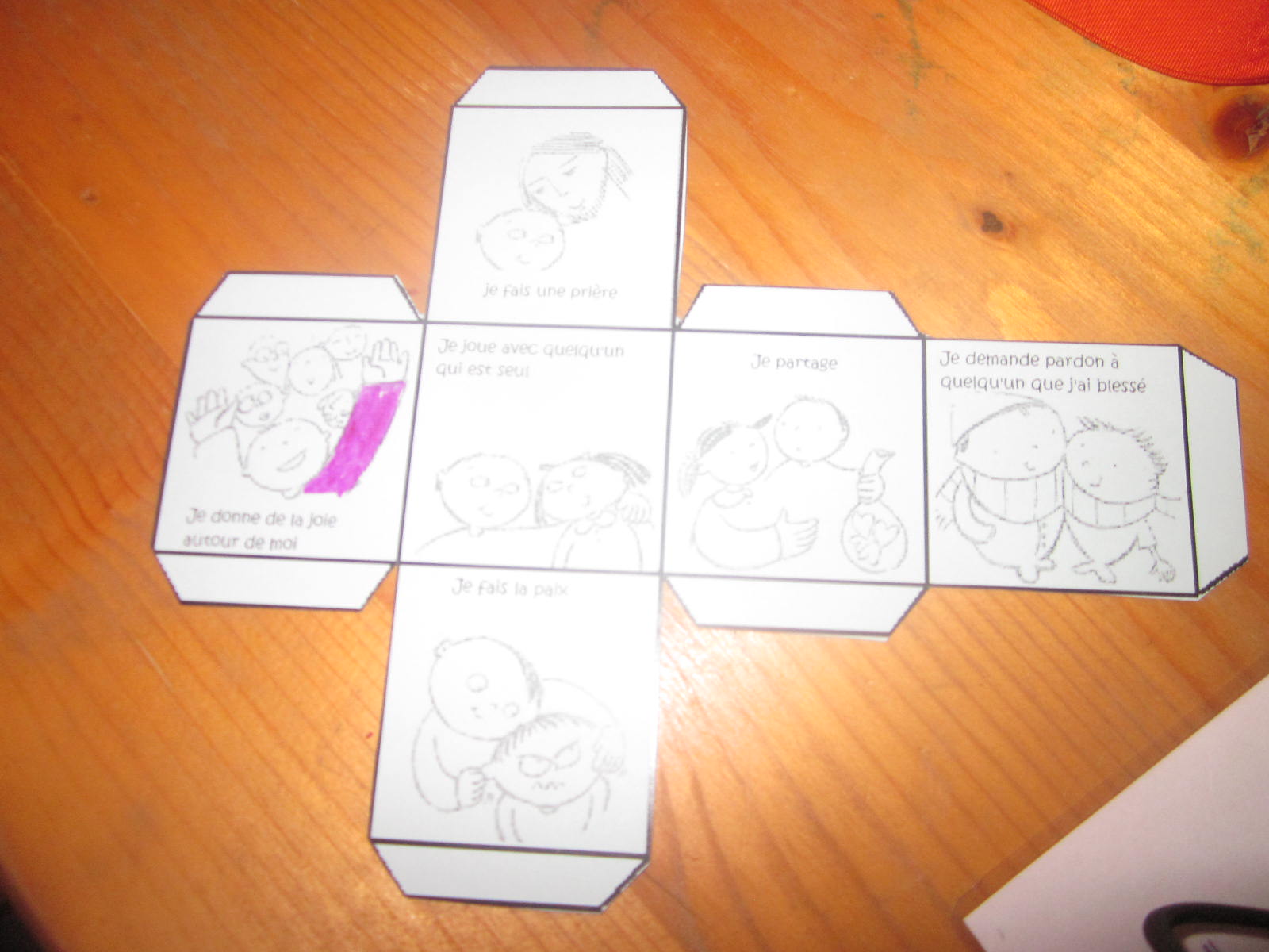 C’est sous le signe de la prière que les 8 enfants « en chemin » et 5 parents se sont retrouvés à la deuxième réunion « Chemins d’Eveil », animée par Godelieve et Casmir. Au menu du jour, des explications et mise en pratique de ce que sont la prière et le silence, ainsi que le signe de croix. Une demande aux enfants : aménager un petit coin prière chez eux. Un petit triptyque à découper leur est donné , ainsi qu’un dé à coller, avec sur chacune de ses faces, une bonne action à faire. La fois passée, je m’émerveillais de la spontanéité et de l’énergie des enfants pour répondre aux questions. Je suis d’autant plus épaté par leur capacité à faire silence quand il le faut 🙂 La rencontre s’est terminée par une petite collation, pour laquelle les parents avaient apporté des biscuits et même du gâteau fait maison.