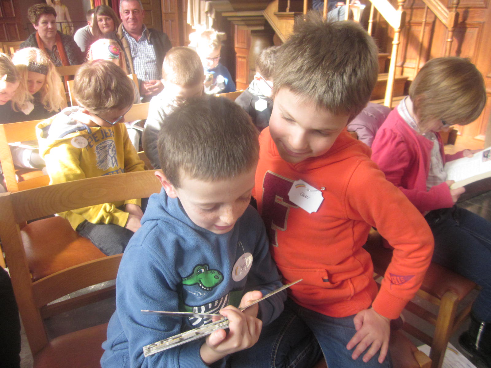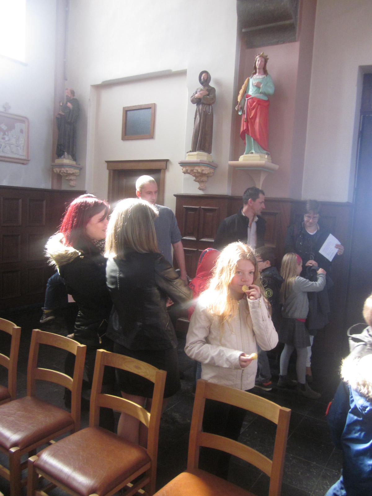 Pour clôturer de façon ludique la matinée, les enfants ont de nouveau été répartis en deux groupes et ils devaient chercher l' »objet » dont le nom leur était donné oralement (tabernacle, lampe du Saint Sacrement, Statue de Saint Fursy, Cierge pascal, choeur, autel, etc…) en rapport avec ce dont on avait parlé à la rencontre précédente.