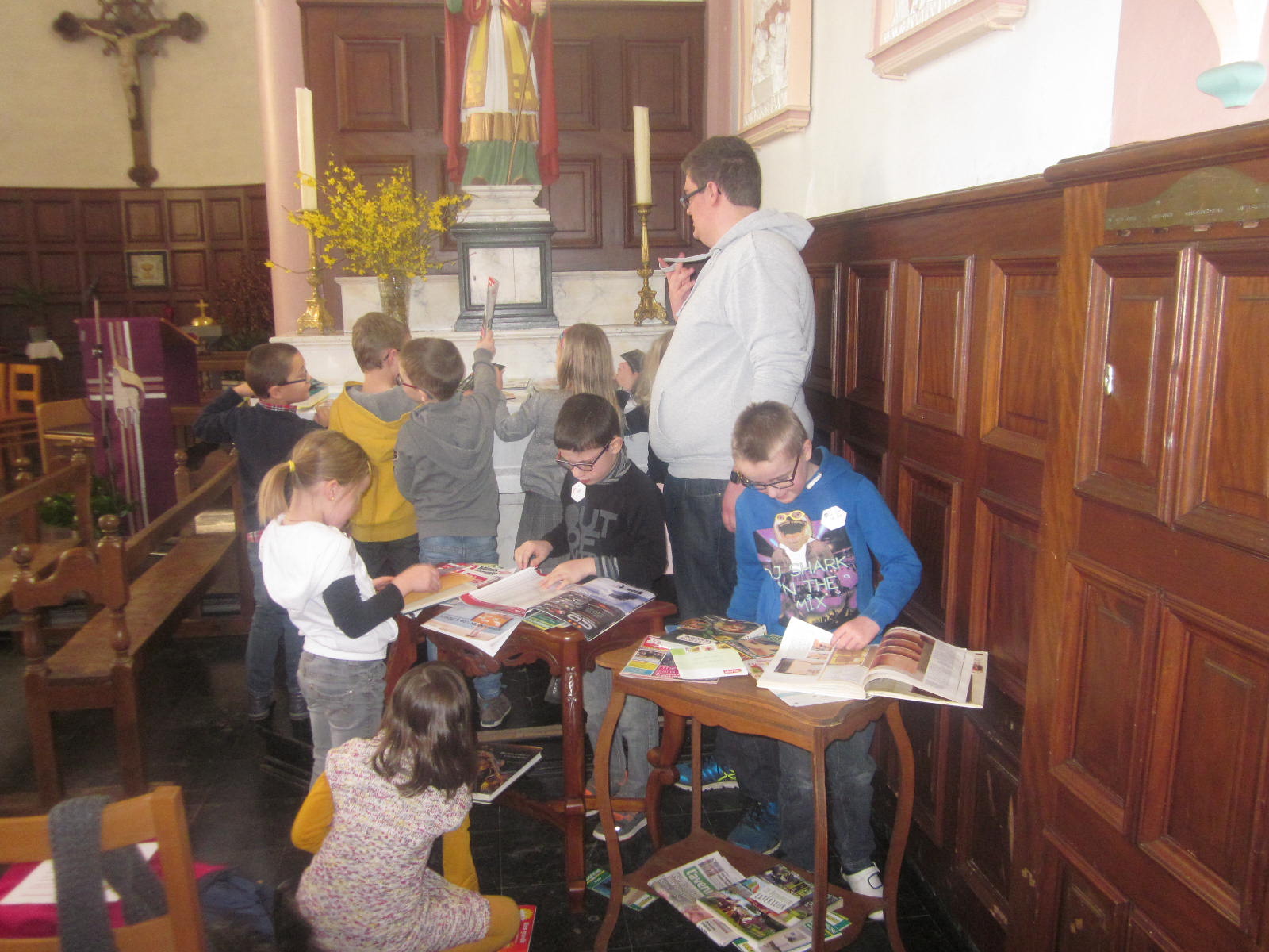 Les enfants ont tout d’abord tracé sur eux le signe de croix et écouté la prière de l’arc-en-ciel. Ils ont appris le refrain d’un « Alléluia », avec Cathy à l’orgue. En deux groupes, ils ont été mis en contact avec toutes sortes de livres, qu’ils ont dû classer (recettes de cuisine, journaux, modes d’emploi, BD, livres d’enfants, de bricolages, de sport, programmes TV, etc…). Des livres religieux ont été mis à leur disposition : bibles pour enfants, livres de caté, Nouveau Testament illustré, Bible, le lectionnaire et le missel(les « livres de curé » comme un garçon les a justement appelés) etc…
