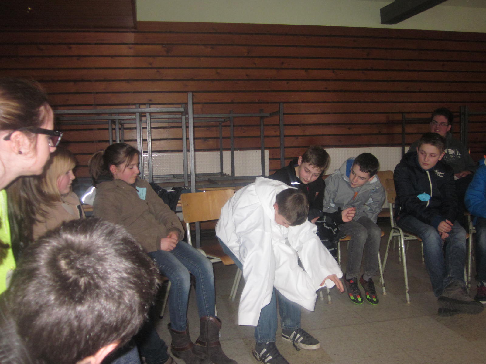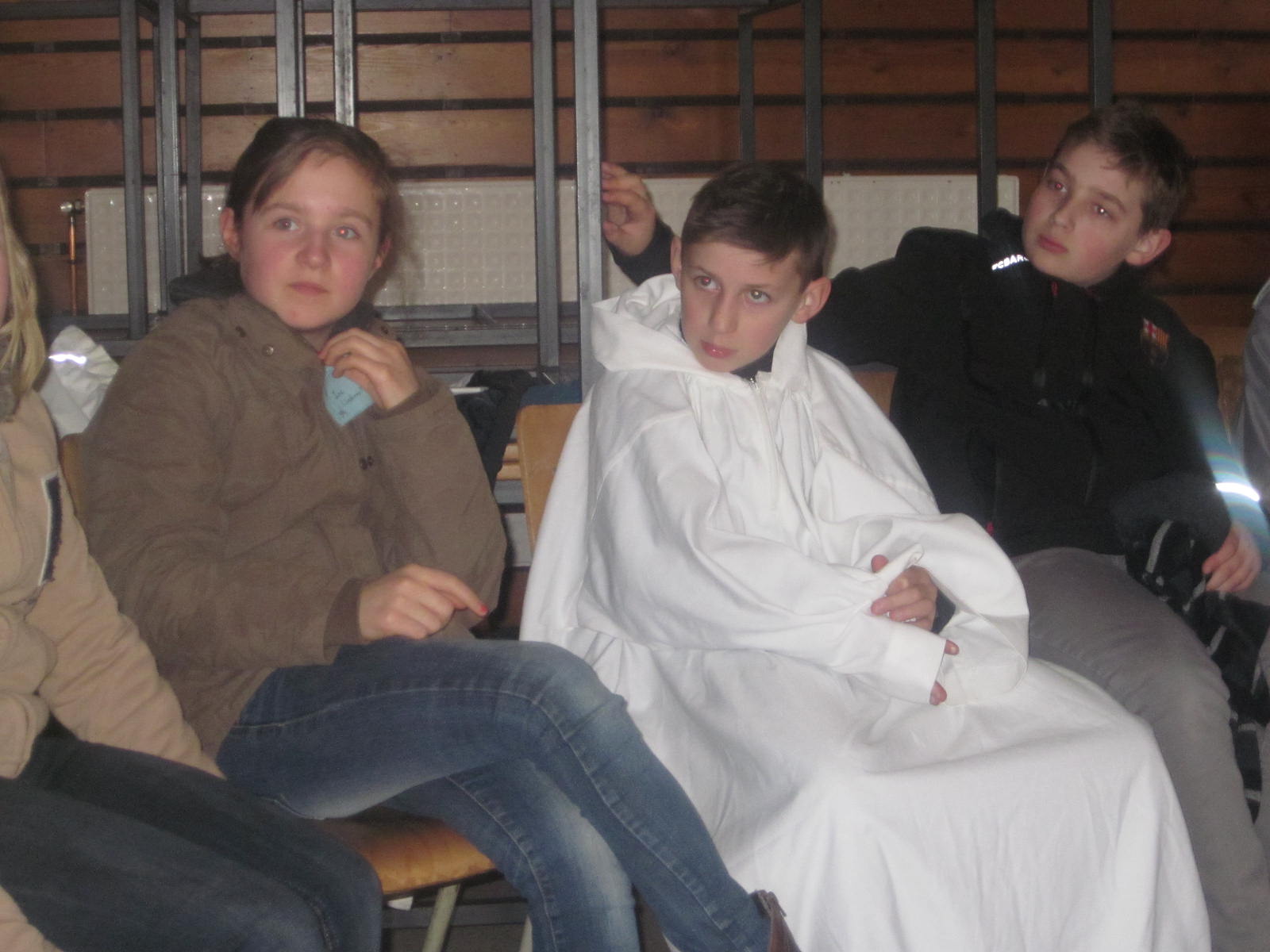 Photos de haut en bas et de gauche à droite : Présentation de Santiago – Jeu de coopération/chasse au trésor (avec le clown qui vient semer la zizanie dans les groupes) – Atelier « croix » avec Marc – Atelier « aube » avec Ophélie et Mélanie – (dur, dur d’enfiler une aube … eh non, elle ne s’enfile pas par la manche… MDR espérons que ce jeune éprouvera moins de difficultés le jour de sa profession de foi ! ;-)) – atelier lumière avec dépôt de petites bougies.