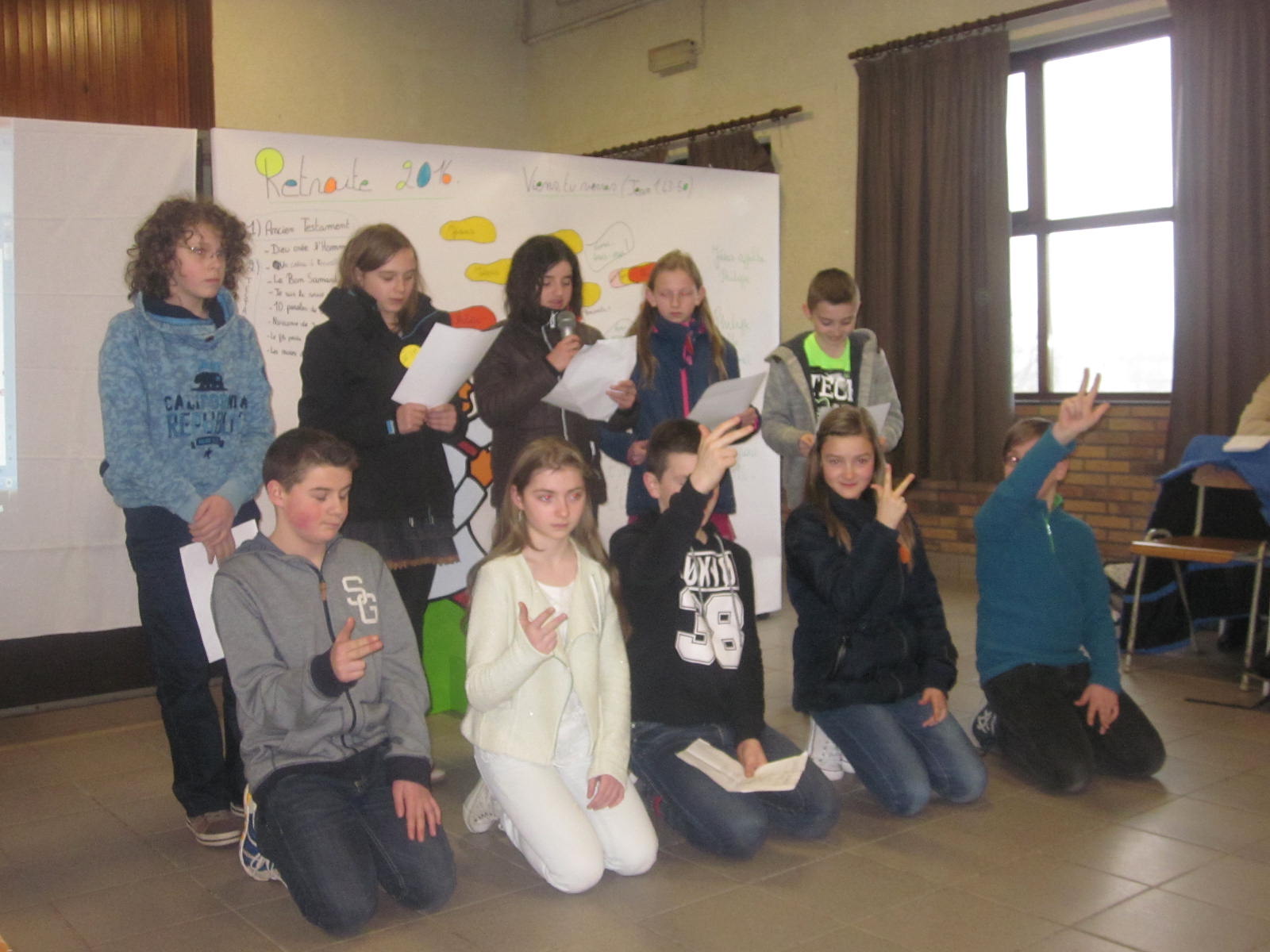 Ensuite, les enfants ont écrit leur phrase de profession de foi (celles qu’ils liront lors de leur fête) sur base de tous les choix opérés (objets, témoins, phrases des textes bibliques). Pour clôturer la retraite, une eucharistie au patro en présence des familles a été célébrée par l’abbé Anastas, en présence de quelques prêtres du doyenné, une Eucharistie très calme et recueillie et dans laquelle les enfants ont beaucoup participé. Un chant final rythmé et chorégraphié par des jeunes animateurs « Et tu m’appelles à te suivre » (Méthode Nathanaël – Tu m’appelles) s’est terminé par une « chenille » dans la salle de bal du patro.