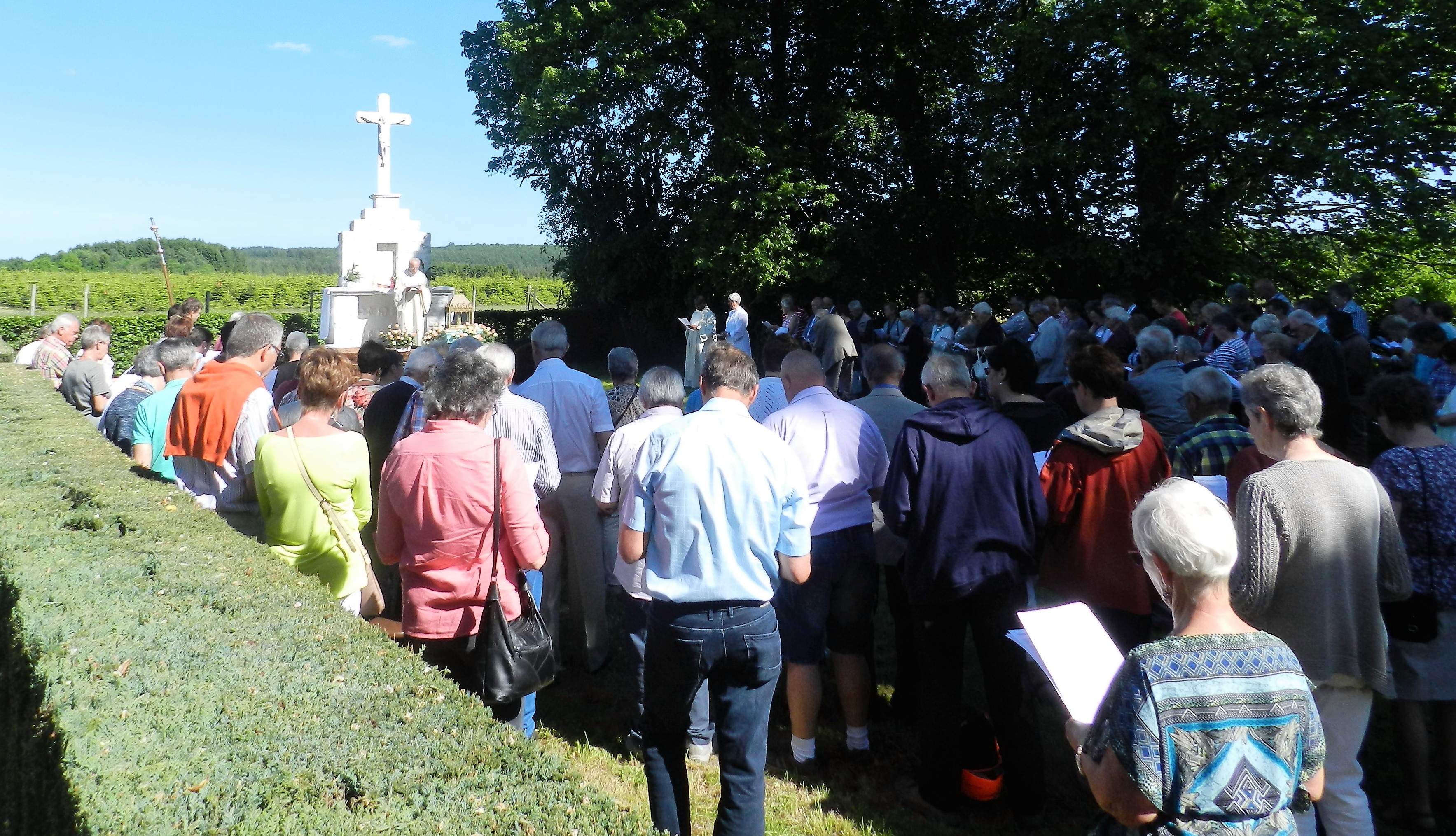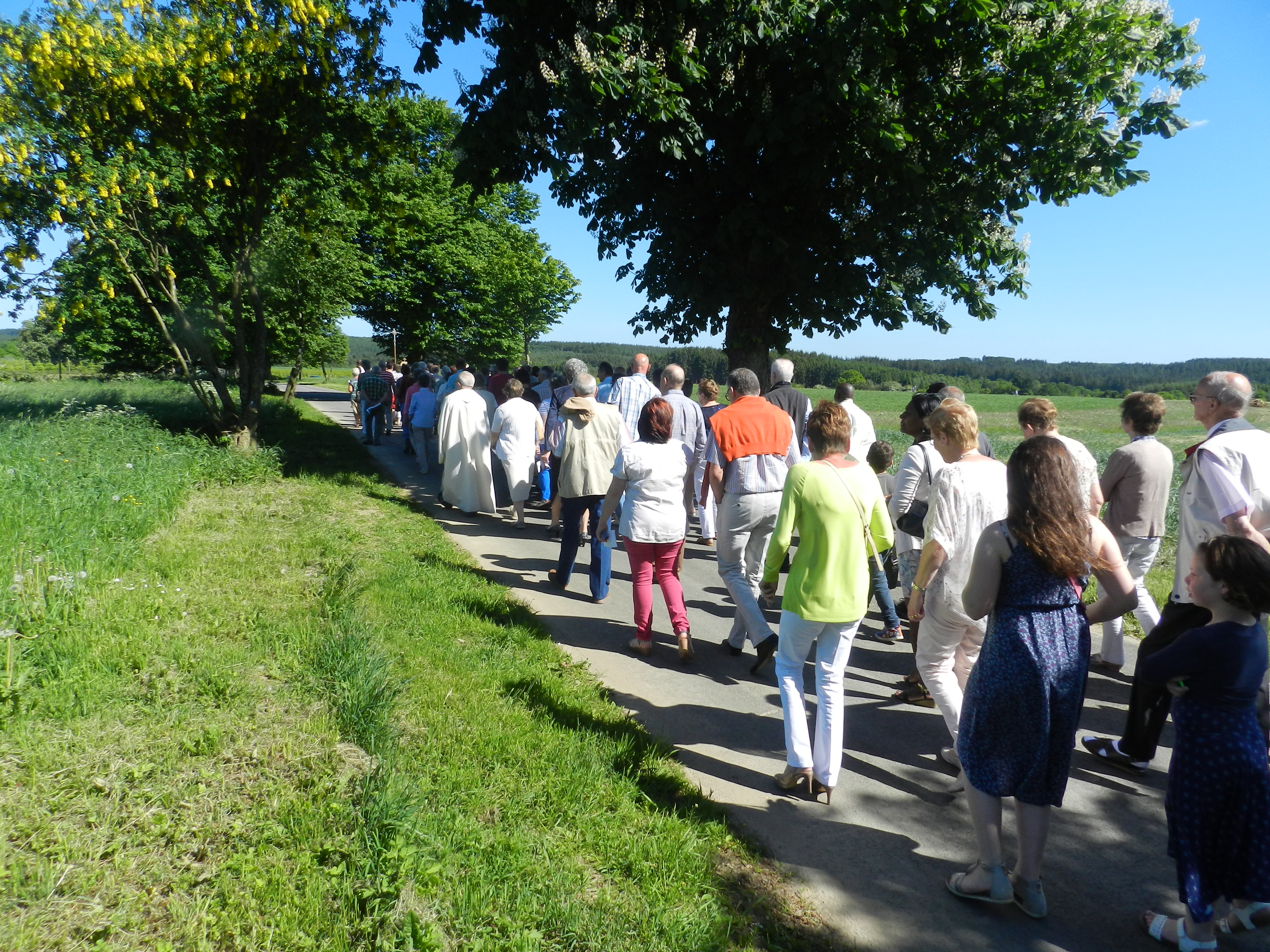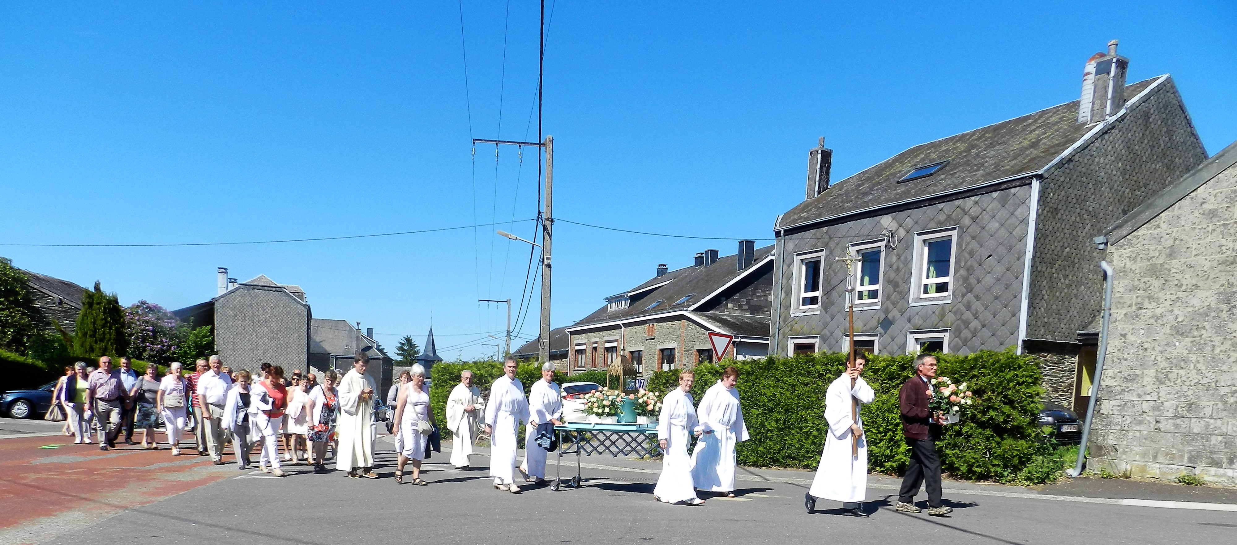 Ce jeudi 25 mai, fête de l’Ascension, j’ai participé à la messe à l’église de Oizy suivie par le pèlerinage à la chapelle Notre Dame de Oizy. Le prédicateur était le Père Tommy Scholtès. Venant de la capitale, il arrivait juste à l’heure mais avec un grand trou dans l’estomac… 😉 Une des dames de la chorale lui donne un petit peu de nourriture en en avant la musique… Une trentaine de choristes de la chorale interparoissiale de Bièvre était présent avec son chef de chœur Catherine Zeler et l’organiste Jean-Marie Delobbe. Le pèlerinage s’est déroulé ensuite sous un soleil de plomb… Un apéritif convivial a clôturé cette belle après-midi ! Comme chaque année, Yvonne a organisé toute la journée, a garni l’église de belles fleurs etc… Merci Yvonne, grâce à toi nous avons ici dans le grand Bièvre une procession, une tradition… Je viens des Pays-Bas et j’avais 5 ans lorsque j’ai participé à un pèlerinage là-bas !