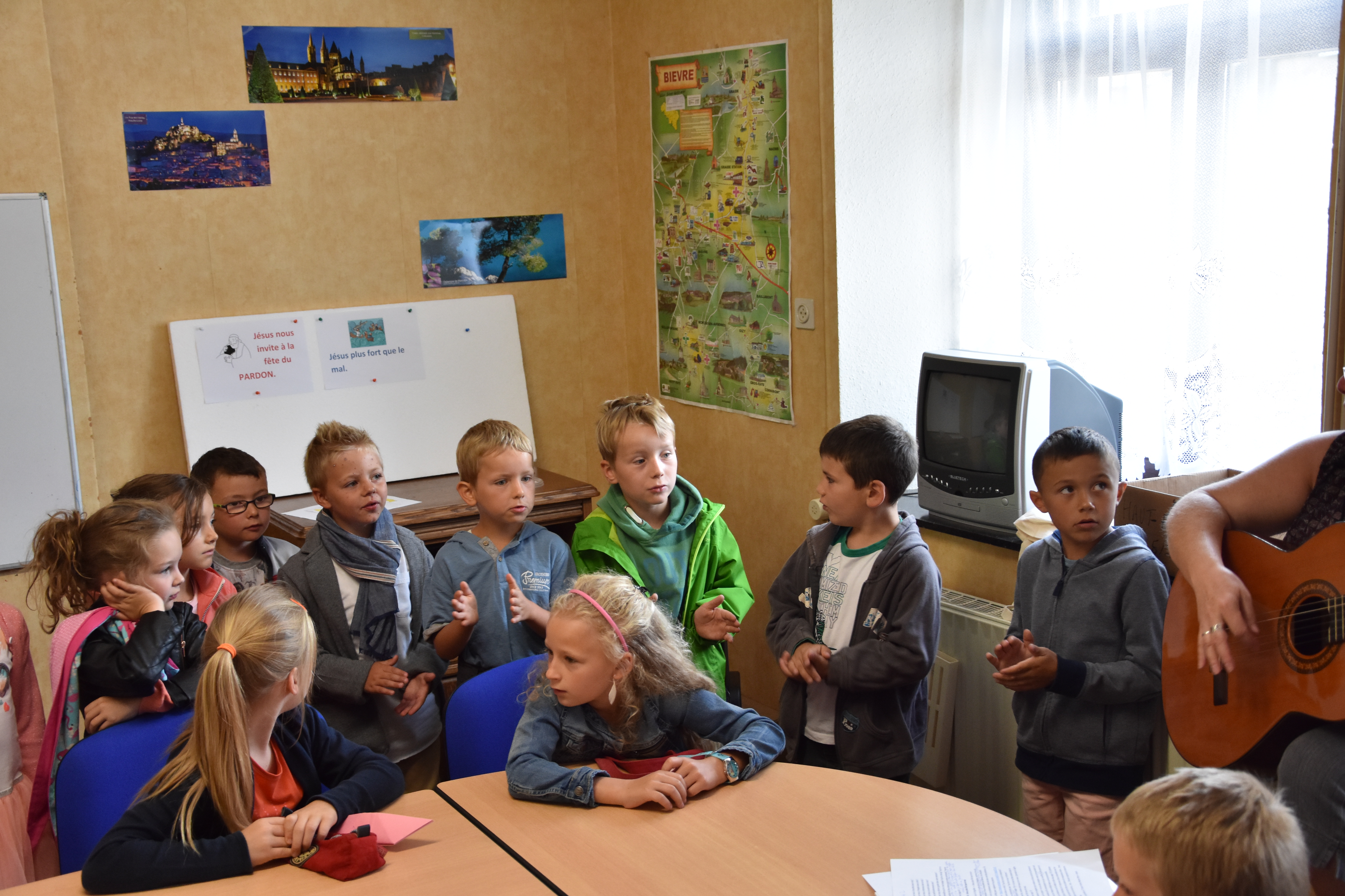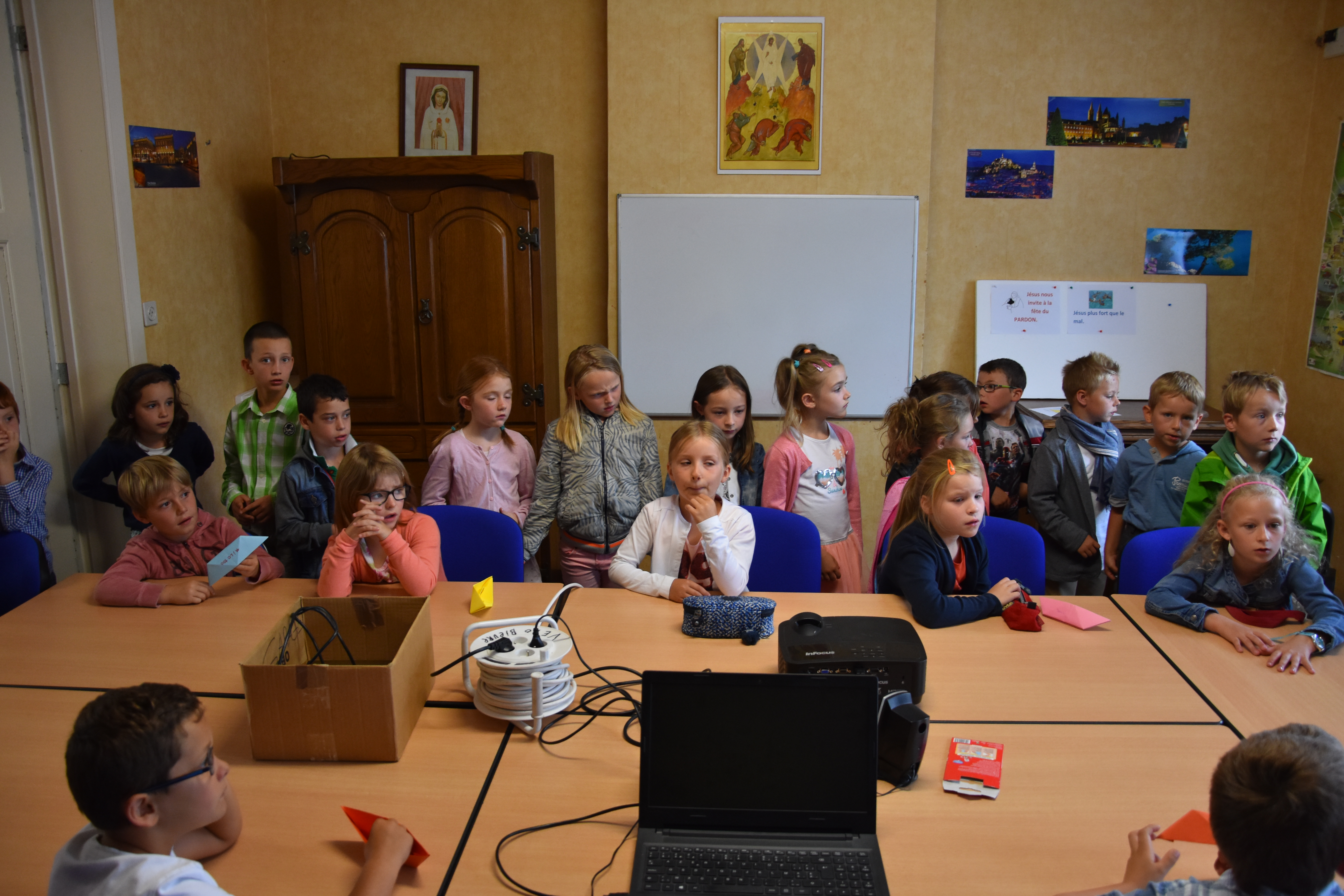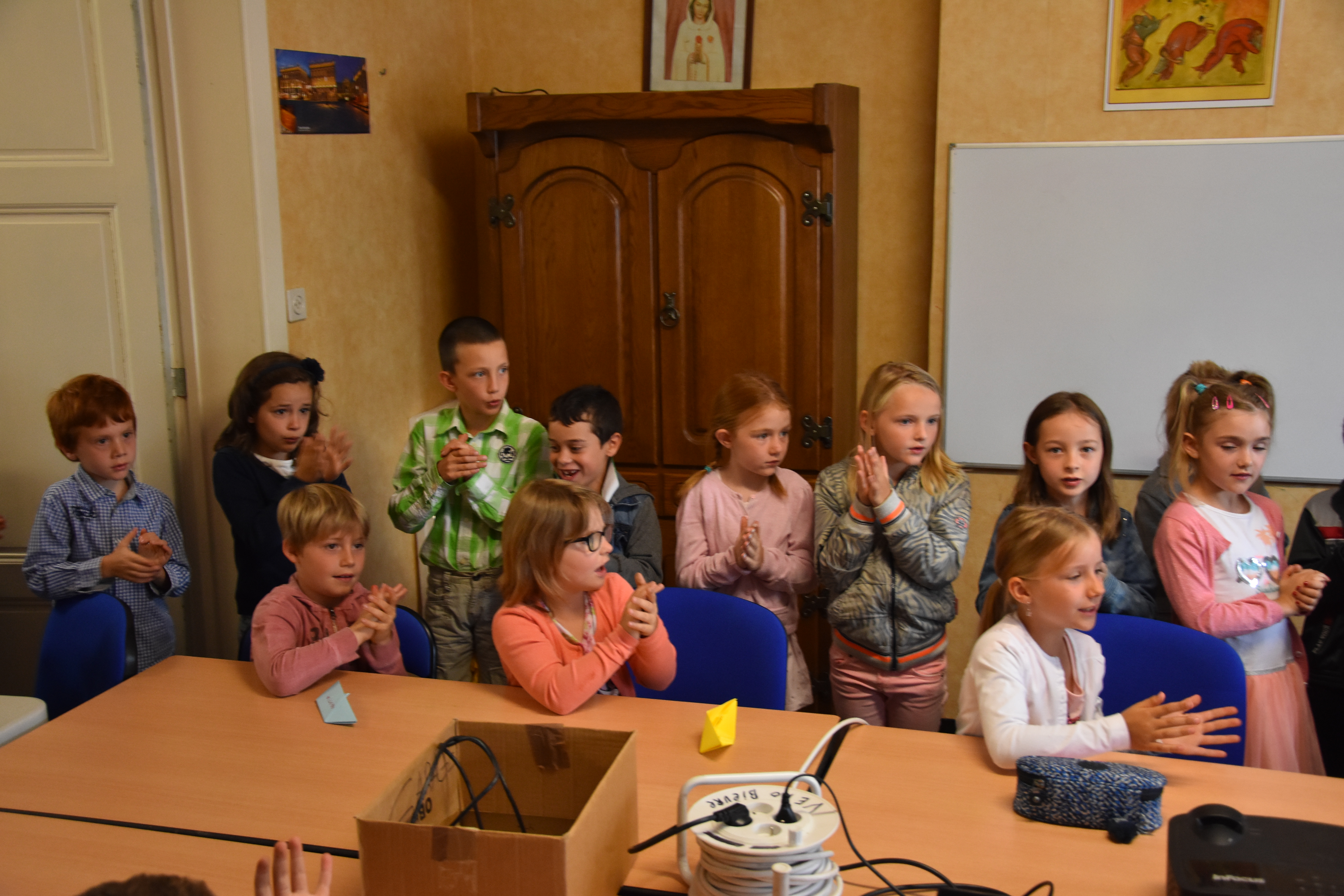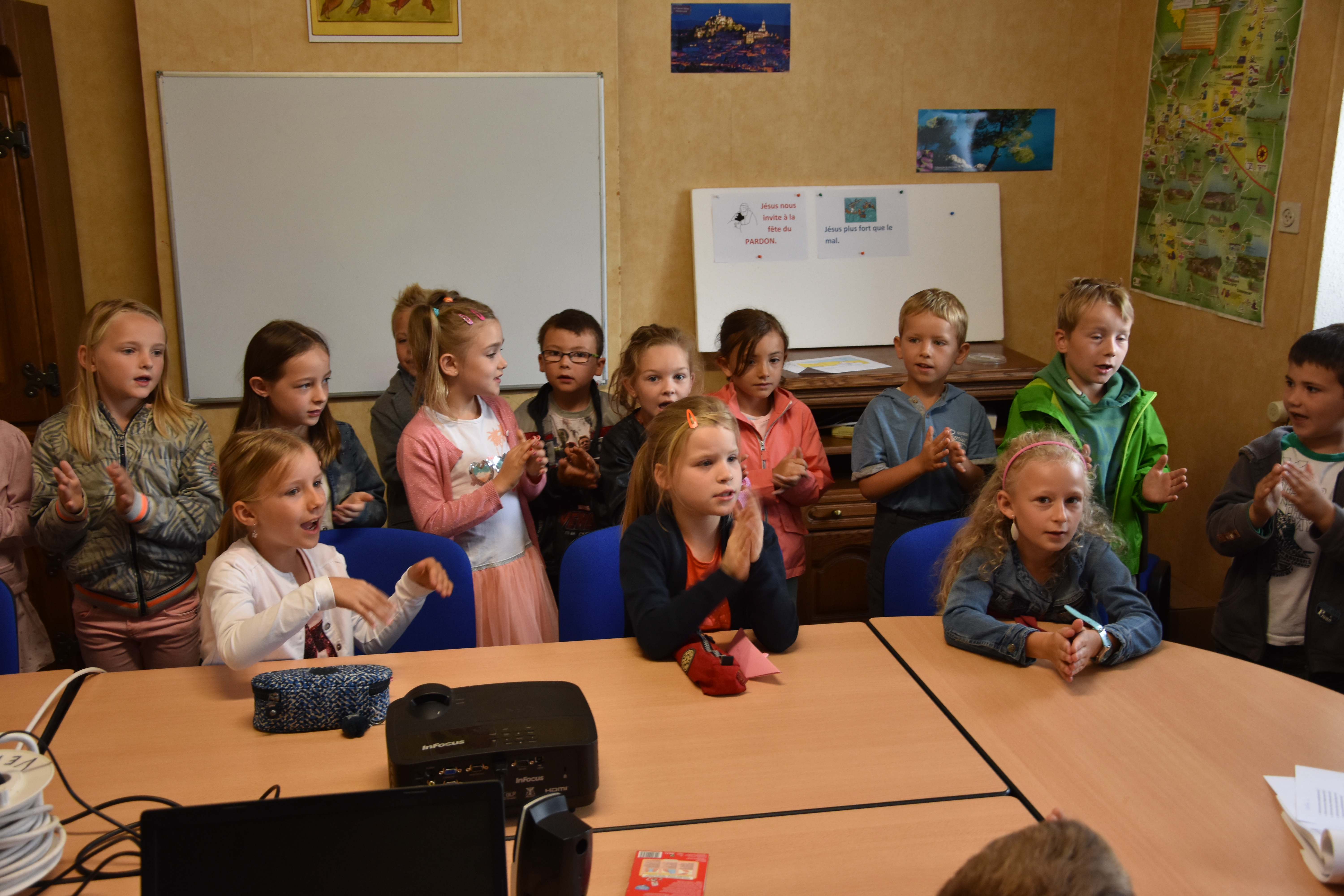Tout d’abord, chaque groupe a vécu la rencontre proprement dite : les 1ères ont dit bonjour à Jésus, fait le signe de croix, écouté l’évangile du Bon Berger et bricolé un mouton. Les deuxièmes ont mieux compris l’évangile du Père miséricordieux et de la tempête apaisée ; ils ont écrit sur un bateau en papier quelque chose dont ils avaient peur ou qui leur faisait mal et le nom d’une personne malade qu’ils connaissent.