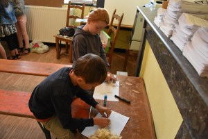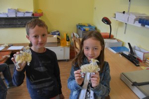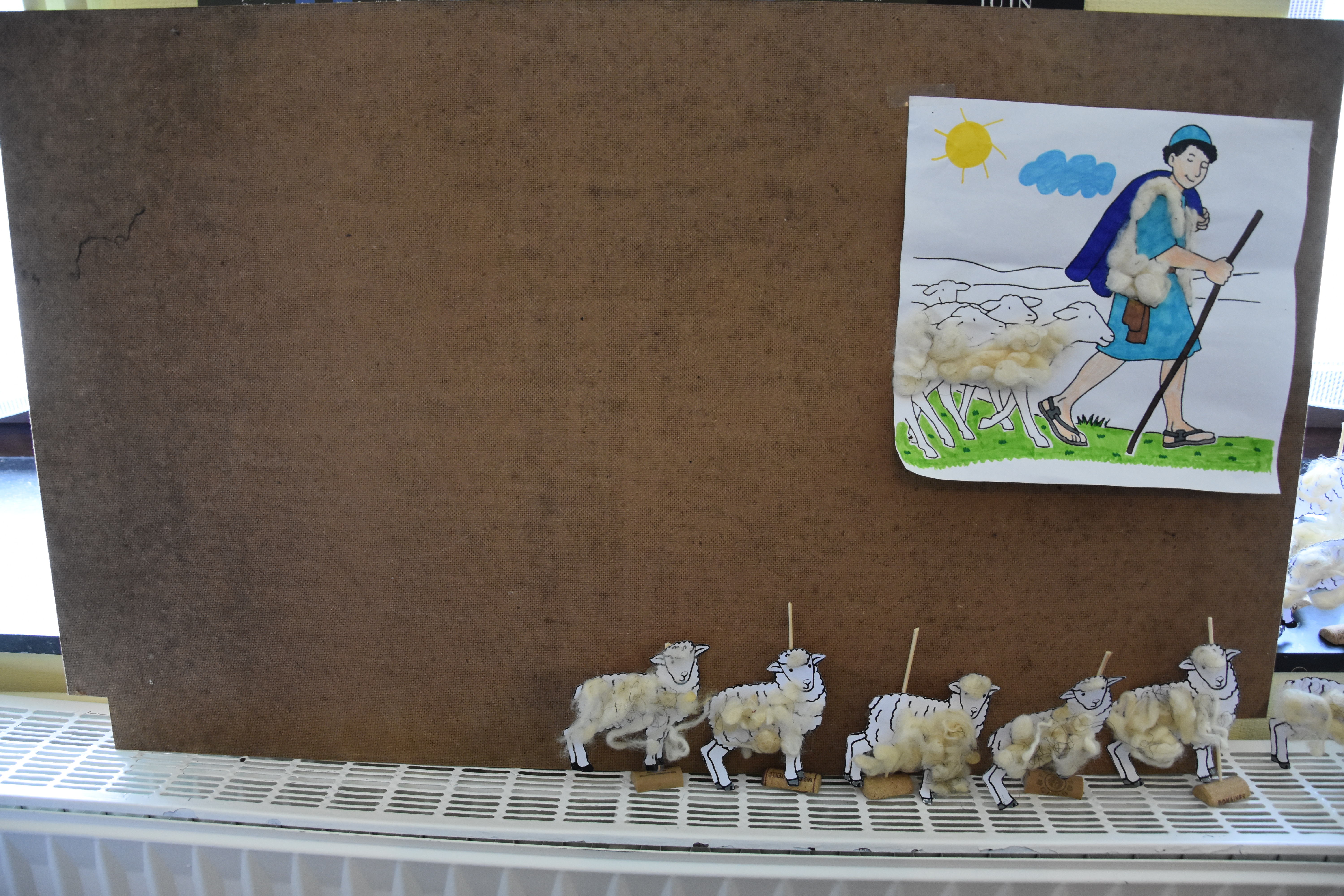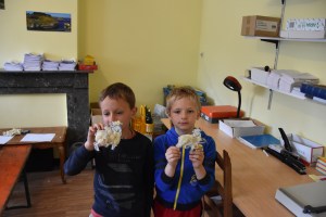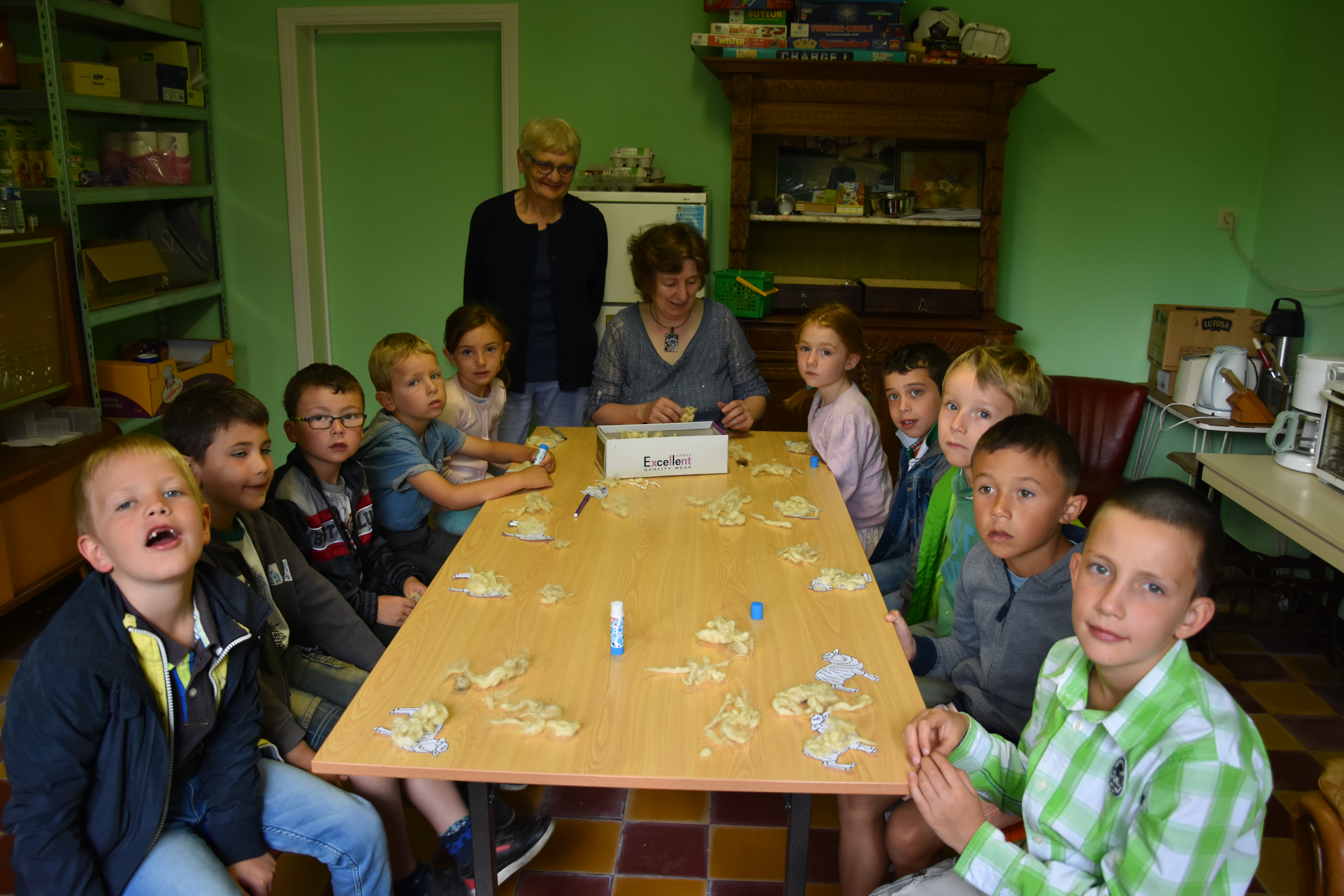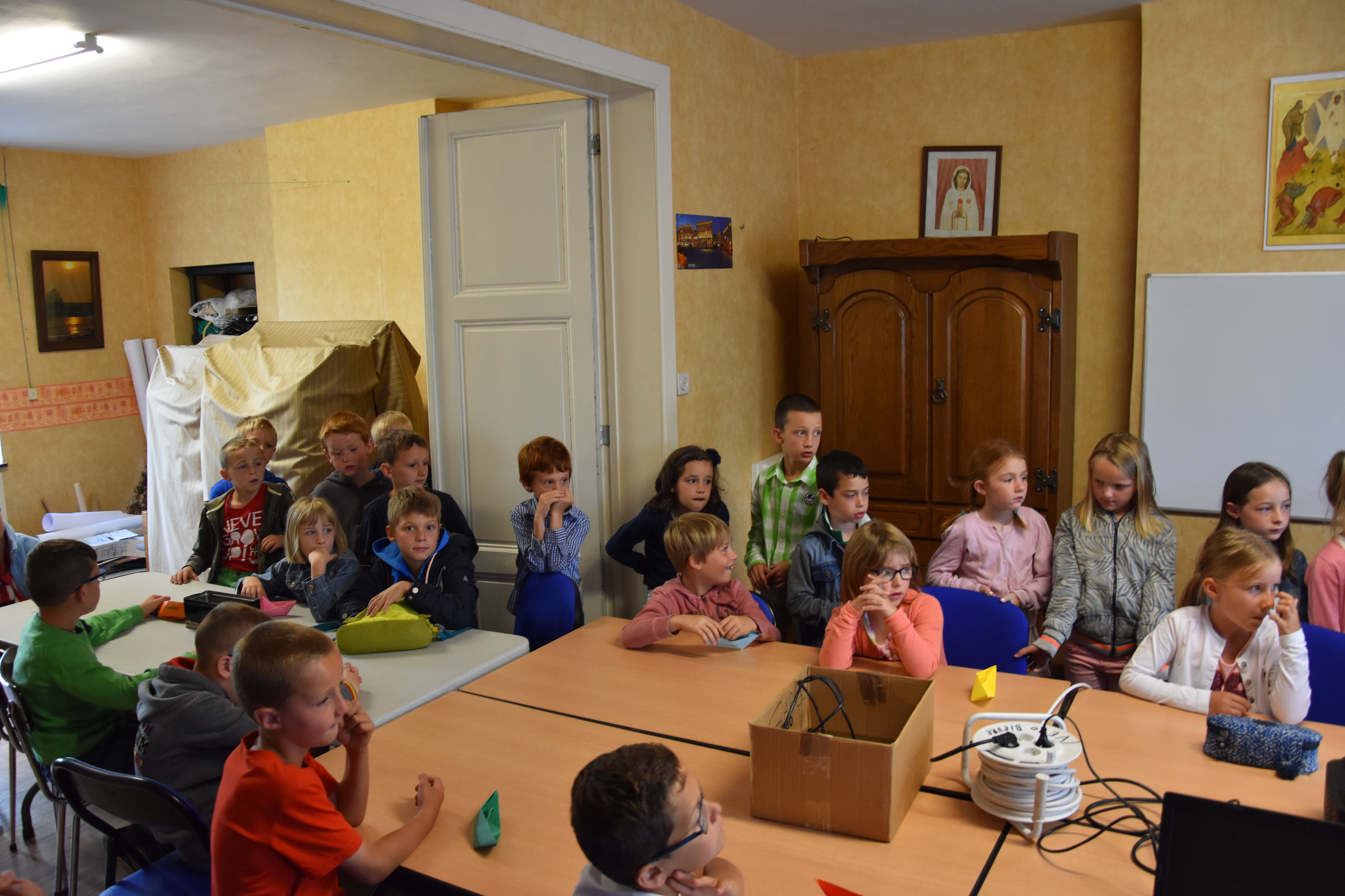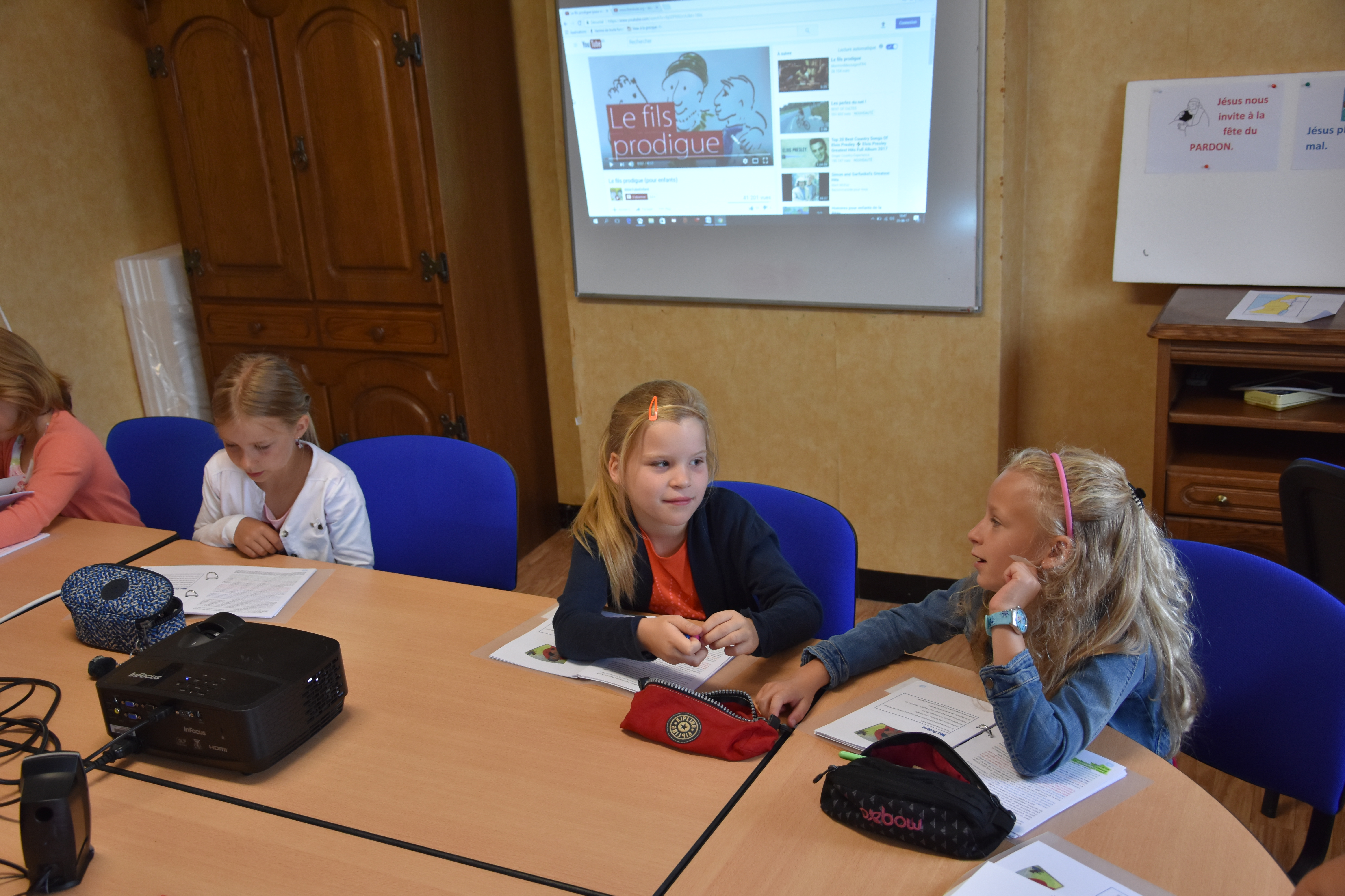 Tout d’abord, chaque groupe a vécu la rencontre proprement dite : les 1ères ont dit bonjour à Jésus, fait le signe de croix, écouté l’évangile du Bon Berger et bricolé un mouton. Les deuxièmes ont mieux compris l’évangile du Père miséricordieux et de la tempête apaisée ; ils ont écrit sur un bateau en papier quelque chose dont ils avaient peur ou qui leur faisait mal et le nom d’une personne malade qu’ils connaissent.