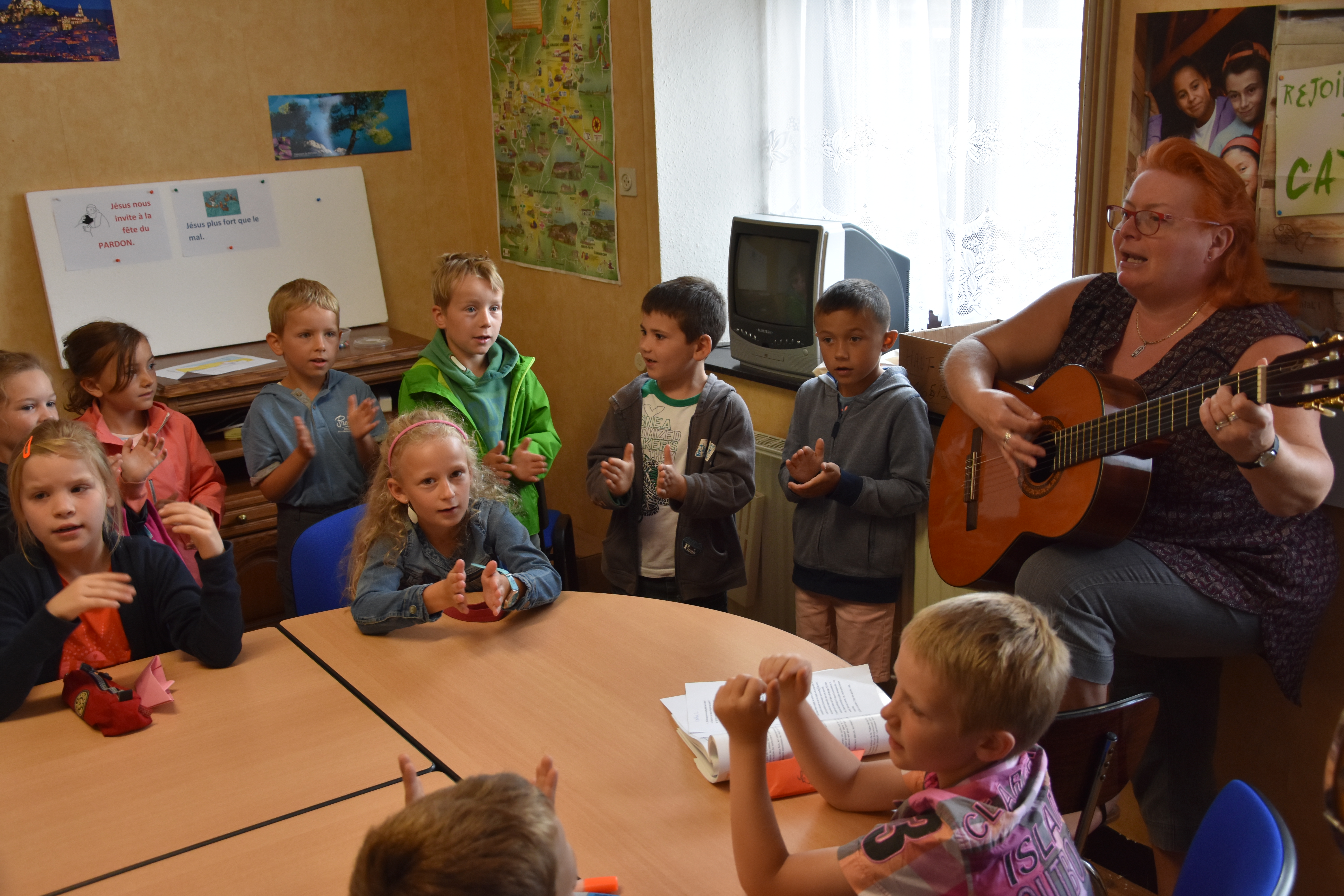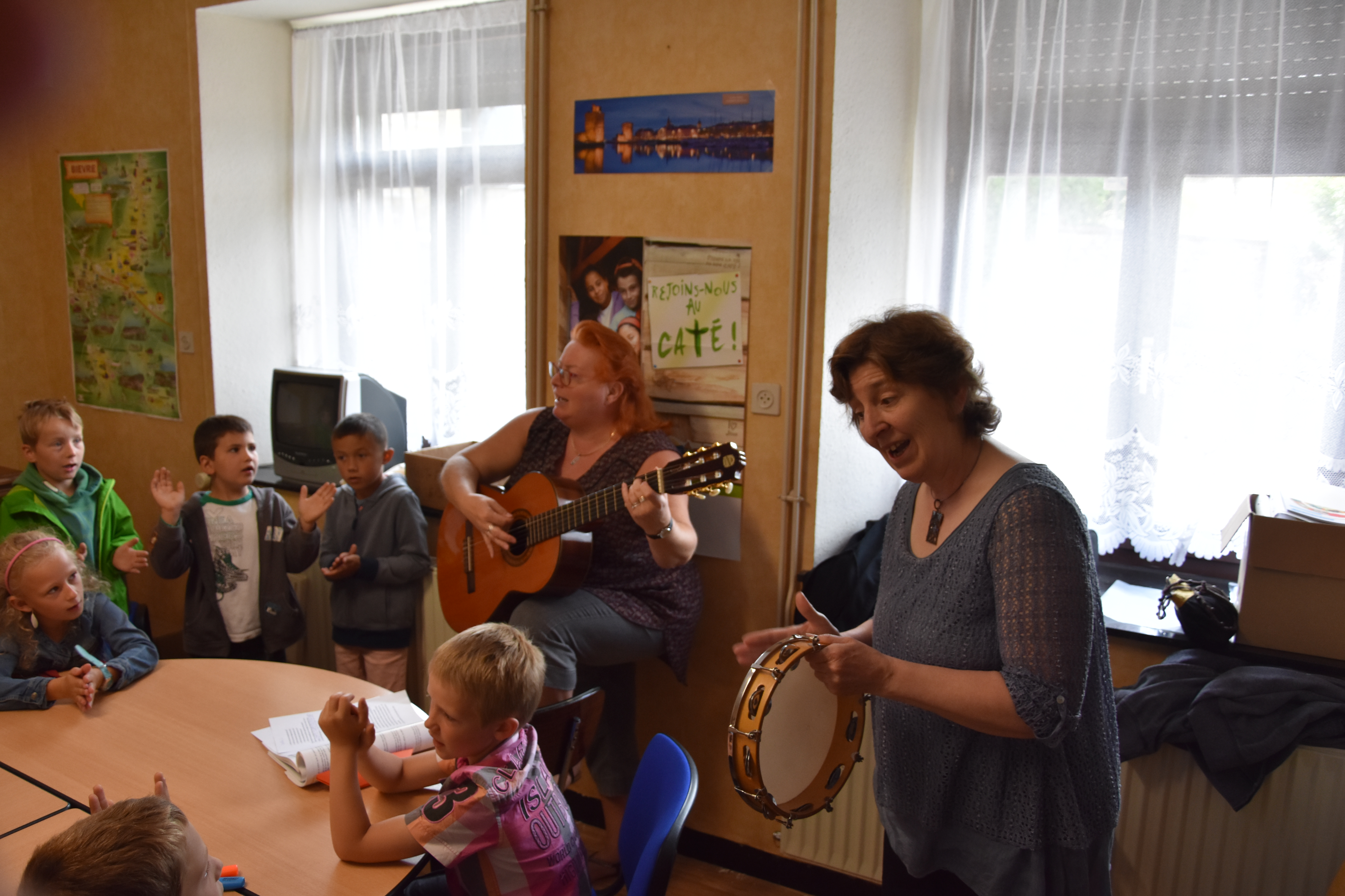 Comme d’habitude, dix minutes avant la fin, tout le monde s’est réuni pour chanter un « Alléluia » cette fois-ci avec Cathy à la guitare et Marie-Claire au tambourin et mimé le Notre Père dans la cour.