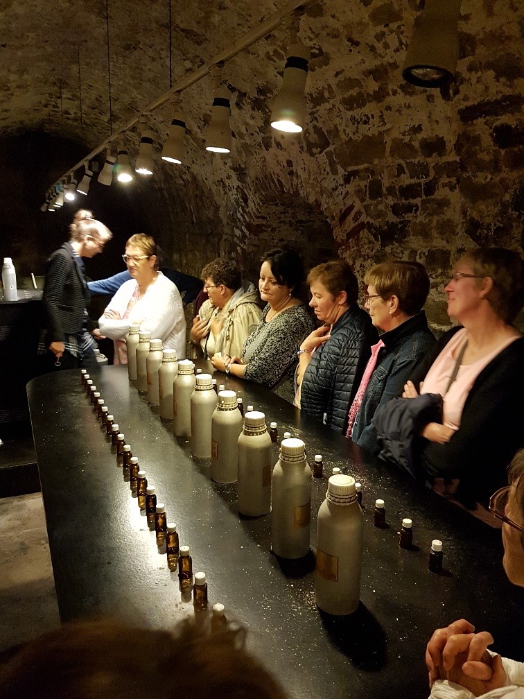 Ce samedi 26 août, une bonne vingtaine de membres de la chorale inter-paroissiale Saint Hubert de Bièvre ont vécu une journée d’excursion. Au programme de la matinée : la visite guidée de la parfumerie Guy Delforge à Namur. Nous avons découvert un vrai travail d’excellence et avons essuyé d’un revers de la main beaucoup de préjugés que nous avions sur les parfums et la façon de les utiliser. Il faut attendre parfois jusqu’à 15 minutes pour sentir la note de coeur d’un parfum, celle qui reste le plus longtemps, la note de tête étant plus volatile… Le parfum se met à une certaine distance et sur les vêtements (pas sur le corps sauf derrière les oreilles). Il faut aussi veiller à une bonne conservation du flacon toujours dans son emballage d’origine attention à la lumière et au soleil… et donc, ne pas le laisser dans la salle de bain ! Nous avons aussi pû découvrir tous les parfums Guy Delforge et en acquérir si on le souhaitait. Voici le lien vers le site officiel de la parfumerie.