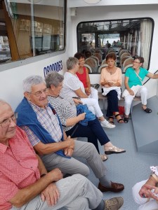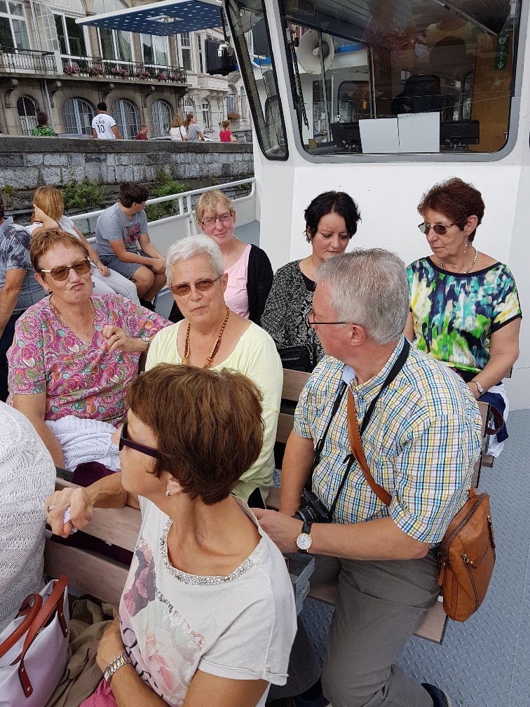 Après le repas de midi, nous avons navigué sur la Meuse jusque Freyr. Quel plaisir d’admirer cette magnifique nature, de saluer de la main un couple à leur réception de mariage et de frémir en observant des alpinistes en pleine action et tout cela, avec des commentaires expliquant les différents sites visibles !