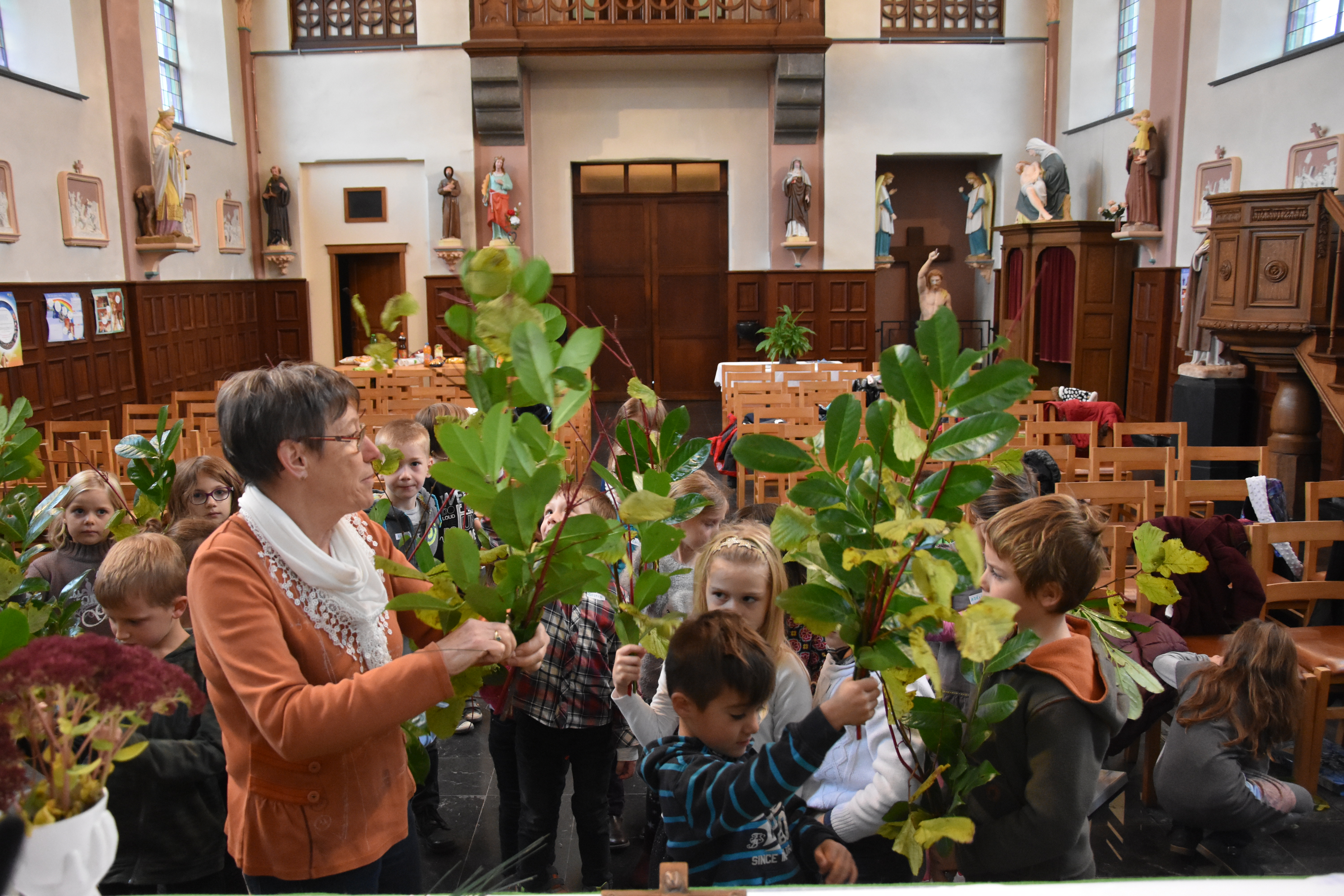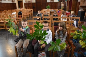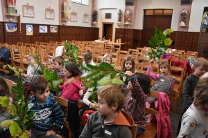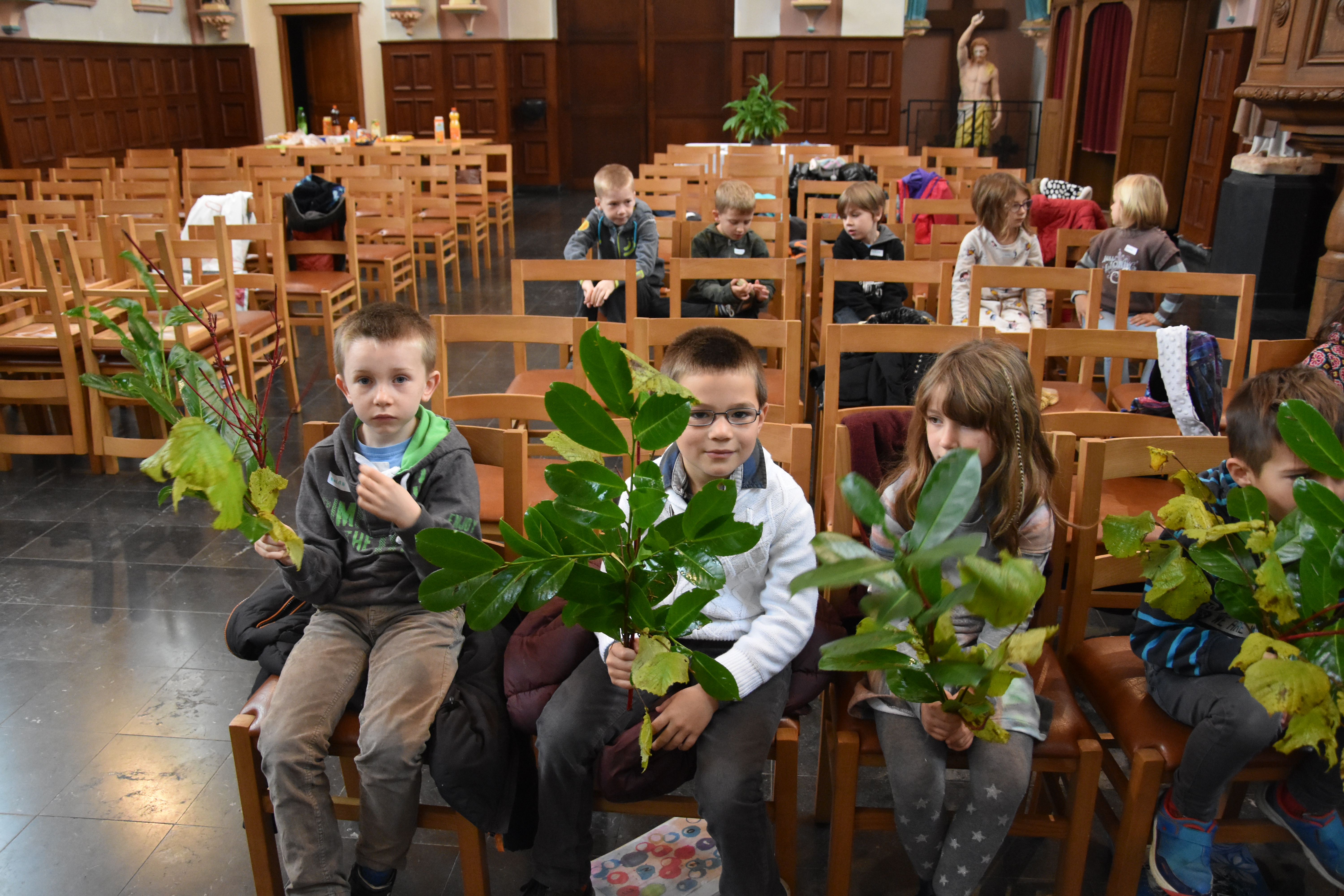 Nous avons fait une ronde ; chaque enfant et chaque adulte a cité à tour de rôle son prénom et son lieu de résidence. Ensuite, nous avons écouté tous ensemble la prière de l’arc-en-ciel et nous la lirons d’ailleurs lors de chaque rencontre. Le thème de la 1ère rencontre est l’éveil à la vie. En principe, celle-ci prévoyait une promenade à la découverte de la nature et la confection d’un bouquet automnal. Mais, les conditions météorologiques n’étaient pas du tout favorables pour mettre le bout du nez dehors… 😦 Qu’à cela ne tienne, Agnès, la mamy d’un enfant de 1ère, a apporté différentes branches d’arbres (merci pour la leçon de botanique) et les enfants ont confectionné leur bouquet dans l’église pour ensuite, le rapporter à la maison !