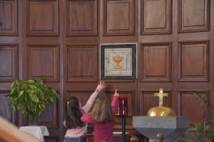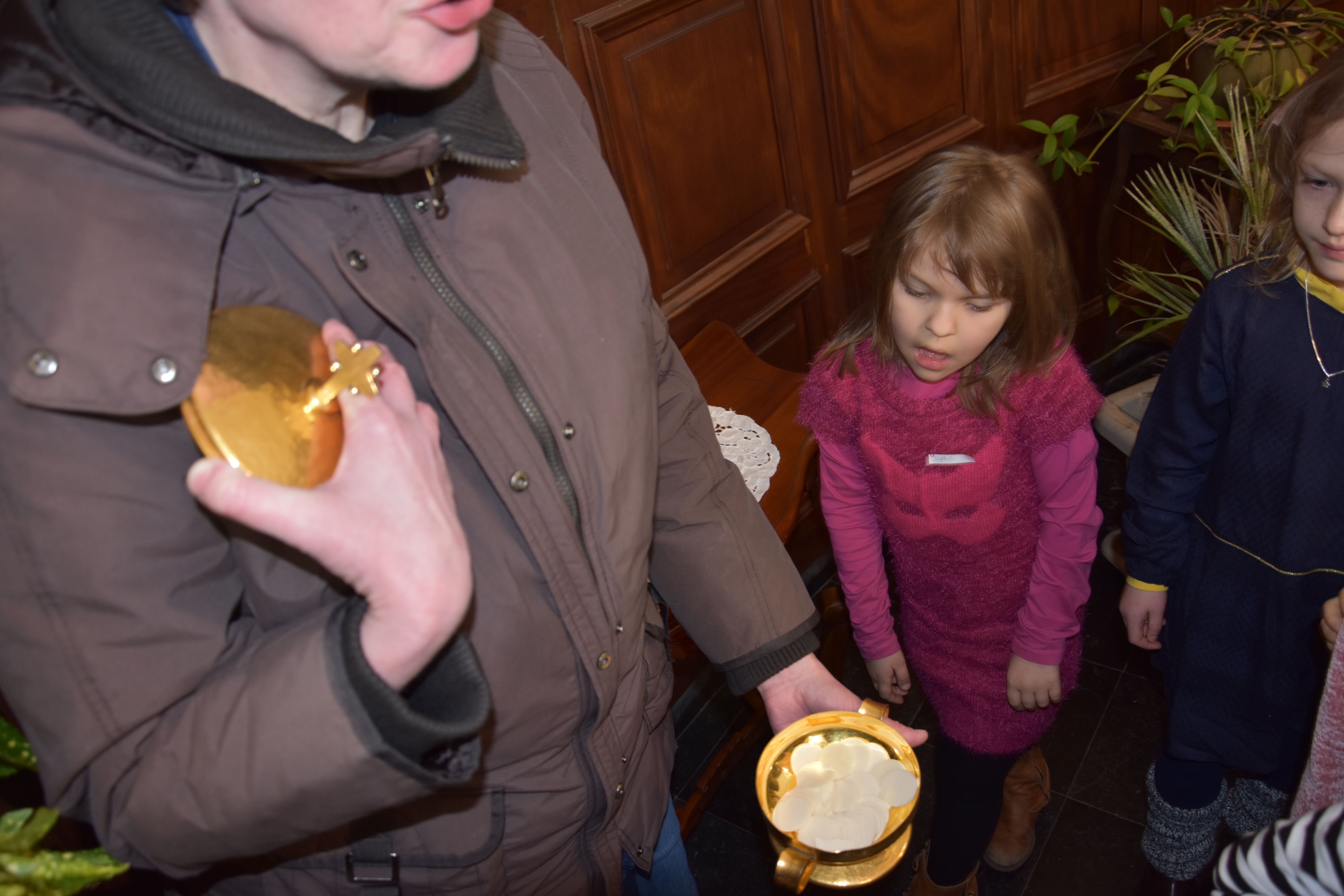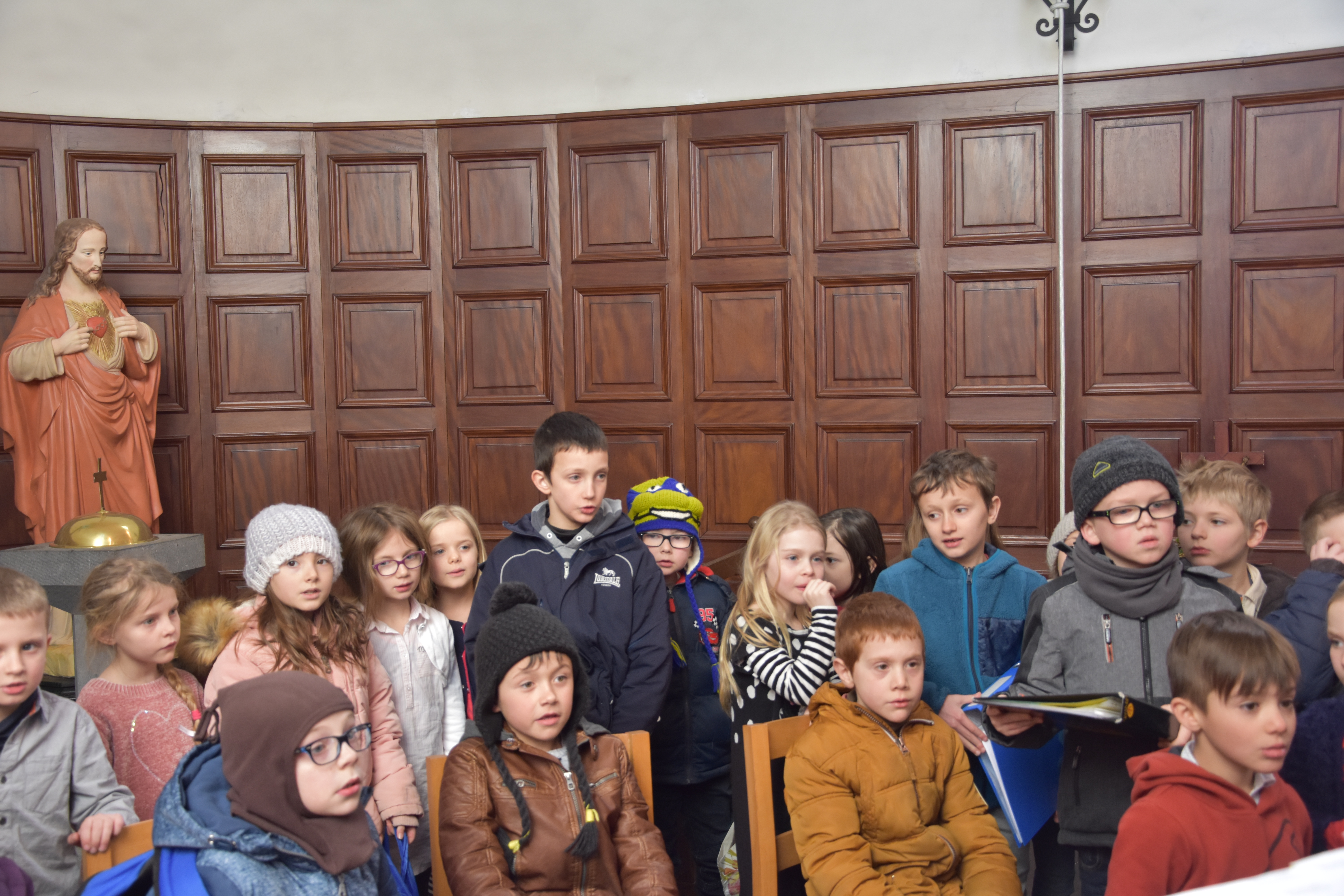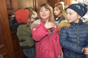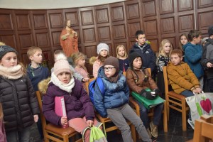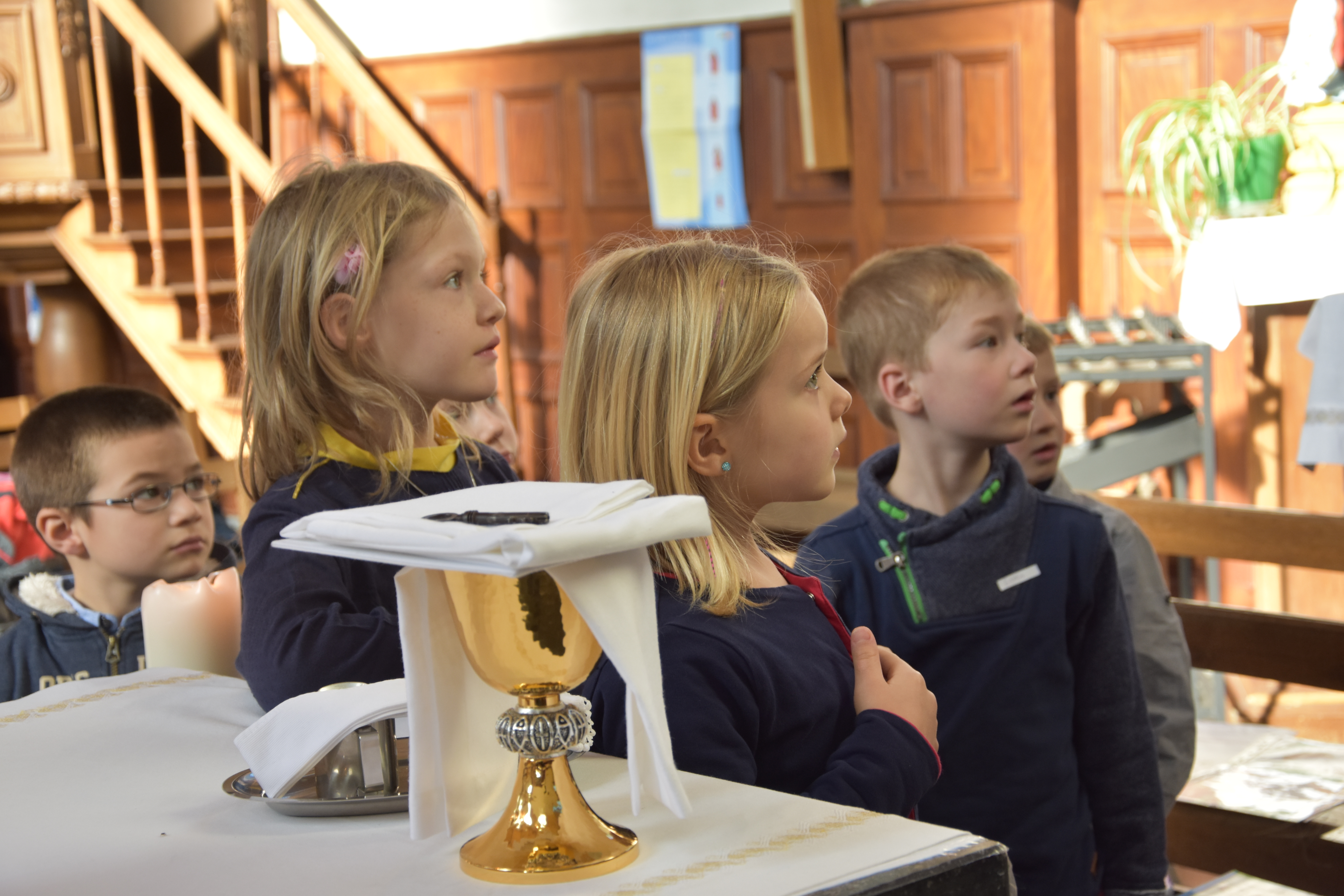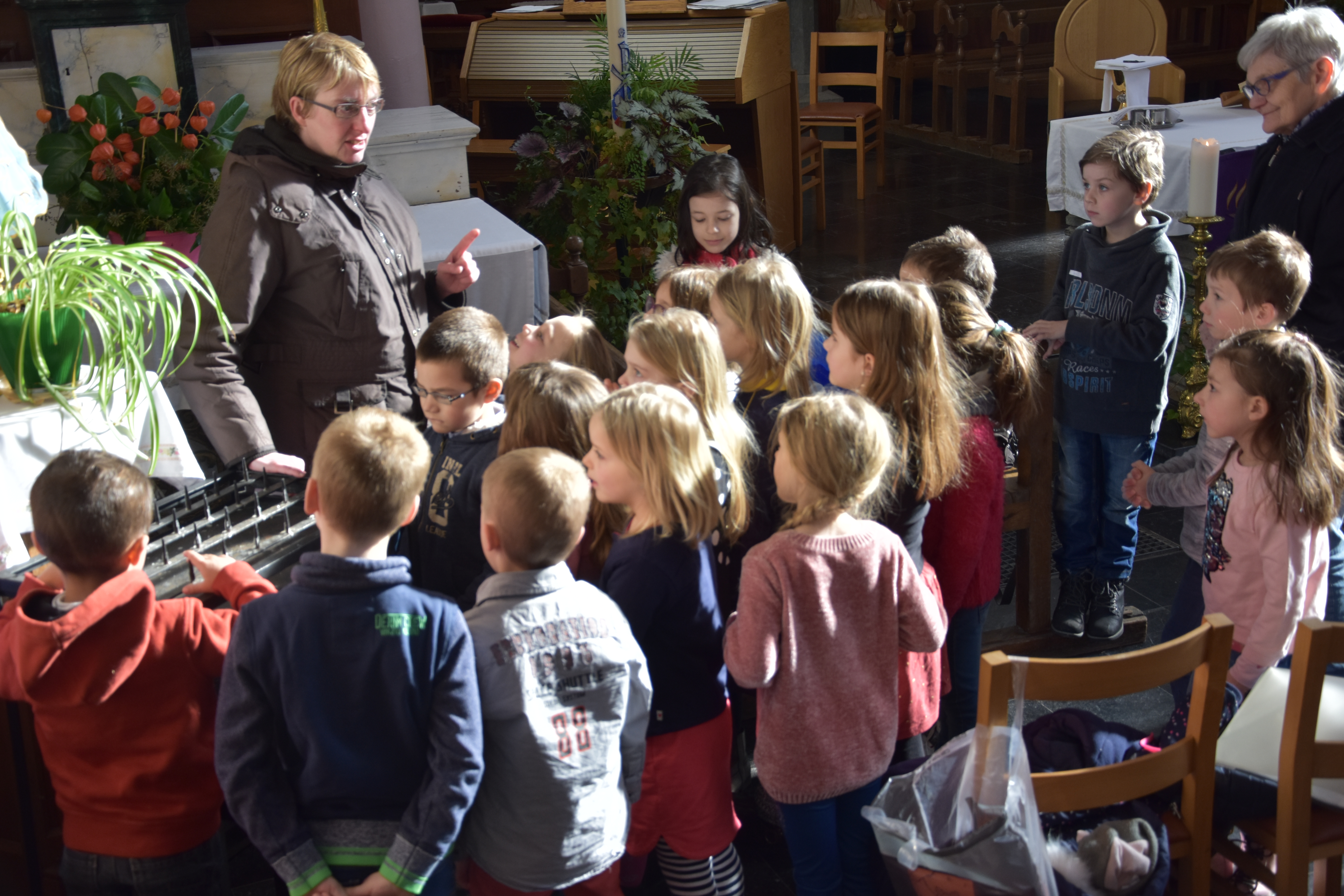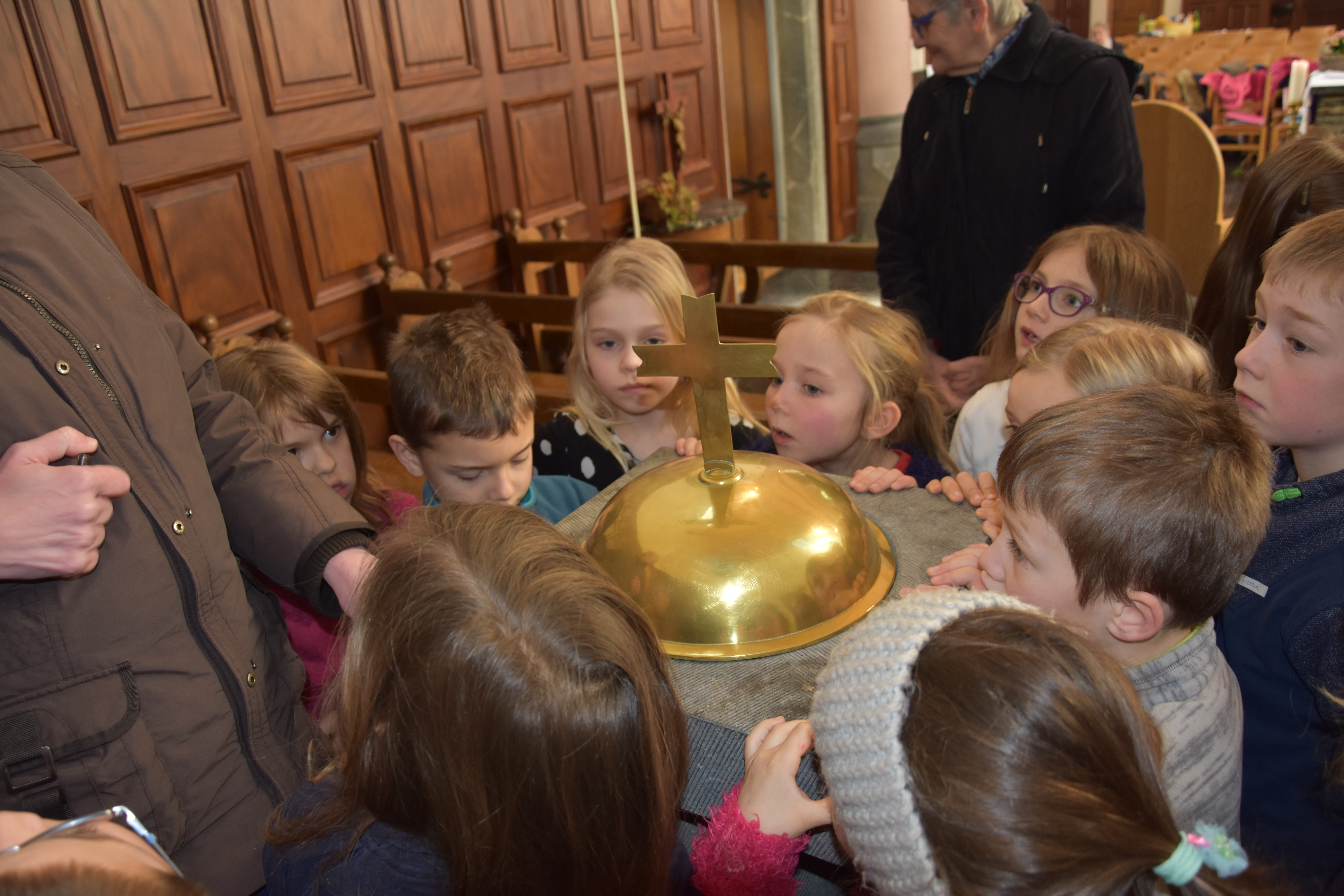 Après la lecture de la prière de l’arc-en-ciel par un enfant qui en a fait la demande spontanément, les premières années ont visité l’extérieur et l’intérieur de l’église ! De l’extérieur, l’église est très grande … la porte et les fenêtres aussi … Nous apprenons, par un enfant, qu’avant, on sonnait les cloches avec des cordes ! 😉 A l’intérieur, nous observons les bénitiers. « Il y a de l’eau pour bénir les enfants et aussi les animaux ! » Nous trempons notre main dedans et faisons le signe de croix ! Les questions fusent … « C’est quoi ça ? » L’autel… le lutrin… les représentations de Marie… le cierge pascal… les fonds baptismaux, etc… Que de merveilles et de nouveaux mots à entendre, répéter… « On ne saura pas retenir tous ces mots ! ». Devant le tabernacle, à la question : « Qu’est ce qu’il y a dedans ? », un enfant répond : « des petits pains … ». Dans la bouche d’un bout d’chou de 6 ans, que c’est joliment dit ! « On veut voir, on veut voir ! » et l’animatrice ouvre les deux portes, le petit rideau et, enfin, le ciboire. Dans la bouche d’un autre enfant, la sacristie devient « le vestiaire de Monsieur le Curé … » « L’offrandier sert à prier … pour les personnes malades qu’on connaît ! » Pour clôturer ce joli temps de partage, quelques enfants ont été désignés pour aller montrer, chacun à leur tour, les différents endroits ou « objets » découverts auparavant.