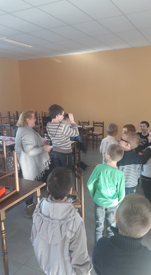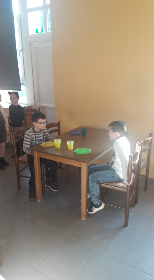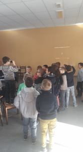 De leur côté, les deuxièmes ont regardé deux courtes vidéos relatant les histoires de Zachée et du paralytique guéri par Jésus. Pour le premier texte, les enfants ont dû mimer les différentes étapes du récit grâce à divers objets : jumelles, chaise, petit coffre-fort, machine à calculer, portefeuilles, argent, assiettes, table, chaises, verres etc…