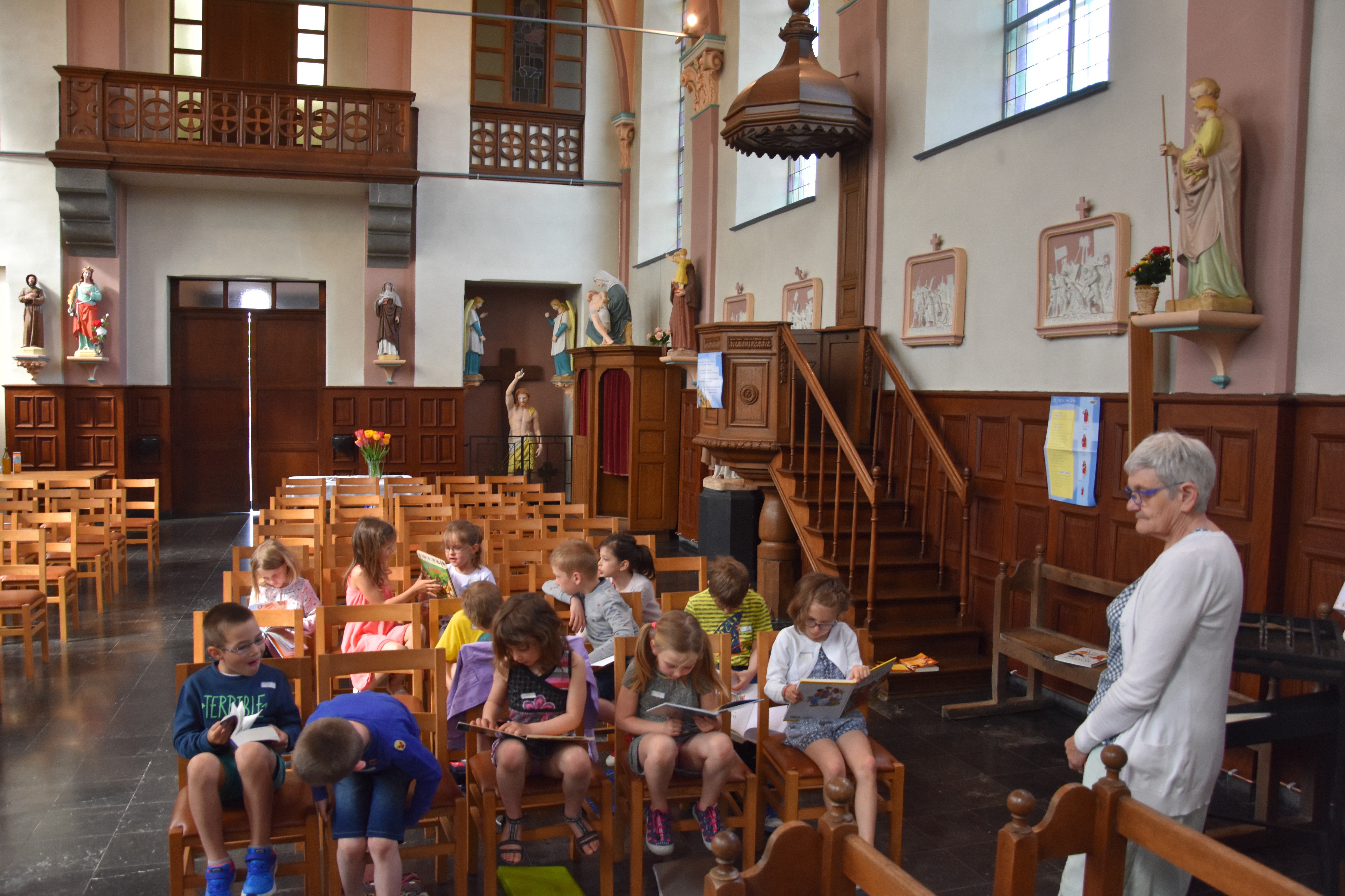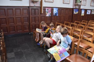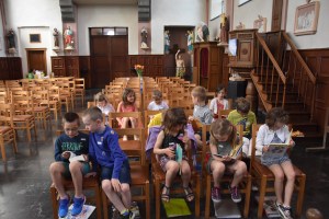 Les 1ères années ont vu le « chemin d’éveil à la Parole de Dieu ». Après avoir dit bonjour à Jésus et tracé le signe de croix, nous avons lu la traditionnelle prière de l’arc en ciel. Puis, les enfants ont classé par thème différents livres ou magazines : bricolage – enfants – BD – magazines – cuisine – romans … Ensuite, ils ont découvert la Bible de Jérusalem (un enfant a dit : « oh il faut une loupe pour lire dedans ! » 😉 ) et l’animatrice leur a expliqué que, pour que les enfants puissent lire toutes ces belles histoires, des personnes avaient édité des livres spéciaux avec des mots plus faciles et de jolies images … Ils ont donc pu consulter différents livres racontant la Bible aux enfants.