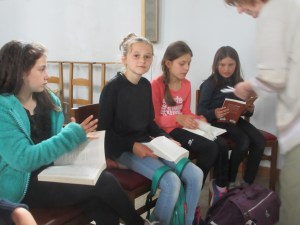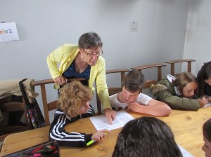 Ce mercredi 16 mai, les enfants qui viennent de terminer leur 1ère année de profession de foi se sont rassemblés à l’église de Graide pour vivre une après-midi tous ensemble avec leurs catéchistes. Nous avons d’abord salué les prêtres et catés présents et répété les chants de l’eucharistie. Ensuite, les enfants ont pu entendre une première fois le texte des disciples d’Emmaüs avec le support d’un diaporama. Quatre ateliers ont permis aux enfants de (re)découvrir le vocabulaire et la signification des différents « objets » ou endroits présents dans l’église (atelier « objets » liturgiques), le maniement de la Bible (atelier « Parole »), le rapport entre la prière eucharistique pour assemblées d’enfants numéro 2 et les textes de l’institution de l’Eucharistie (atelier « Partage du pain et du vin ») et enfin, il s’agissait de chercher dans des journaux ou magazines des titres, dessins ou petits textes ayant un rapport avec le thème « rendre service – aider les autres » ; un panneau collectif a été ainsi créé par tous les enfants présents. Avant l’eucharistie, ils ont joué à un « jeu de l’oie » sur l’histoire des disciples d’Emmaüs avec des questions se rapportant soit à l’histoire proprement dite ou bien de réflexion personnelle.