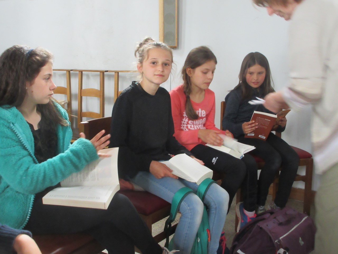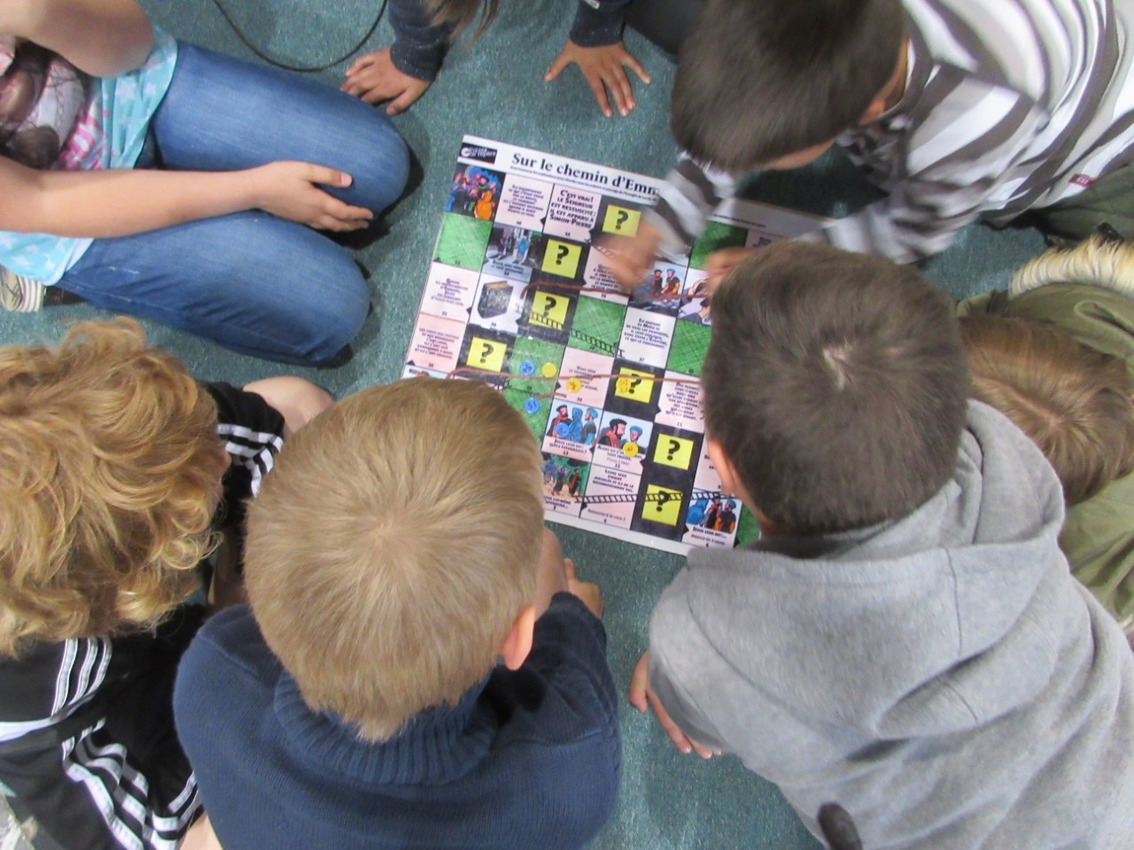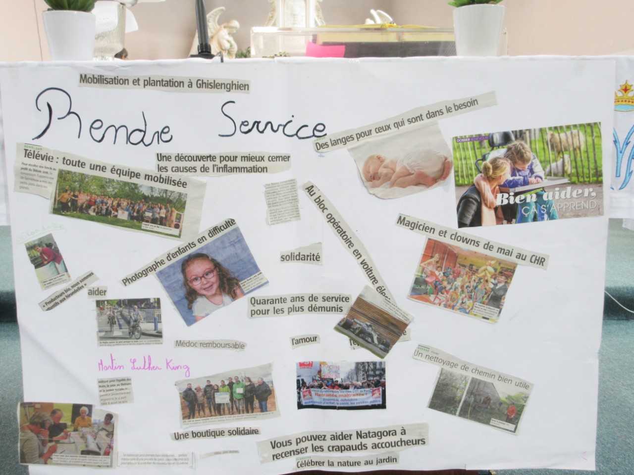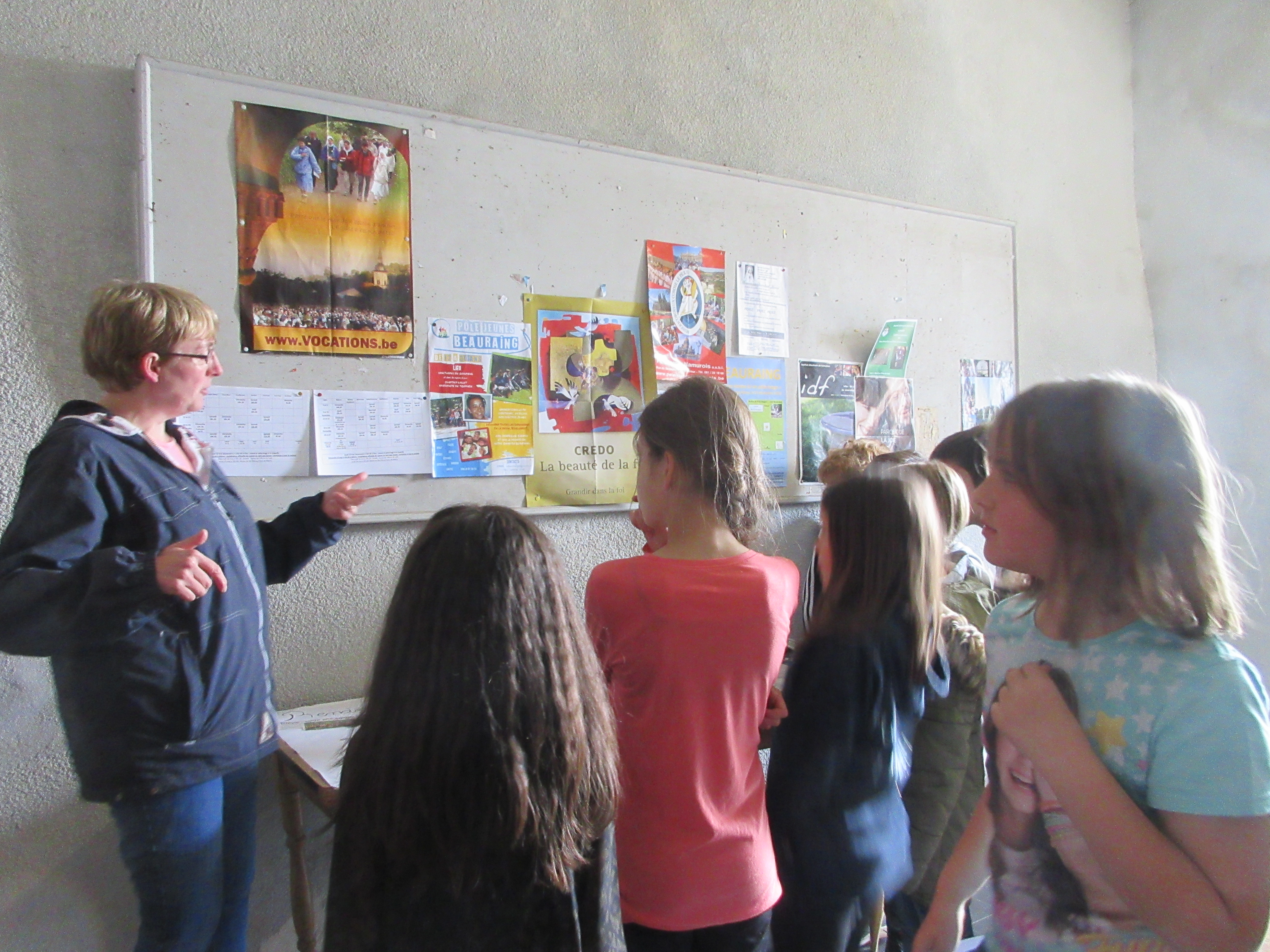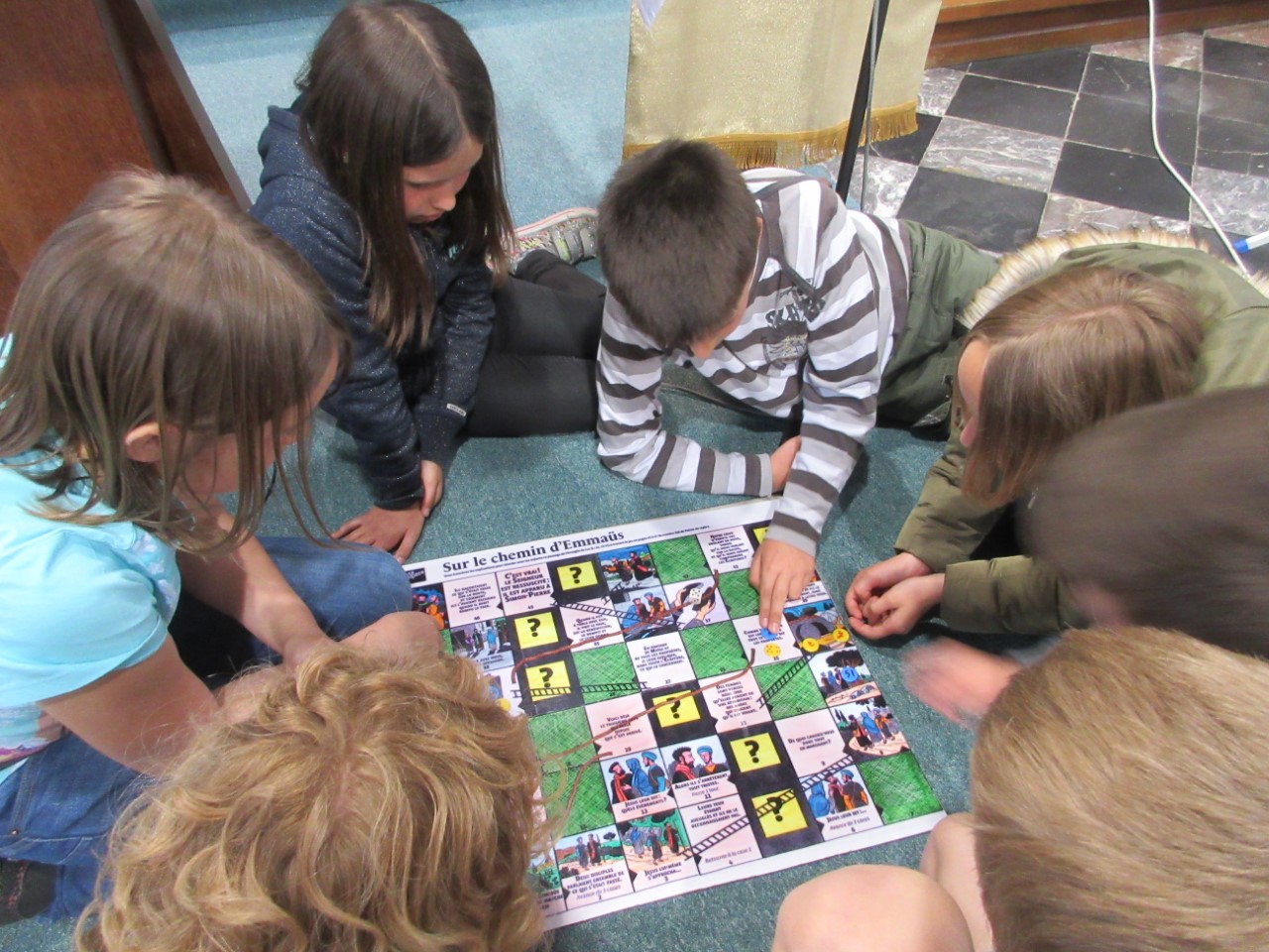 Ce mercredi 16 mai, les enfants qui viennent de terminer leur 1ère année de profession de foi se sont rassemblés à l’église de Graide pour vivre une après-midi tous ensemble avec leurs catéchistes. Nous avons d’abord salué les prêtres et catés présents et répété les chants de l’eucharistie. Ensuite, les enfants ont pu entendre une première fois le texte des disciples d’Emmaüs avec le support d’un diaporama. Quatre ateliers ont permis aux enfants de (re)découvrir le vocabulaire et la signification des différents « objets » ou endroits présents dans l’église (atelier « objets » liturgiques), le maniement de la Bible (atelier « Parole »), le rapport entre la prière eucharistique pour assemblées d’enfants numéro 2 et les textes de l’institution de l’Eucharistie (atelier « Partage du pain et du vin ») et enfin, il s’agissait de chercher dans des journaux ou magazines des titres, dessins ou petits textes ayant un rapport avec le thème « rendre service – aider les autres » ; un panneau collectif a été ainsi créé par tous les enfants présents. Avant l’eucharistie, ils ont joué à un « jeu de l’oie » sur l’histoire des disciples d’Emmaüs avec des questions se rapportant soit à l’histoire proprement dite ou bien de réflexion personnelle.