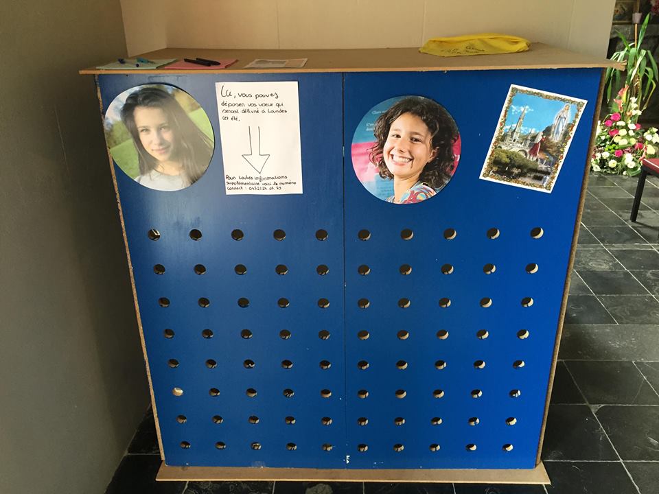 Depuis ce week-end, dans le porche de l’église de Bièvre, une grande structure un peu mystérieuse attire l’attention des visiteurs. Si on l’observe attentivement, on peut remarquer de petits orifices sur l’avant. A quoi peuvent-ils donc bien servir, me direz-vous ? En fait, il s’agit d’écrire sur un petit papier un souhait, une prière, un voeu et le glisser dans un des orifices en question ! Tous ces petits papiers seront acheminés en juillet (pélé du 19 au 25 juillet) de cette année jusque Lourdes par les membres du pélé ados et jeunes.