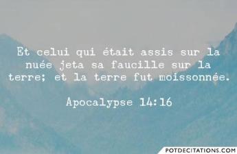 Moi, Jean, j’ai vu : et voici une nuée blanche, et sur cette nuée, quelqu’un siégeait, qui semblait un Fils d’homme. Il avait sur la tête une couronne d’or et, à la main, une faucille aiguisée. Un autre ange sortit du Sanctuaire. Il cria d’une voix forte à celui qui siégeait sur la nuée : « Lance ta faucille et moissonne : elle est venue, l’heure de la moisson, car la moisson de la terre se dessèche. » Alors, celui qui siégeait sur la nuée jeta la faucille sur la terre, et la terre fut moissonnée. Puis un autre ange sortit du Sanctuaire qui est dans le ciel ; il avait, lui aussi, une faucille aiguisée. Un autre ange encore sortit, venant de l’autel ; il avait pouvoir sur le feu. Il interpella d’une voix forte celui qui avait la faucille aiguisée : « Lance ta faucille aiguisée, et vendange les grappes de la vigne sur la terre, car les raisins sont mûrs. » L’ange, alors, jeta la faucille sur la terre, il vendangea la vigne de la terre et jeta la vendange dans la cuve immense de la fureur de Dieu. – Parole du Seigneur.