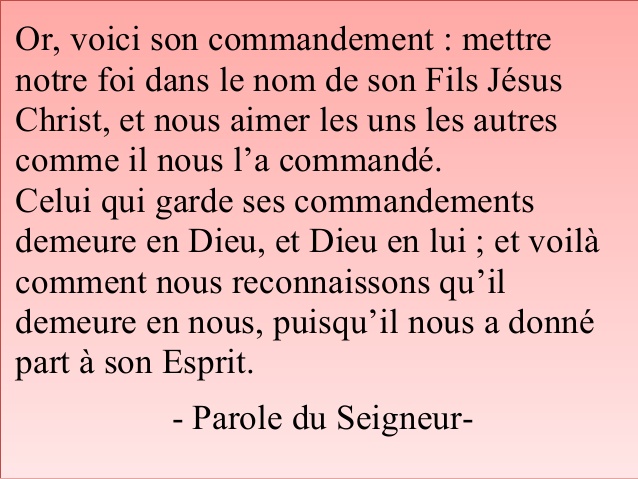 Bien-aimés, quoi que nous demandions à Dieu, nous le recevons de lui, parce que nous gardons ses commandements, et que nous faisons ce qui est agréable à ses yeux. Or, voici son commandement : mettre notre foi dans le nom de son Fils Jésus Christ, et nous aimer les uns les autres comme il nous l’a commandé. Celui qui garde ses commandements demeure en Dieu, et Dieu en lui ; et voilà comment nous reconnaissons qu’il demeure en nous, puisqu’il nous a donné part à son Esprit. Bien-aimés, ne vous fiez pas à n’importe quelle inspiration, mais examinez les esprits pour voir s’ils sont de Dieu, car beaucoup de faux prophètes se sont répandus dans le monde. Voici comment vous reconnaîtrez l’Esprit de Dieu : tout esprit qui proclame que Jésus Christ est venu dans la chair, celui-là est de Dieu. Tout esprit qui refuse de proclamer Jésus, celui-là n’est pas de Dieu : c’est l’esprit de l’anti-Christ, dont on vous a annoncé la venue et qui, dès maintenant, est déjà dans le monde. Vous, petits enfants, vous êtes de Dieu, et vous avez vaincu ces gens-là ; car Celui qui est en vous est plus grand que celui qui est dans le monde. Eux, ils sont du monde ; voilà pourquoi ils parlent le langage du monde, et le monde les écoute. Nous, nous sommes de Dieu ; celui qui connaît Dieu nous écoute ; celui qui n’est pas de Dieu ne nous écoute pas. C’est ainsi que nous reconnaissons l’esprit de la vérité et l’esprit de l’erreur. – Parole du Seigneur.