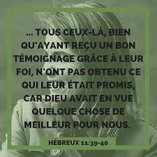 Après cette liste de grands noms, de victoires et de miracles de la foi, on trouve au verset 35 un changement de tonalité. Après les propos victorieux des versets précédents, le milieu de ce verset 35 laisse découvrir que : « d’autres furent livrés aux tourments, et n’acceptèrent point de délivrance, afin d’obtenir une meilleure résurrection, d’autres subirent les moqueries et le fouet, les chaînes et la prison; ils furent lapidés, sciés, torturés, ils moururent tués par l’épée, ils allèrent çà et là vêtus de peaux de brebis et de peaux de chèvres, dénués de tout, persécutés, maltraités, — eux dont le monde n’était pas digne, — errants dans les déserts et les montagnes, dans les cavernes et les antres de la terre. Tous ceux-là, à la foi desquels il a été rendu témoignage, n’ont pas obtenu ce qui leur était promis, Dieu ayant en vue quelque chose de meilleur pour nous, afin qu’ils ne parvinssent pas sans nous à la perfection. » (Hébreux 11: 35 à 40).