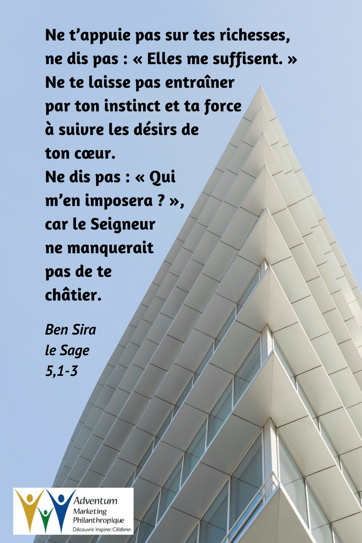 Ne t’appuie pas sur tes richesses, ne dis pas : « Elles me suffisent. » Ne te laisse pas entraîner par ton instinct et ta force à suivre les désirs de ton cœur. Ne dis pas : « Qui m’en imposera ? », car le Seigneur ne manquerait pas de te châtier. Ne dis pas : « J’ai péché, et rien ne m’est arrivé », car le Seigneur sait attendre longtemps. Ne sois pas assuré du pardon au point d’entasser péché sur péché. Ne dis pas : « Sa miséricorde est grande, il pardonnera bien tous mes péchés », car, en lui, il y a pitié mais aussi colère ; son indignation s’abattra sur les pécheurs. Ne tarde pas à te retourner vers le Seigneur, ne remets pas ta décision de jour en jour ; car brusquement éclatera la colère du Seigneur, et à l’heure du châtiment, tu seras anéanti. Ne t’appuie pas sur des richesses injustement acquises : elles ne te serviront de rien au jour de l’adversité. – Parole du Seigneur.