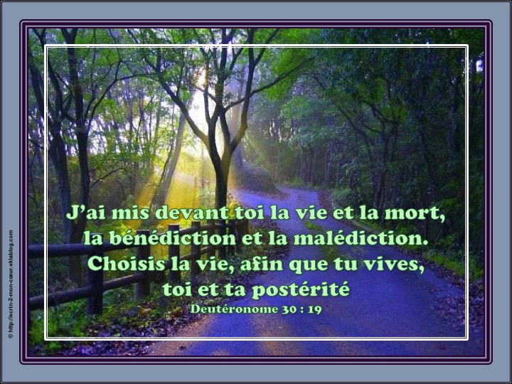 Moïse disait au peuple : « Vois ! Je mets aujourd’hui devant toi ou bien la vie et le bonheur, ou bien la mort et le malheur. Ce que je te commande aujourd’hui, c’est d’aimer le Seigneur ton Dieu, de marcher dans ses chemins, de garder ses commandements, ses décrets et ses ordonnances. Alors, tu vivras et te multiplieras ; le Seigneur ton Dieu te bénira dans le pays dont tu vas prendre possession. Mais si tu détournes ton cœur, si tu n’obéis pas, si tu te laisses entraîner à te prosterner devant d’autres dieux et à les servir, je vous le déclare aujourd’hui : certainement vous périrez, vous ne vivrez pas de longs jours sur la terre dont vous allez prendre possession quand vous aurez passé le Jourdain. Je prends aujourd’hui à témoin contre vous le ciel et la terre : je mets devant toi la vie ou la mort, la bénédiction ou la malédiction. Choisis donc la vie, pour que vous viviez, toi et ta descendance, en aimant le Seigneur ton Dieu, en écoutant sa voix, en vous attachant à lui ; c’est là que se trouve ta vie, une longue vie sur la terre que le Seigneur a juré de donner à tes pères, Abraham, Isaac et Jacob. » – Parole du Seigneur.