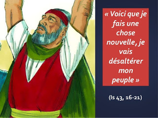 Ainsi parle le Seigneur, lui qui fit un chemin dans la mer, un sentier dans les eaux puissantes, lui qui mit en campagne des chars et des chevaux, des troupes et de puissants guerriers ; les voilà tous couchés pour ne plus se relever, ils se sont éteints, consumés comme une mèche. Le Seigneur dit : « Ne faites plus mémoire des événements passés, ne songez plus aux choses d’autrefois. Voici que je fais une chose nouvelle : elle germe déjà, ne la voyez-vous pas ? Oui, je vais faire passer un chemin dans le désert, des fleuves dans les lieux arides. Les bêtes sauvages me rendront gloire – les chacals et les autruches – parce que j’aurai fait couler de l’eau dans le désert, des fleuves dans les lieux arides, pour désaltérer mon peuple, celui que j’ai choisi. Ce peuple que je me suis façonné redira ma louange. » – Parole du Seigneur.
