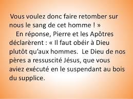 En ces jours-là, le commandant du Temple et son escorte, ayant amené les Apôtres, les présentèrent au Conseil suprême, et le grand prêtre les interrogea : « Nous vous avions formellement interdit d’enseigner au nom de celui-là, et voilà que vous remplissez Jérusalem de votre enseignement. Vous voulez donc faire retomber sur nous le sang de cet homme ! » En réponse, Pierre et les Apôtres déclarèrent : « Il faut obéir à Dieu plutôt qu’aux hommes. Le Dieu de nos pères a ressuscité Jésus, que vous aviez exécuté en le suspendant au bois du supplice. C’est lui que Dieu, par sa main droite, a élevé, en faisant de lui le Prince et le Sauveur, pour accorder à Israël la conversion et le pardon des péchés. Quant à nous, nous sommes les témoins de tout cela, avec l’Esprit Saint, que Dieu a donné à ceux qui lui obéissent. » Ceux qui les avaient entendus étaient exaspérés et projetaient de les supprimer. – Parole du Seigneur.