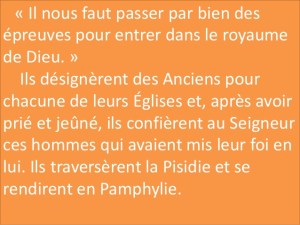 En ces jours-là, comme Paul et Barnabé se trouvaient à Lystres, des Juifs arrivèrent d’Antioche de Pisidie et d’Iconium ; ils se rallièrent les foules, ils lapidèrent Paul et le traînèrent hors de la ville, pensant qu’il était mort. Mais, quand les disciples firent cercle autour de lui, il se releva et rentra dans la ville. Le lendemain, avec Barnabé, il partit pour Derbé. Ils annoncèrent la Bonne Nouvelle à cette cité et firent bon nombre de disciples. Puis ils retournèrent à Lystres, à Iconium et à Antioche de Pisidie ; ils affermissaient le courage des disciples ; ils les exhortaient à persévérer dans la foi, en disant : « Il nous faut passer par bien des épreuves pour entrer dans le royaume de Dieu. » Ils désignèrent des Anciens pour chacune de leurs Églises et, après avoir prié et jeûné, ils confièrent au Seigneur ces hommes qui avaient mis leur foi en lui. Ils traversèrent la Pisidie et se rendirent en Pamphylie. Après avoir annoncé la Parole aux gens de Pergé, ils descendirent au port d’Attalia, et s’embarquèrent pour Antioche de Syrie, d’où ils étaient partis ; c’est là qu’ils avaient été remis à la grâce de Dieu pour l’œuvre qu’ils avaient accomplie. Une fois arrivés, ayant réuni l’Église, ils rapportèrent tout ce que Dieu avait fait avec eux, et comment il avait ouvert aux nations la porte de la foi. Ils passèrent alors un certain temps avec les disciples. – Parole du Seigneur.