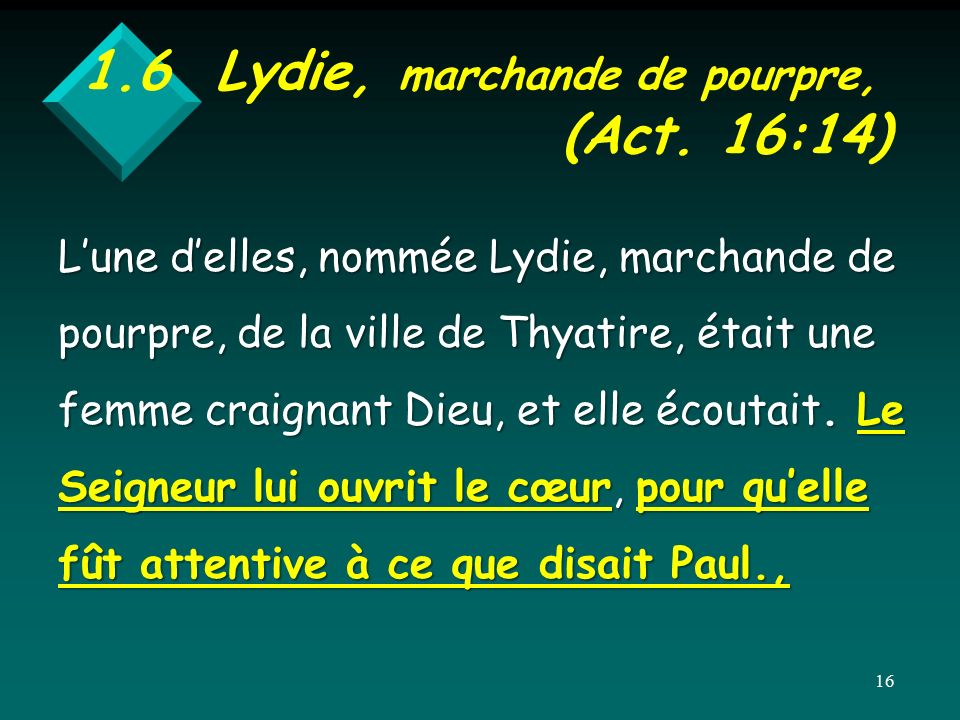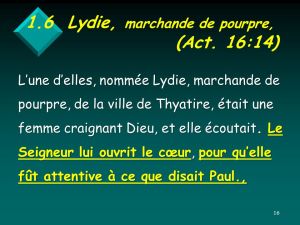 Avec Paul, de Troas nous avons gagné le large et filé tout droit sur l’île de Samothrace, puis, le lendemain, sur Néapolis, et ensuite sur Philippes, qui est une cité du premier district de Macédoine et une colonie romaine. Nous avons passé un certain temps dans cette ville et, le jour du sabbat, nous en avons franchi la porte pour rejoindre le bord de la rivière, où nous pensions trouver un lieu de prière. Nous nous sommes assis, et nous avons parlé aux femmes qui s’étaient réunies. L’une d’elles nommée Lydie, une négociante en étoffes de pourpre, originaire de la ville de Thyatire, et qui adorait le Dieu unique, écoutait. Le Seigneur lui ouvrit l’esprit pour la rendre attentive à ce que disait Paul. Quand elle fut baptisée, elle et tous les gens de sa maison, elle nous adressa cette invitation : « Si vous avez reconnu ma foi au Seigneur, venez donc dans ma maison pour y demeurer. » C’est ainsi qu’elle nous a forcé la main. – Parole du Seigneur.