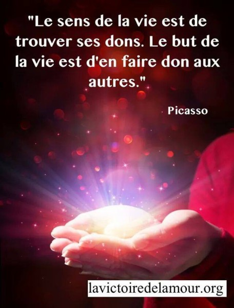 « Le sens de la vie ? Voici le secret : « Fais de ton mieux. Puis laisse faire Dieu. » N’écoute pas ceux qui veulent t’éloigner de tes rêves, ceux qui veulent te décourager en chemin, ceux qui n’y croient plus. Que connaissent-ils de ton mystère ? C’est à toi de l’exprimer pleinement, de toutes les forces de ton amour. Il faut être amoureux-fou de la vie ! Il faut oser risquer ! Même quand on se donne, ce n’est jamais « trop », c’est toujours « pas assez ». On n’aime jamais trop. On peut se tromper, on peut aimer mal, mais on n’aime jamais assez. Jamais, tu entends !