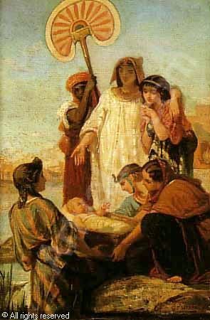 En ces jours-là, un homme de la tribu de Lévi avait épousé une femme de la même tribu. Elle devint enceinte, et elle enfanta un fils. Voyant qu’il était beau, elle le cacha durant trois mois. Lorsqu’il lui fut impossible de le tenir caché plus longtemps, elle prit une corbeille de jonc, qu’elle enduisit de bitume et de goudron. Elle y plaça l’enfant, et déposa la corbeille au bord du Nil, au milieu des roseaux. La sœur de l’enfant se tenait à distance pour voir ce qui allait arriver. La fille de Pharaon descendit au fleuve pour s’y baigner, tandis que ses suivantes se promenaient sur la rive. Elle aperçut la corbeille parmi les roseaux et envoya sa servante pour la prendre. Elle l’ouvrit et elle vit l’enfant. C’était un petit garçon, il pleurait. Elle en eut pitié et dit : « C’est un enfant des Hébreux. » La sœur de l’enfant dit alors à la fille de Pharaon : « Veux-tu que j’aille te chercher, parmi les femmes des Hébreux, une nourrice qui, pour toi, nourrira l’enfant ? » La fille de Pharaon lui répondit : « Va. » La jeune fille alla donc chercher la mère de l’enfant. La fille de Pharaon dit à celle-ci : « Emmène cet enfant et nourris-le pour moi. C’est moi qui te donnerai ton salaire. » Alors la femme emporta l’enfant et le nourrit. Lorsque l’enfant eut grandi, elle le ramena à la fille de Pharaon qui le traita comme son propre fils ; elle lui donna le nom de Moïse, en disant : « Je l’ai tiré des eaux. » Or vint le jour où Moïse, qui avait grandi, se rendit auprès de ses frères et les vit accablés de corvées. Il vit un Égyptien qui frappait un Hébreu, l’un de ses frères. Regardant autour de lui et ne voyant personne,