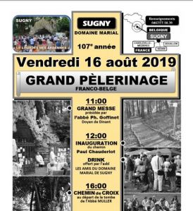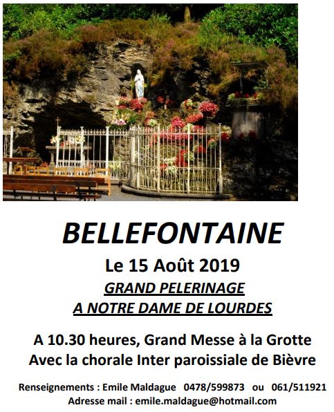 Jeudi 15 août => 9h00 : Bièvre (chapelle) – 10h30 : Bellefontaine (grotte Notre Dame de Lourdes) cfr affiche ci-dessous – 10h30 : Porcheresse et procession – 17h00 : Oizy (chapelle) – 18h00 : Haut-Fays