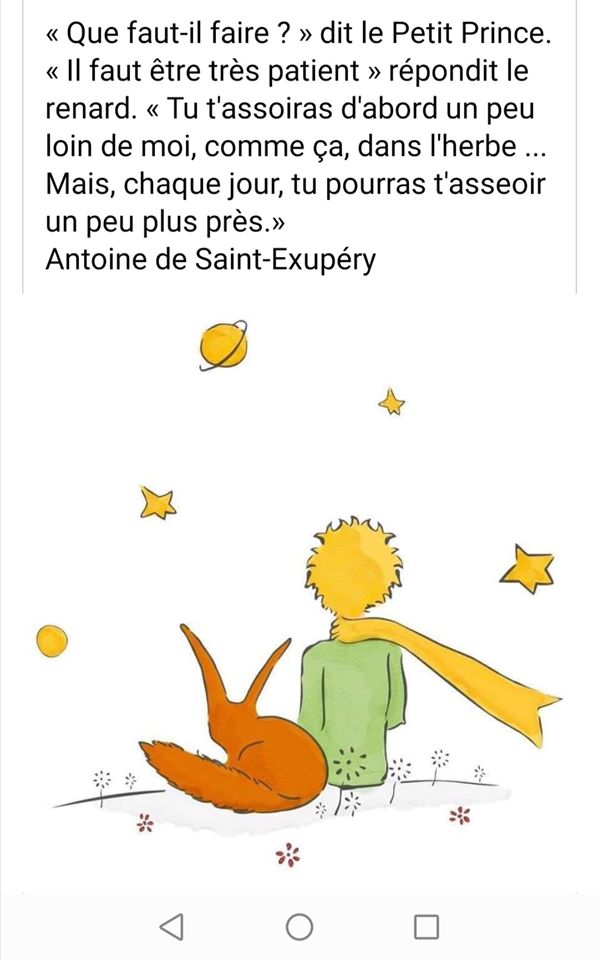 « Le Petit Prince » inspirant en cette crise du Coronavirus 16 Mai 202026 Mai 2020 / veroniquepaquay67 Publication de Madame Nathalie L. sur le groupe Facebook « Cinaciennes, Cinaciens » Partagez si vous aimez ! Partager sur X(ouvre dans une nouvelle fenêtre) X Partager sur Facebook(ouvre dans une nouvelle fenêtre) Facebook Partager sur LinkedIn(ouvre dans une nouvelle fenêtre) LinkedIn Partager sur WhatsApp(ouvre dans une nouvelle fenêtre) WhatsApp J’aime chargement…