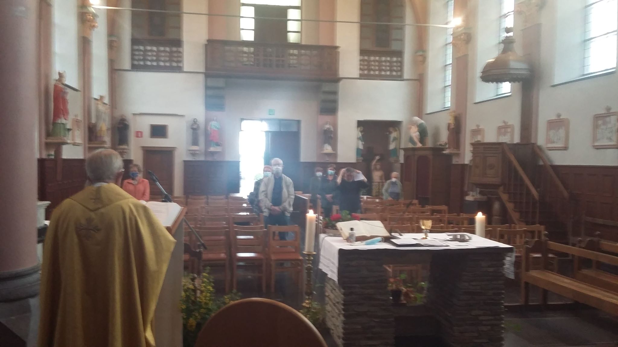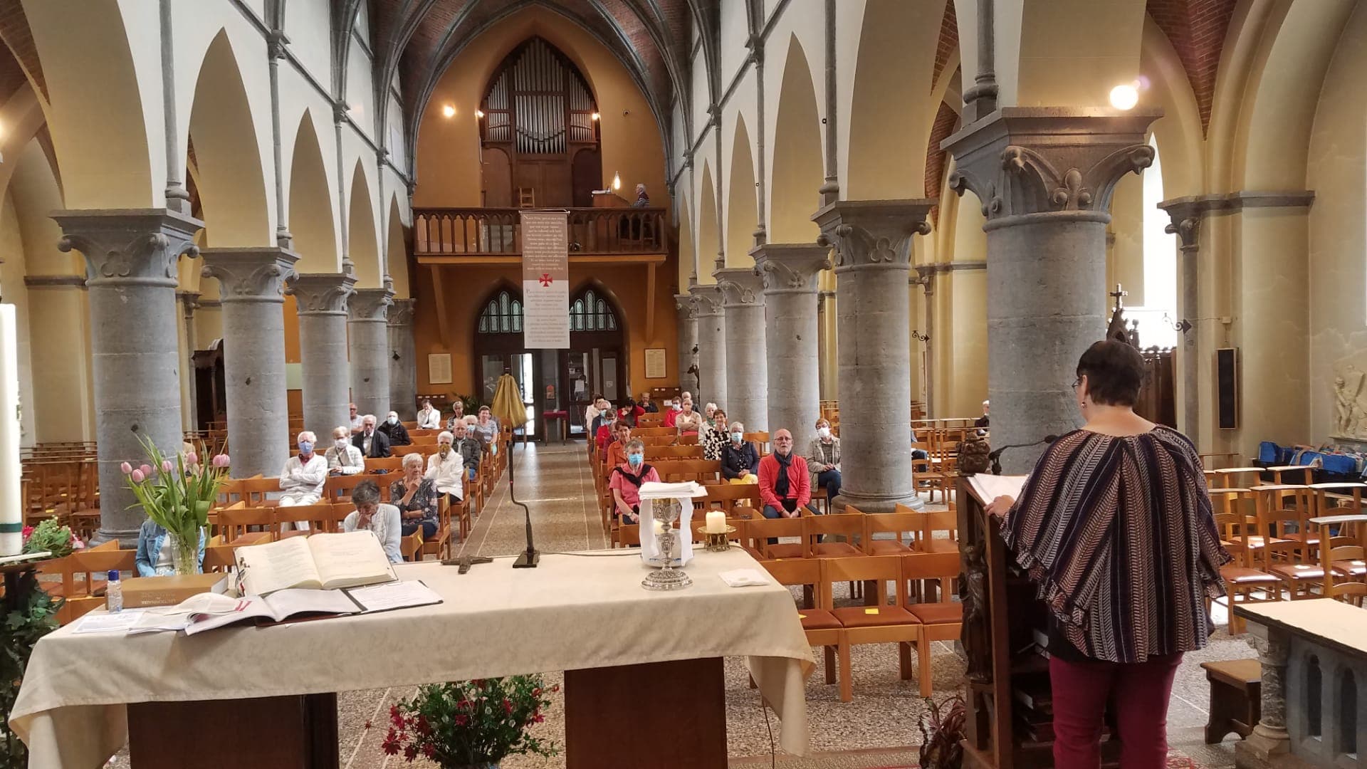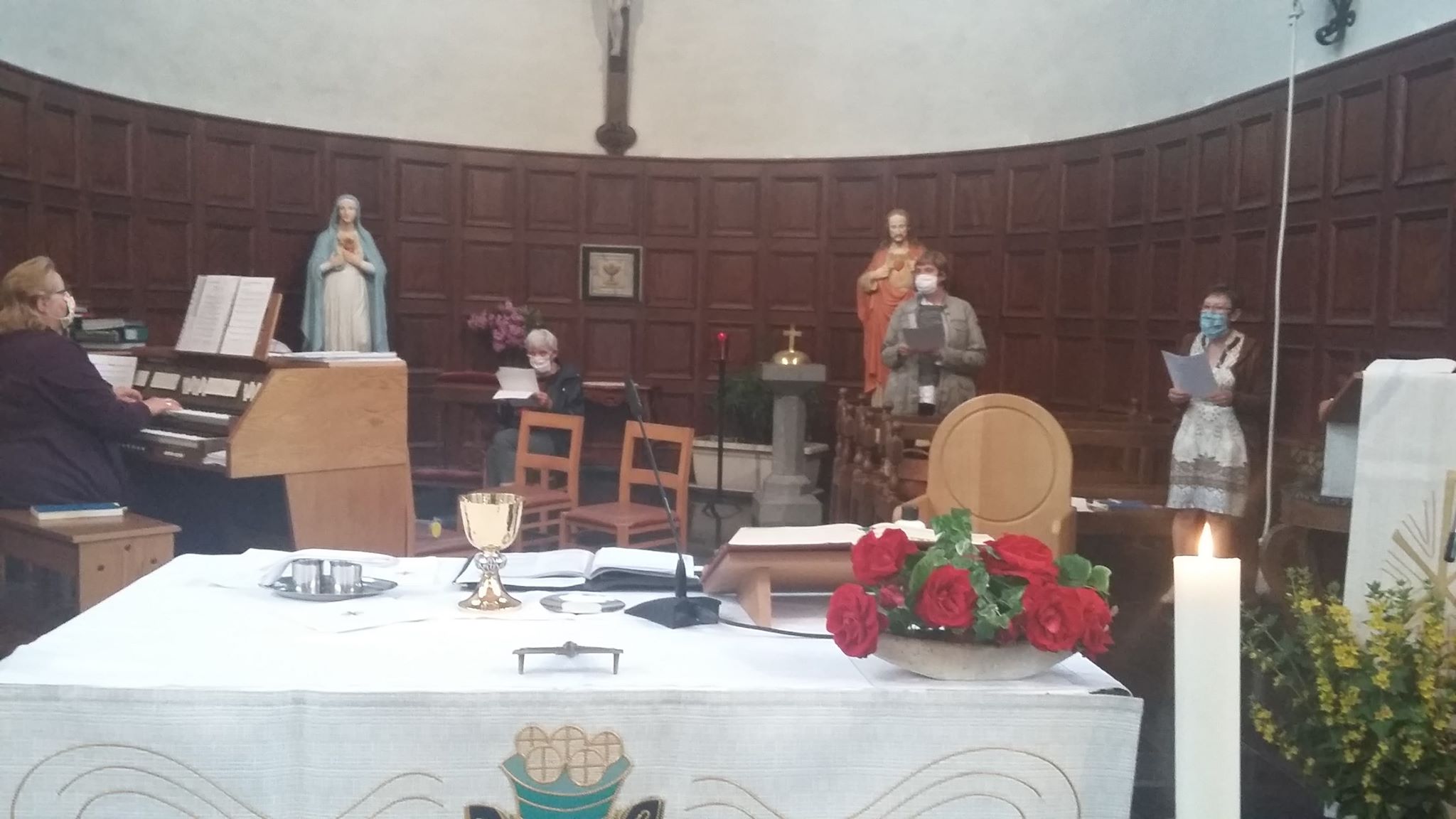La chorale de la paroisse ne comporte que très peu de membres, ceux-ci ont donc cherché ensemble la meilleure solution pour chanter tout en respectant les recommandations : ils ont donc chanté en portant le masque et à distance les uns des autres.  V.P