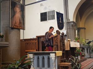 Intégration du port du masque et des gestes barrière, respect des consignes, chants entonnés par Catherine, accompagnée de Jean-Marie à l’orgue.