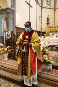 Au début de l’eucharistie, une brève présentation a permis à chacun d’en apprendre un peu plus sur l’abbé Casmir Nnubia. Celui-ci a été ordonné prêtre le 26 août 1995 à Isiokpo (diocèse d’Orlu) au Nigeria et envoyé chez nous comme prêtre «fidei donum» (c’est un prêtre qui est envoyé en mission par son évêque) depuis l’année 2000. En 2017, il a été nommé doyen pour remplacer l’abbé José Dussart. Toutes les personnes présentes ont été invitées à penser à sa famille qui n’a pas pu être présente ! Les consignes du Conseil National de Sécurité et de l’évêché ont été rappelées : port du masque – distances de sécurité – rester dans sa bulle et gel désinfectant.