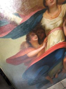 Fortement endommagé par l’âge et par la tempête de juillet 2018, ce tableau a subi une restauration minutieuse réalisée par Soeur Marie-Marthe HAUFFERLIN de l’Abbaye de Cordemois (Bouillon).