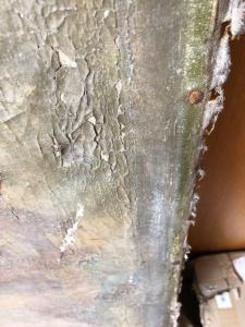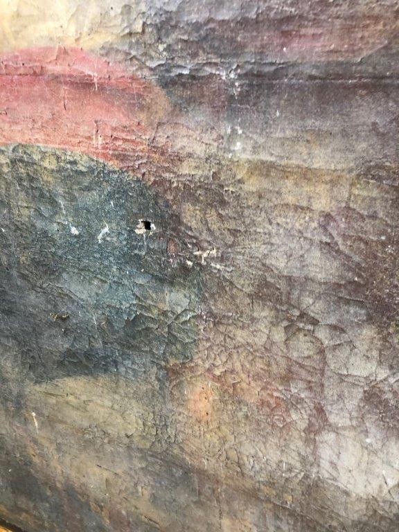 – Retrait de la toile du support (châssis) et nettoyage superficiel de l’avers.
