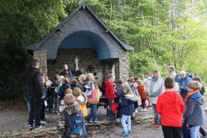 Le mercredi 28 septembre, tous les enfants du doyenné de Gedinne qui sont en cheminement de confirmation se sont réunis à Porcheresse pour vivre une après-midi de rentrée de caté. Voici les différentes activités vécues : répétition des chants de la messe – histoire des apparitions de Beauraing raconté avec l’appui d’un diaporama – jeu de « Fort Boyard » revisité en plusieurs étapes (réponses à des questions pour obtenir 5 clés par équipe, épreuves pour récolter des lettres qui, mises dans le bon ordre, donnaient le mot « COMMUNUAUTE », découverte du trésor avec le Père Fouras – chaque groupe a ainsi reçu un vitrail-bougie pour prier lors des rencontres de caté-). Nous avons ensuite vécu un mini-pèlerinage vers la chapelle Notre Dame de Beauraing située dans le village, partagé un temps de prière. Fin d’après-midi, une eucharistie participative (procession d’entrée avec les vitraux-bougies, lectures diverses, reconstitution du mot « communauté » sur l’autel), a rassemblé tout le monde pour clôturer cette belle après-midi de rentrée. L’abbé Casmir a béni les enfants et leur mallette à l’occasion de cette double rentrée : scolaire et de caté.