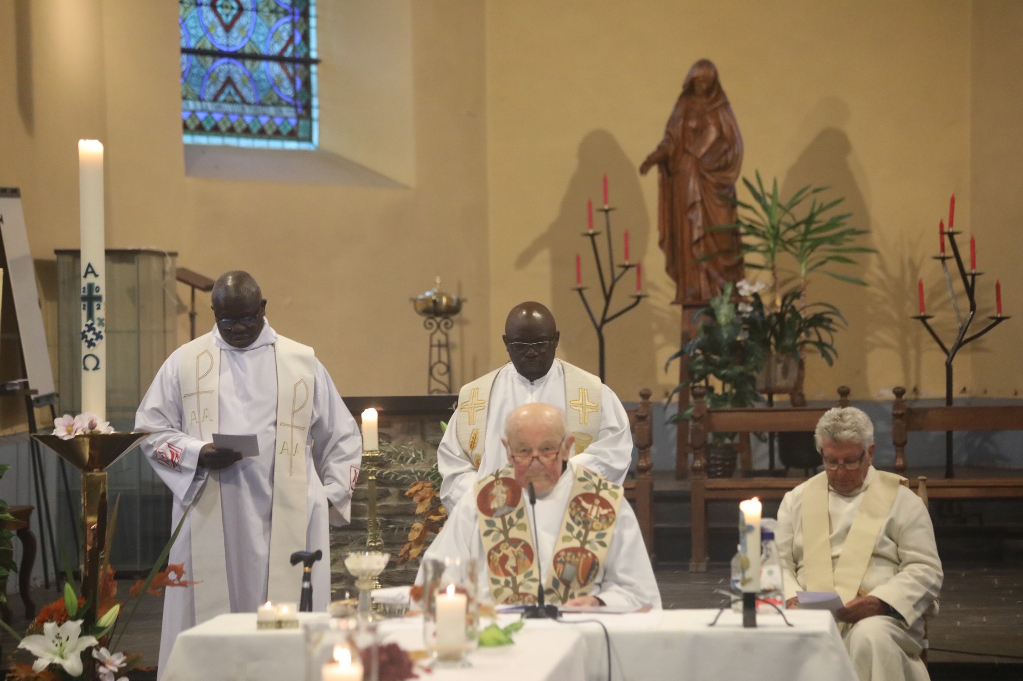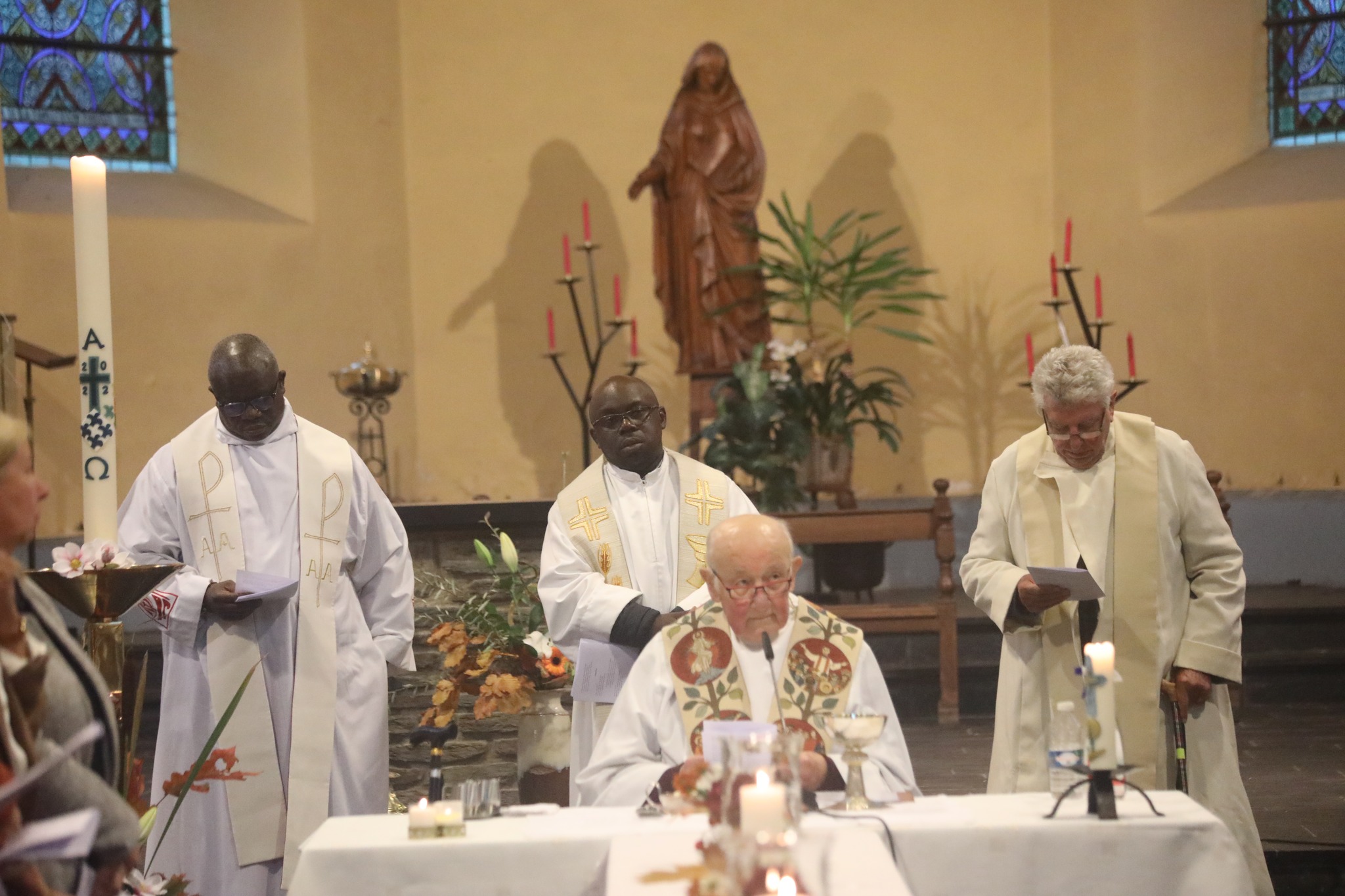 Une église noire de monde pour une messe dominicale, cela faisait déjà longtemps que ce n’était plus arrivé ! Ce samedi 8 octobre, les paroissiens, les membres de la Fabrique, les amis et la famille de l’abbé Léon Bechoux étaient en nombre pour fêter dignement les 20 ans de présence de leur curé à Nafraiture (Vresse-sur-Semois) et ses 62 ans de sacerdoce. Une table, en forme de croix, avait été aménagée au centre de l’église et les fidèles étaient rassemblés tout au tour pour cette messe d’action de grâce. Léon était entouré des autres prêtres du secteur de Vresse-sur-Semois : les abbés Jean-Pierre Brou, Armel Kole et Pierre Installé.
