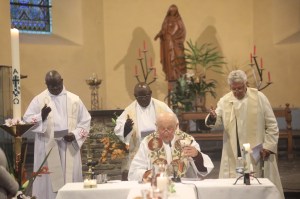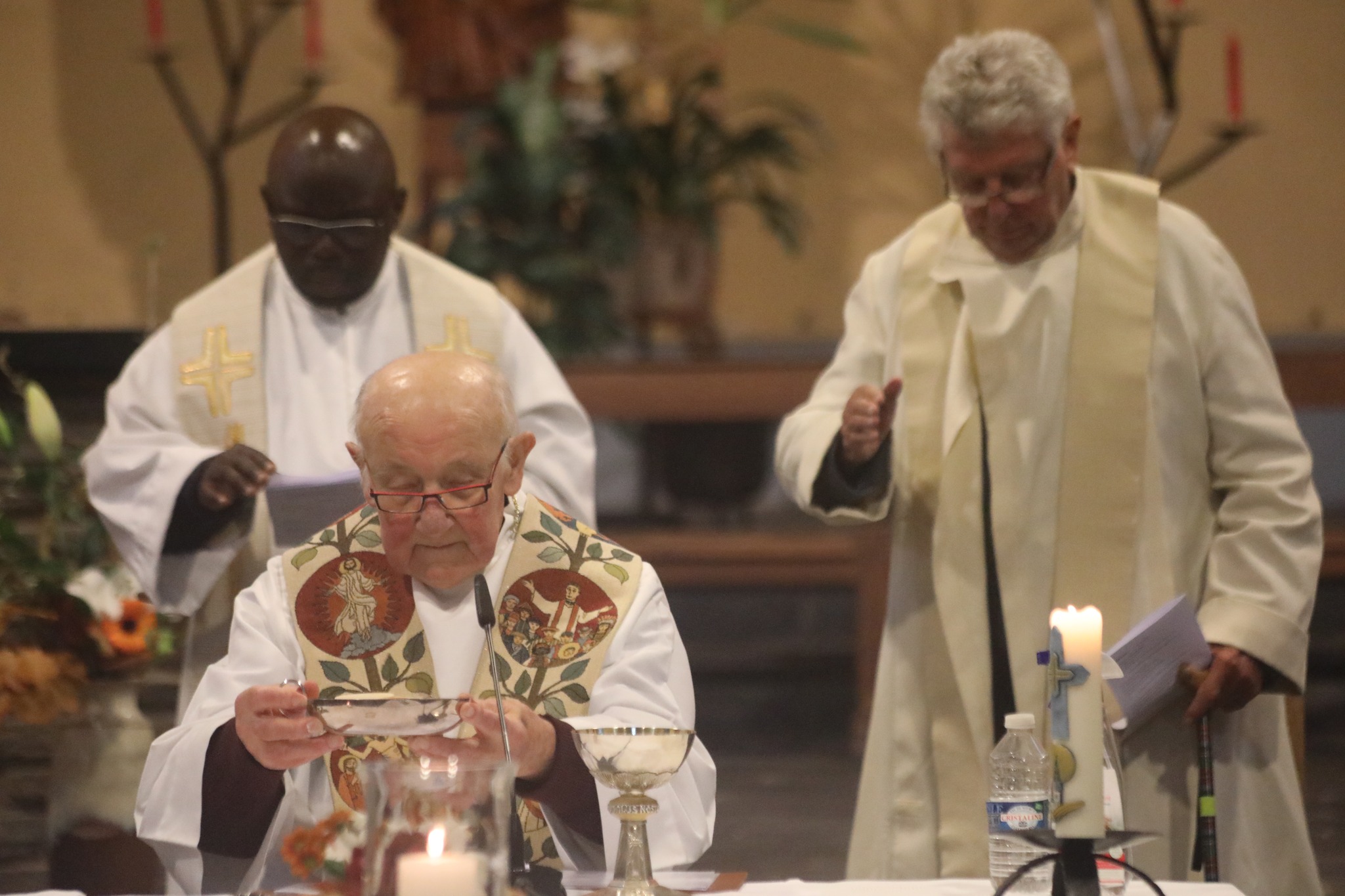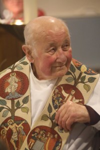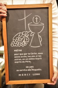 En fin d’eucharistie, il a été chaleureusement applaudi avant de se voir remettre quelques cadeaux : un panier garni de bouteilles de vin ainsi qu’une plaque souvenir gravée sur pierre et réalisée par Jean-Marie Theret. La célébration s’est clôturée par le verre de l’amitié et quelques mignardises.
