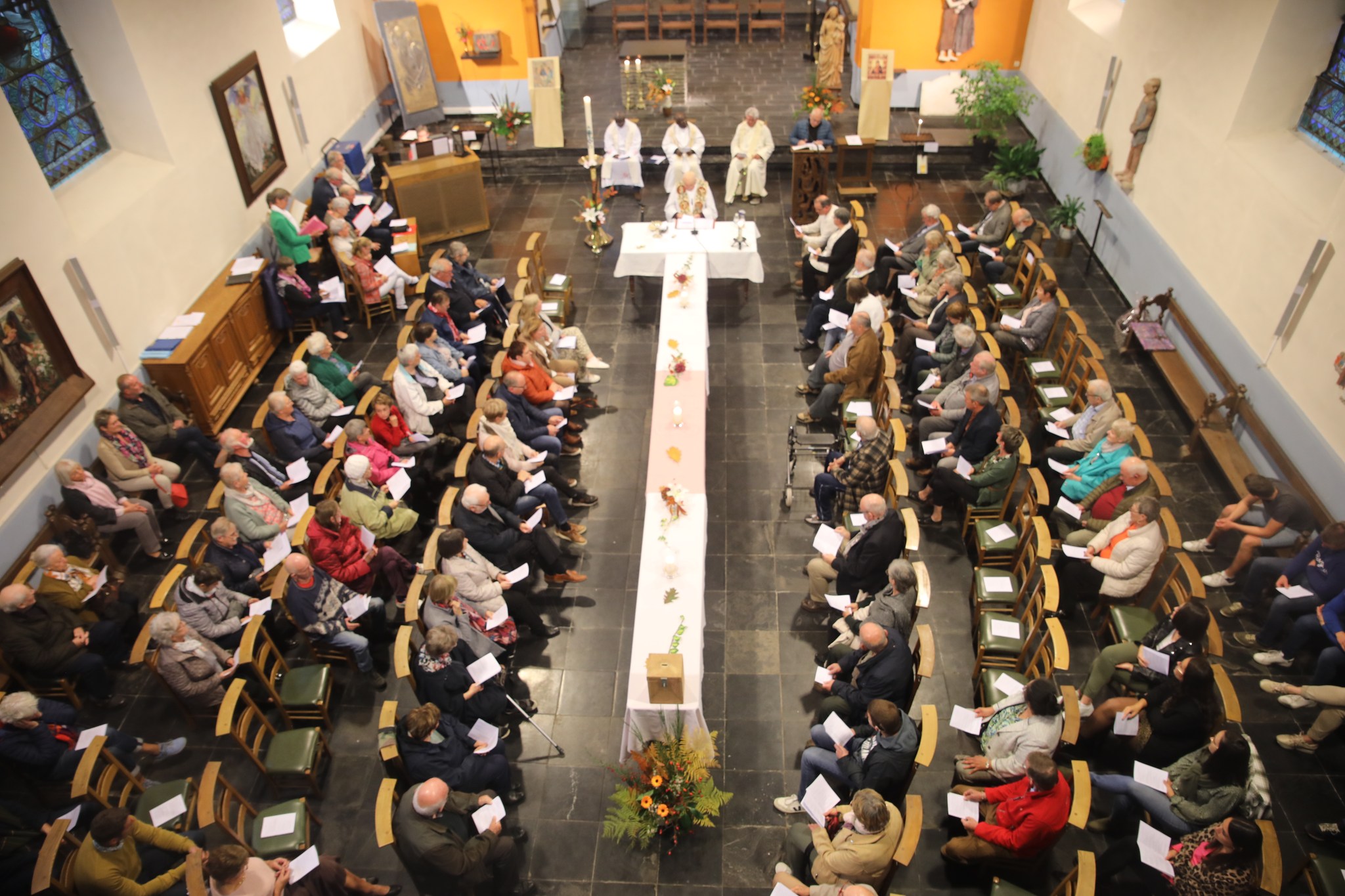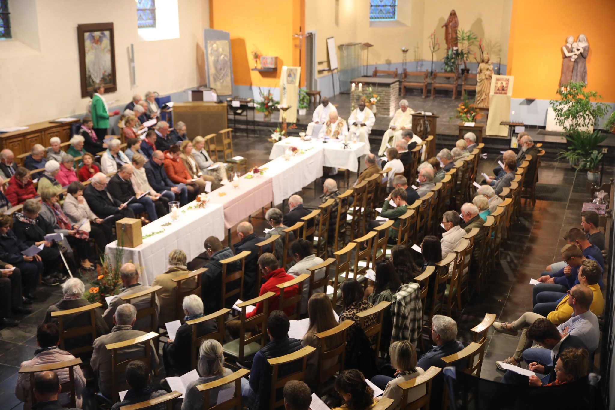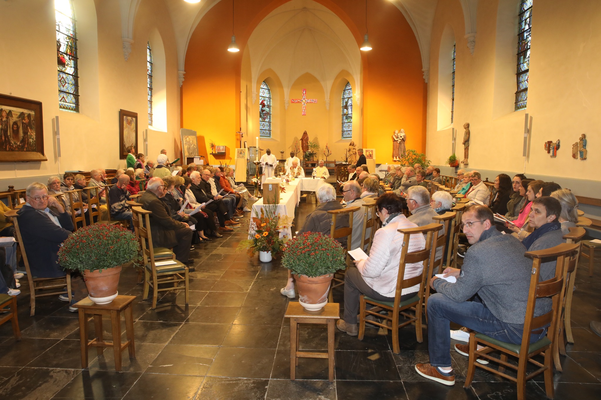 Tout avait été adapté pour la circonstance. C’est ainsi que la lecture préparée et lue par Marc Robinet faisait allusion à notre société ultra numérisée, l’homélie en wallon préparée et lue par Jean-Marie Theret nous parlait des béatitudes revisitées pour l’occasion. Les intentions, préparées par Cécile et François étaient traduites en wallon et lues par Jean-Pol. Même le chant final avait été concocté par la chorale pour dire merci à Léon pour tout ce qu’il a fait pour la paroisse jusqu’à présent.