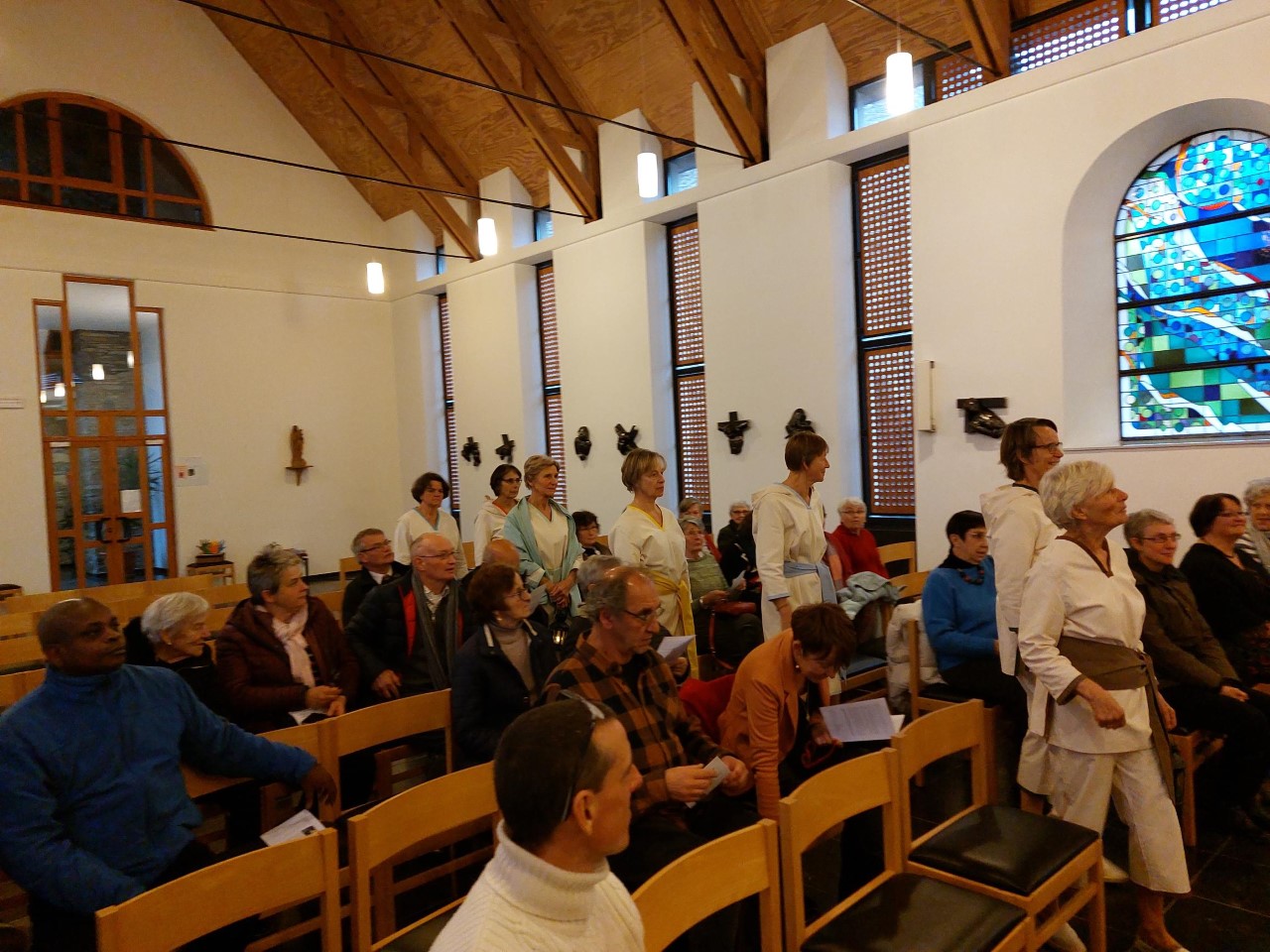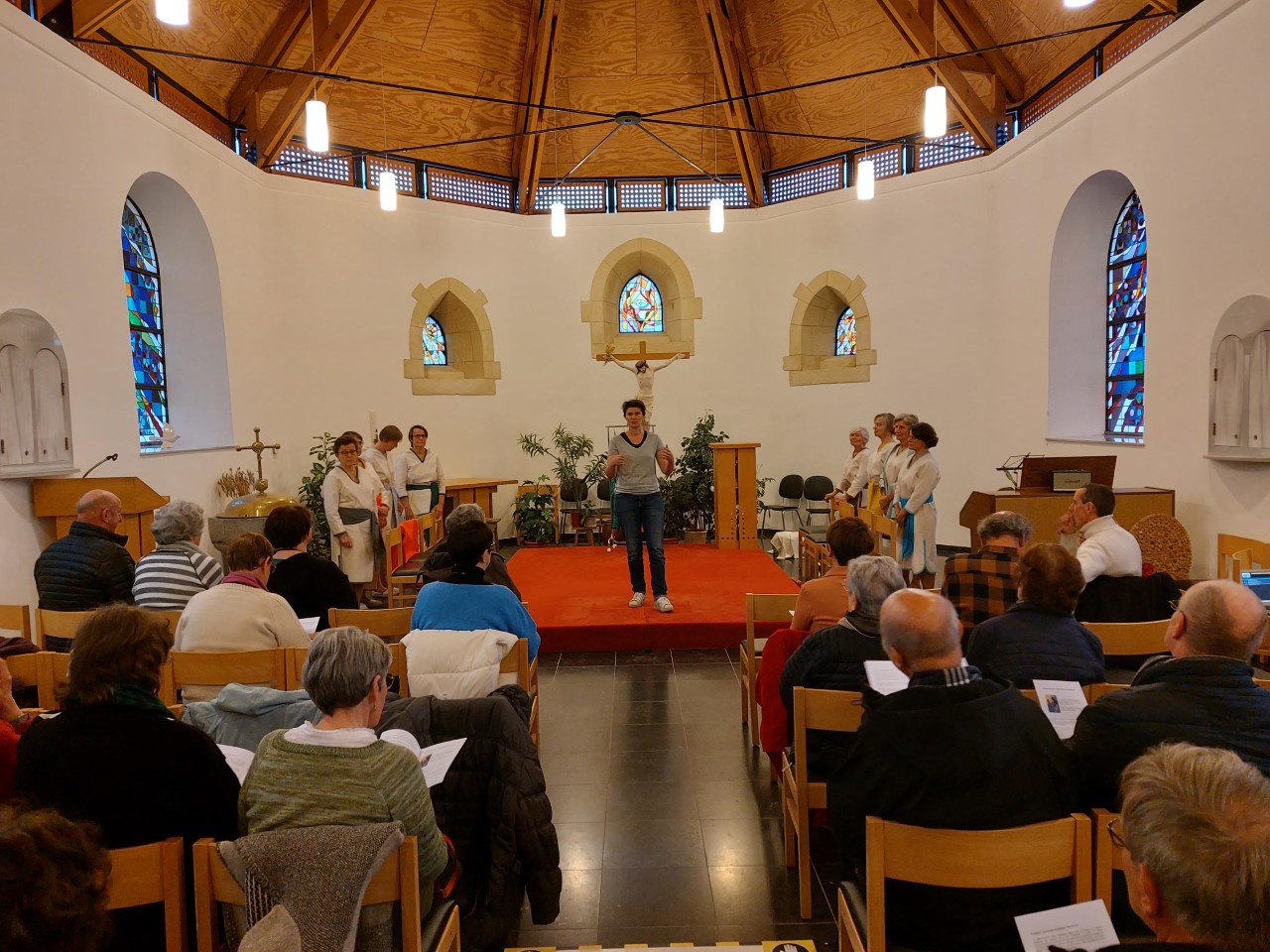 Dans le cadre de la Campagne d’Avent portée par Action Vivre Ensemble, deux activités ont été organisées dans notre secteur en vue d’une démarche de sensibilisation d’une part et d’une récolte de fonds d’autre part. Un autre regard sur l’Evangile, celui de femmes d’aujourd’hui qui relisent et interprètent des passages  évangéliques mettant en scène des rencontres entre Jésus et certaines femmes : la samaritaine, Marthe et Marie, la Cananéenne,…Cette création, fruit d’un travail exégétique, s’appuie sur une mise en scène dépouillée. Des paroles fortes, une  gestuelle, des objets symboliques traduisent bien le cheminement et le retournement vécus par ces femmes suite à leur rencontre avec Jésus : chacune est invitée à avancer vers plus d’autonomie, de liberté. Chacune est invitée à grandir. Le spectacle met aussi en évidence l’influence de ces femmes sur le cheminement de Jésus.  Il prend confiance en sa force, en sa parole qui délivre, relève et élève. Il prend conscience de sa mission universelle. Cette présentation suscite des émotions chez le spectateur mais aussi l’interpelle et l’invite à une introspection.  « Que m’inspire le sentiment de liberté de ces femmes ? Que me dit leur audace ? Qui est Jésus pour moi ? Comment traverser le doute, la souffrance ? Suis-je un.e vivant.e ?… Après le spectacle, Jean-Pol Gallez, permanent d’Action Vivre Ensemble,  a évoqué non seulement le thème d’année « Faim de justice sociale » mais a rappelé les grands axes d’action  de cette association engagée dans la lutte contre la pauvreté et reconnue pour son travail d’éducation permanente  (soutien aux initiatives qui agissent contre l’exclusion, l’injustice et la pauvreté en Wallonie et à Bruxelles – sensibilisation du grand public – dénonciation des mécanismes qui engendrent et perpétuent des situations de pauvreté et d’injustice et proposition d’alternatives.) Il a  fait le lien entre les valeurs et actions de Vivre Ensemble et les valeurs évangéliques mises en évidence lors du spectacle. A titre de témoin du soutien d’Action Vivre Ensemble aux associations luttant contre la pauvreté, Véronique Maldague a présenté le nouveau  projet d’alphabétisation pour adultes (belges et étrangers) de la Fourmilière à Gedinne, retenu entre autres cette année en vue d’un soutien financier. Un échange entre actrices, Jean-Pol Gallez, Véronique Maldague et public, a terminé cette après-midi.