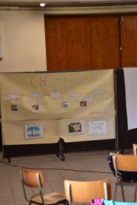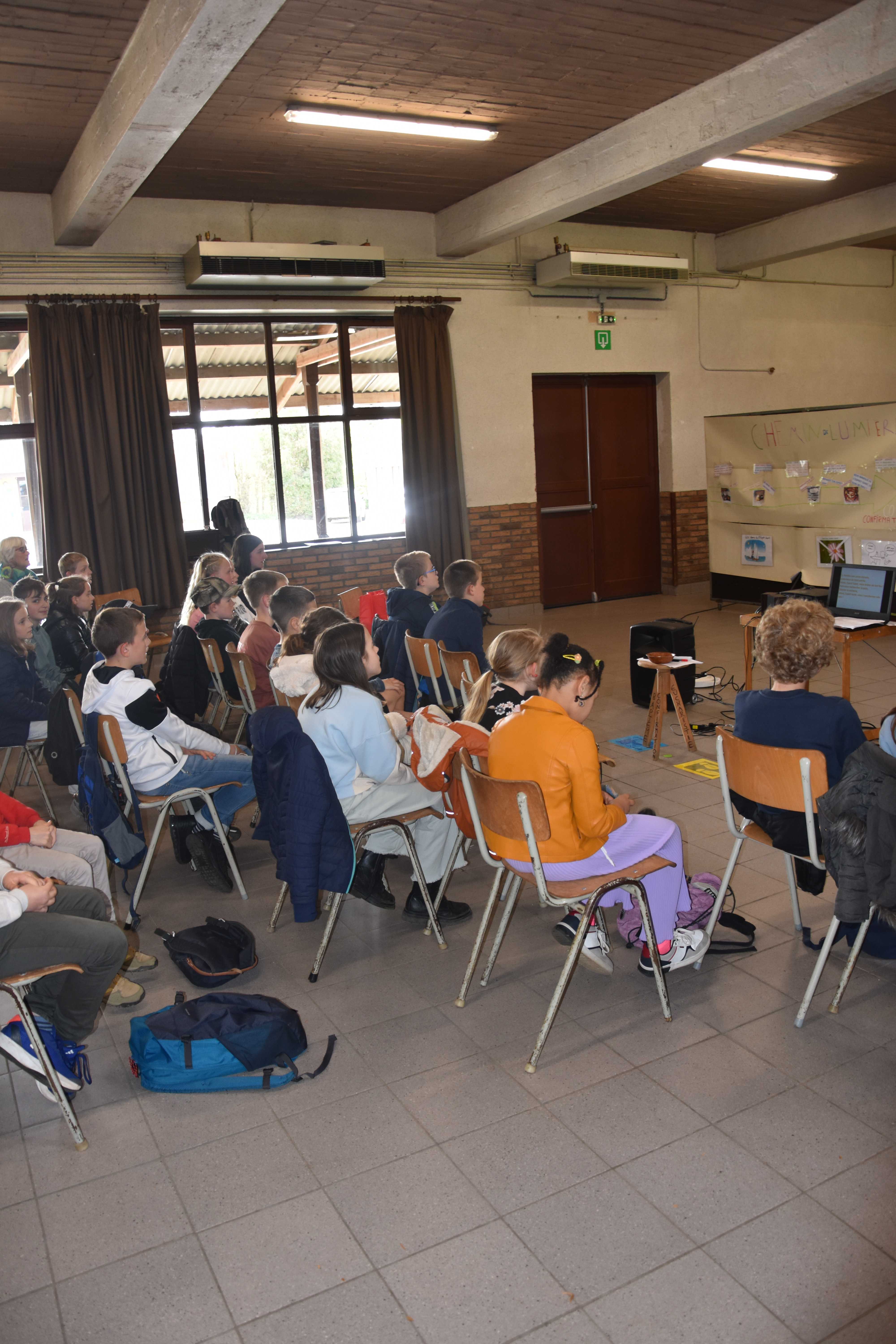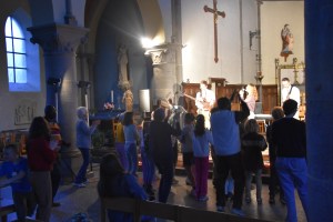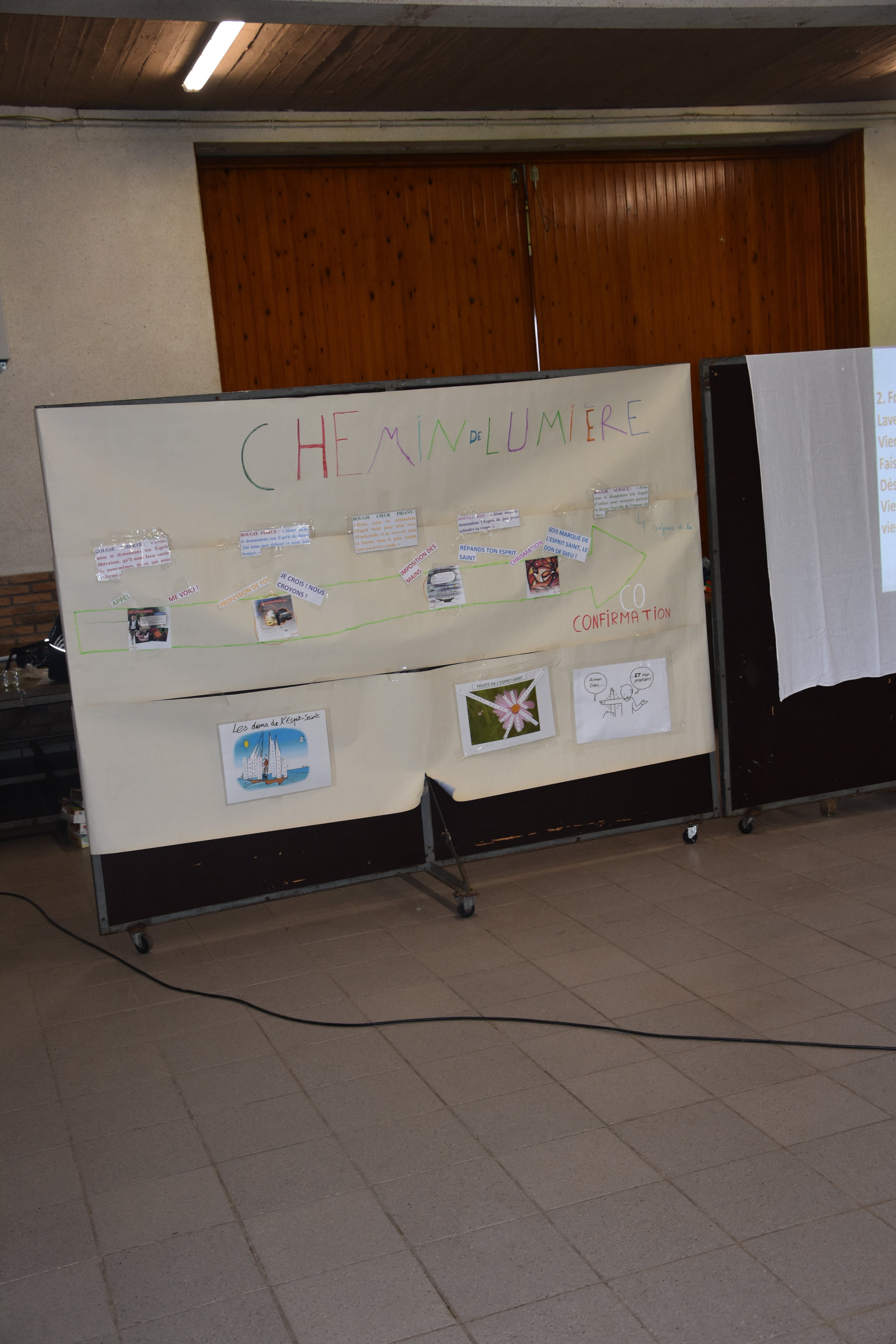 Quelques photos de la retraite de confirmation : prière collective après le sacrement de réconciliation, le jeu de coopération « Pilgrims », découverte du trésor suite après le jeu, panneaux didactiques et chants gestués.