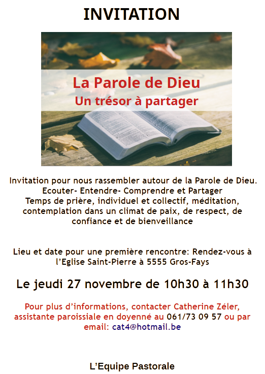 Partagez si vous aimez ! Cliquer pour partager sur X(ouvre dans une nouvelle fenêtre) X Cliquez pour partager sur Facebook(ouvre dans une nouvelle fenêtre) Facebook Cliquez pour partager sur LinkedIn(ouvre dans une nouvelle fenêtre) LinkedIn Cliquez pour partager sur WhatsApp(ouvre dans une nouvelle fenêtre) WhatsApp J’aime chargement… La Parole de Dieu – Un trésor à partager – jeudi 27 novembre 2025 – Gros Fays 18 octobre 202527 novembre 2025 / veroniquepaquay67 / Poster un commentaire