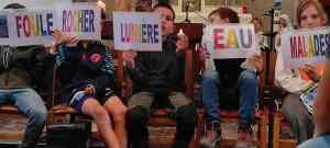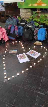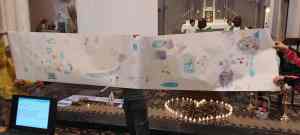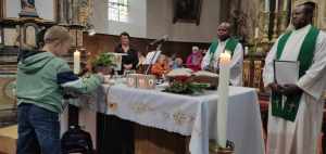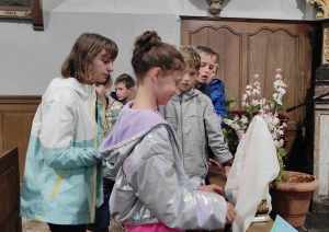 Avant le grand jeu « trivial pursuit » comme fil rouge, les apparitions de la Vierge Marie à Bernadette à Lourdes ont été racontées et les signes de Lourdes expliqués. Les 4 postes consistaient à remettre ensemble des images et textes sur le thème des apparitions de Lourdes – remettre dans l’ordre les prières du Notre Père, Je vous salue Marie et Je crois (symbole des apôtres) – dessiner un tableau collectif sur les signes de l’eau et de la lumière et dire si un verset lu était issu de l’Ancien ou du Nouveau Testament. A chaque passage, un quart de la boîte à camembert colorié et un objet à découvrir : un signe de Lourdes => eau/lumière – malades – rocher et foule. L’eucharistie participative et avec une présence nombreuse des parents a permis aux enfants lors d’une homélie dialoguée de se remémorer ces différents signes et leur signification spirituelle. Les enfants ont reçu des petites bougies LED qu’ils ont déposées par terre pour former un coeur, ces petits luminaires serviront à la prière au caté et chez eux. Ils ont aussi reçu un chapelet. A la fin de l’eucharistie, pour lancer l’année scolaire et de caté, l’abbé Félicien les a bénis ainsi que leur mallette.