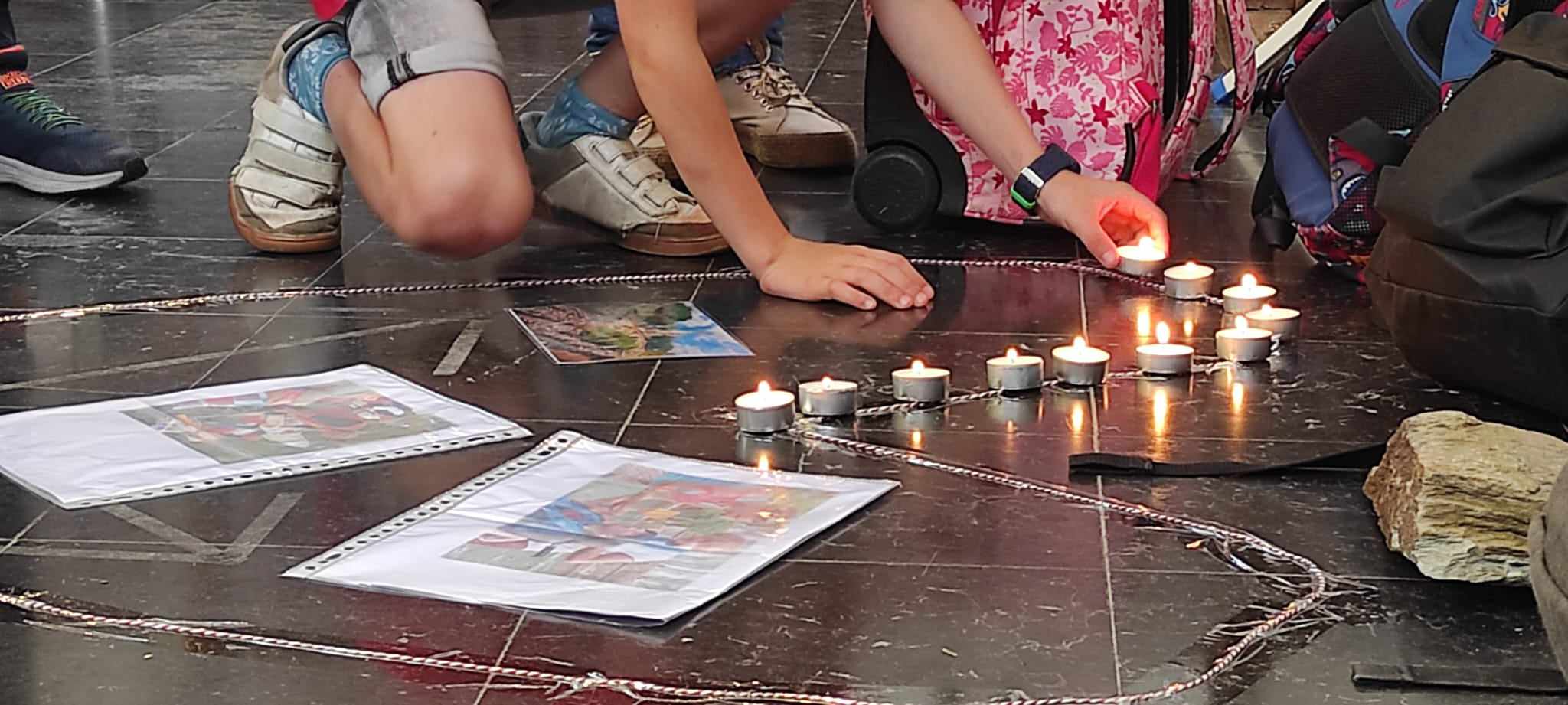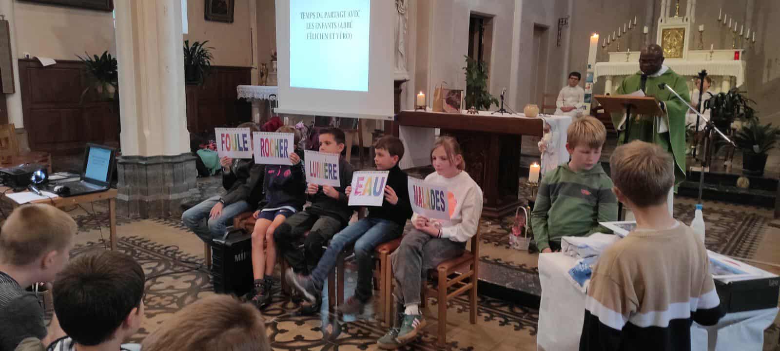 Avant le grand jeu « trivial pursuit » comme fil rouge, les apparitions de la Vierge Marie à Bernadette à Lourdes ont été racontées et les signes de Lourdes expliqués. Les 4 postes consistaient à remettre ensemble des images et textes sur le thème des apparitions de Lourdes – remettre dans l’ordre les prières du Notre Père, Je vous salue Marie et Je crois (symbole des apôtres) – dessiner un tableau collectif sur les signes de l’eau et de la lumière et dire si un verset lu était issu de l’Ancien ou du Nouveau Testament. A chaque passage, un quart de la boîte à camembert colorié et un objet à découvrir : un signe de Lourdes => eau/lumière – malades – rocher et foule. L’eucharistie participative et avec une présence nombreuse des parents a permis aux enfants lors d’une homélie dialoguée de se remémorer ces différents signes et leur signification spirituelle. Les enfants ont reçu des petites bougies LED qu’ils ont déposées par terre pour former un coeur, ces petits luminaires serviront à la prière au caté et chez eux. Ils ont aussi reçu un chapelet. A la fin de l’eucharistie, pour lancer l’année scolaire et de caté, l’abbé Félicien les a bénis ainsi que leur mallette.
