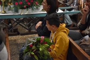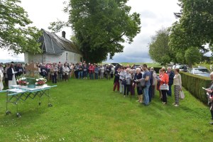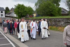 A la fin de l’eucharistie, le doyen Casmir a expliqué avoir vu Madame Yvonne Piron hier pour les dernières mises au point et, à son grand étonnement, elle lui a alors annoncé son intention d’arrêter la préparation et l’organisation de ce pèlerinage. Il a ajouté qu’il fallait être toujours reconnaissant et a souligné l’importance et la valeur des bénévoles, des personnes qui donnent de leur temps et des moyens pour le bien-être de nos communautés. Le doyen Casmir a dit que Madame Yvonne n’a pas laissé tomber la flamme de la foi et la dévotion à Notre Dame de Bon Secours. Il a souhaité que Dieu la protège et que Notre Dame l’accompagne toujours. Un jeune ado, présent dans l’assemblée, lui a remis un bouquet de fleurs en guise de reconnaissance. Après l’eucharistie, tous les pèlerins ont marché jusqu’à la chapelle Notre Dame de Oizy pour la vénération de la petite statue de Notre Dame.