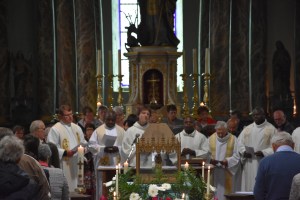 C’est l’abbé Bruno Robberechts, doyen de Leuze et formateur au Séminaire Notre Dame de Namur, qui a présidé l’eucharistie, entouré de nombreux prêtres du doyenné. Dans son homélie, il a expliqué l’importance du CIEL avec un C majuscule, comme un endroit, là où Dieu est présent. Il nous a invités à un voyage : aller vers un coin de Ciel qui est là dans notre coeur. A nous d’y découvrir la présence de Dieu qui nous accompagne ! En aimant gratuitement, notre vie va être bousculée, renouvelée si nous répondons « OUI » ! Cette expérience a été vécue également par les disciples ; ils ont compris que les choses avaient changé ! Notre société vit souvent aussi avec pas mal de fardeaux à porter. Un pèlerinage est l’occasion de chercher ce qu’il y a d’essentiel dans notre coeur. Jésus nous demande d’aimer comme lui jusqu’à donner de soi, jusqu’à donner sa vie ! Devenons des êtres de louange ! Comme on a besoin d’avoir un esprit de louange ! On se plaint souvent, on peut se rendre compte qu’avec un petit peu d’amour, quelque chose de merveilleux peut se produire ! Avec de l’espérance, on peut entrer dans le projet de Dieu.