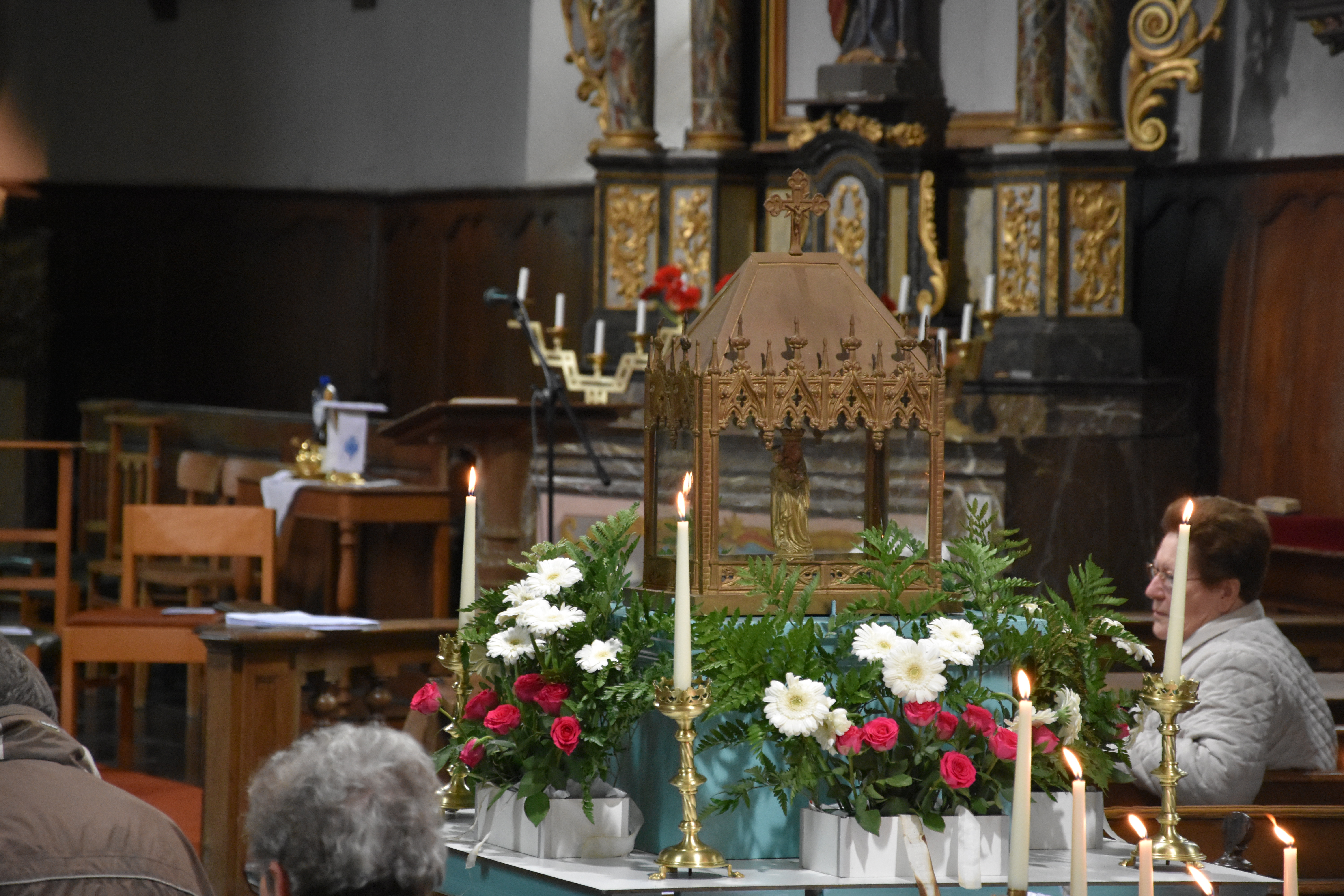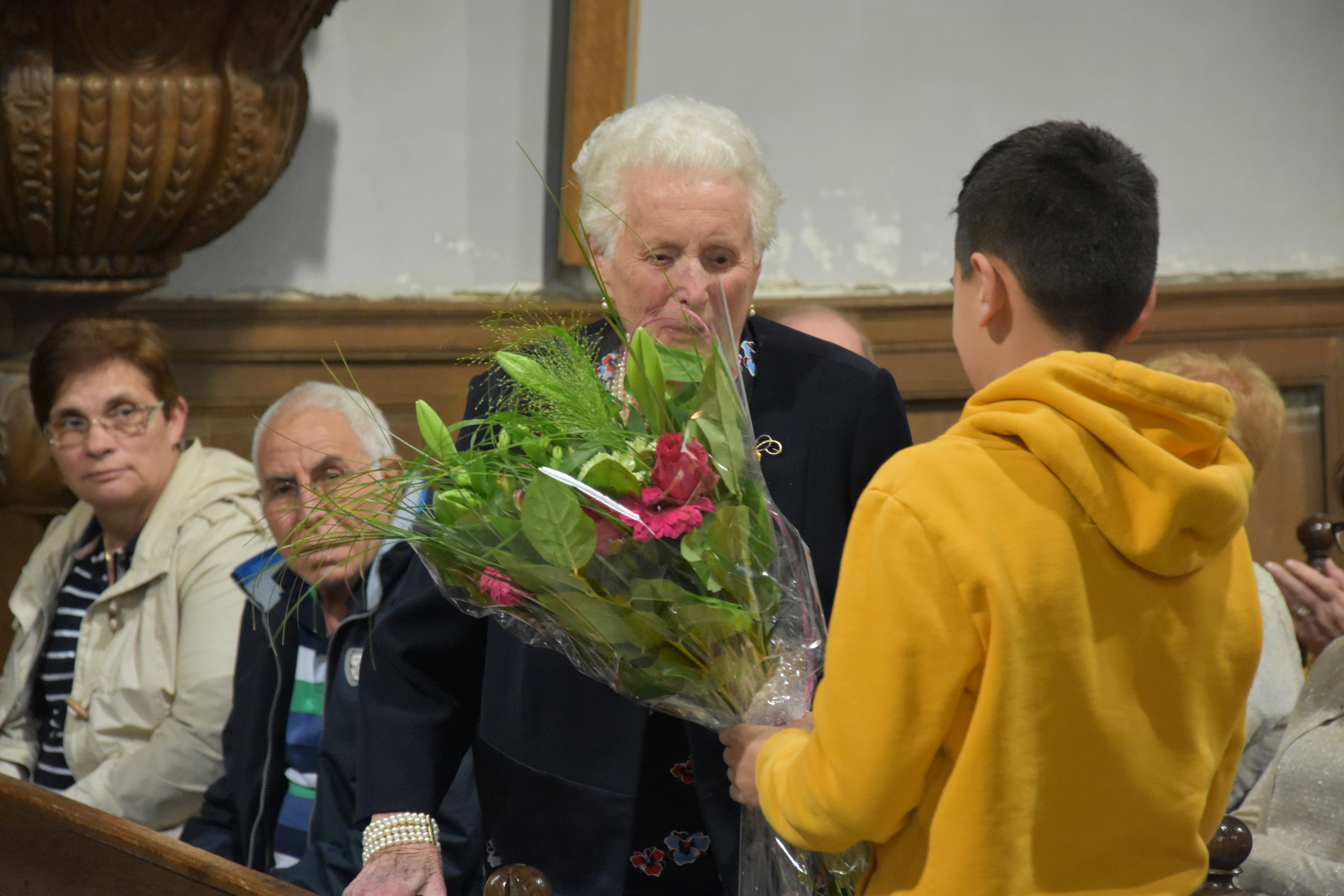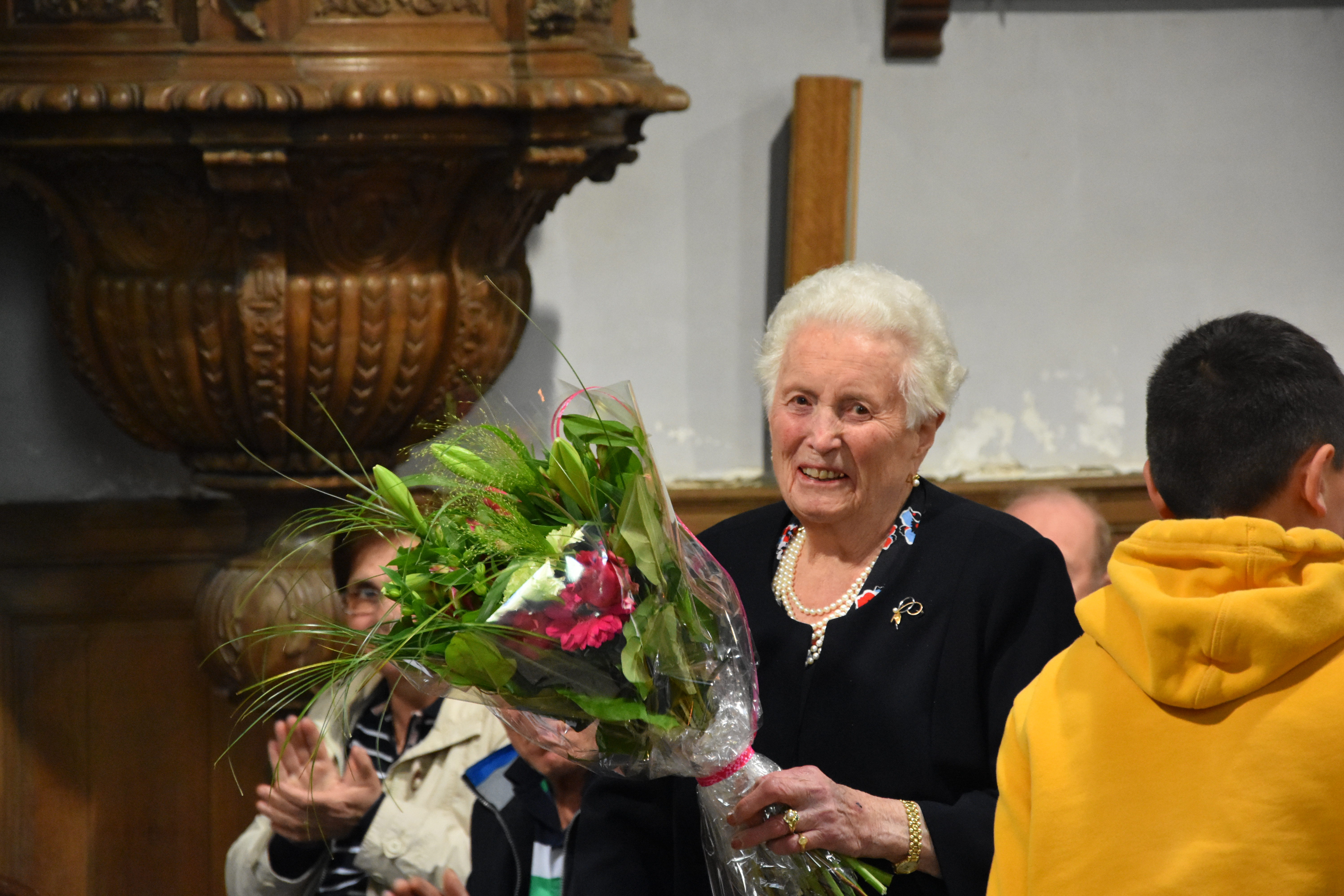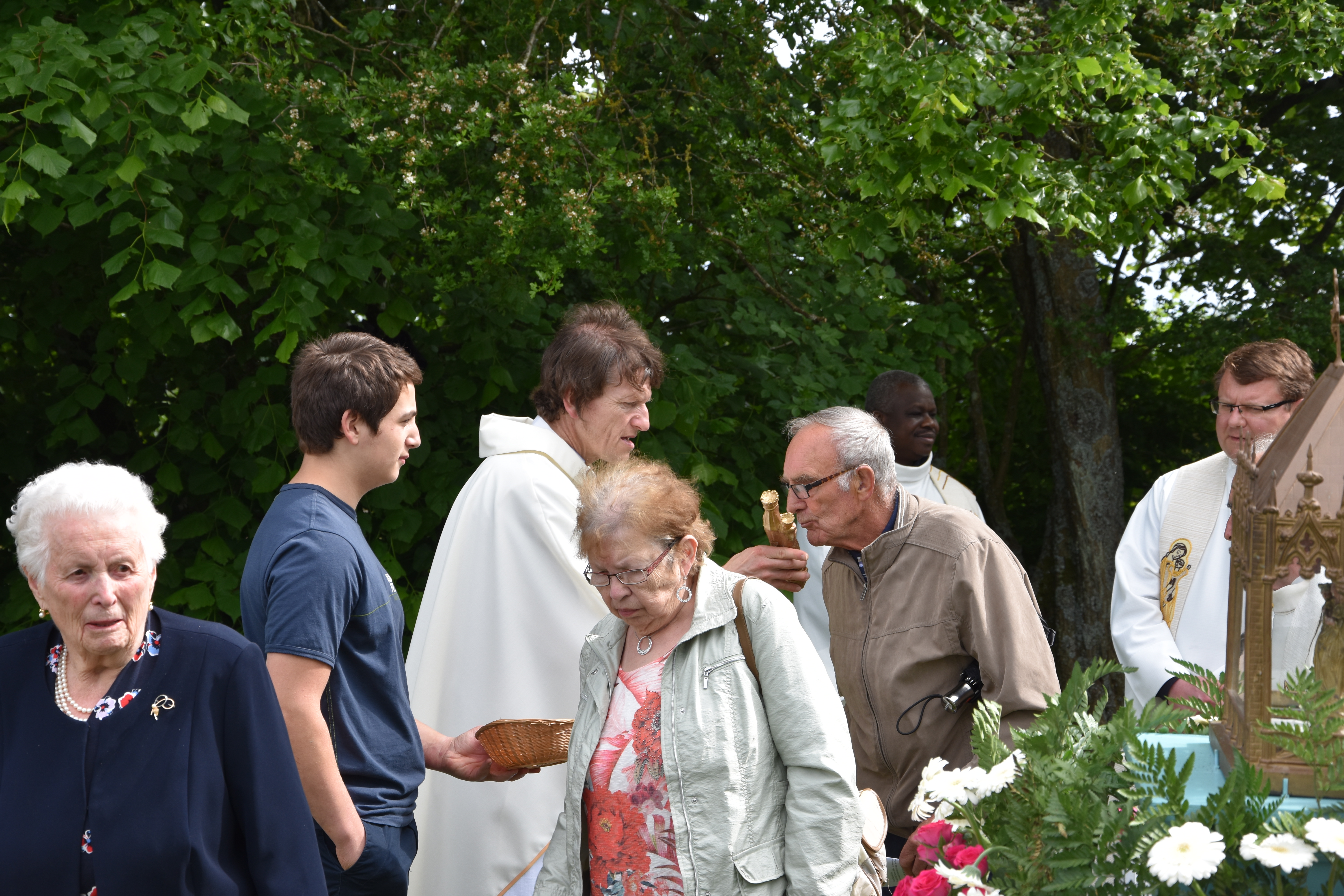 A la fin de l’eucharistie, le doyen Casmir a expliqué avoir vu Madame Yvonne Piron hier pour les dernières mises au point et, à son grand étonnement, elle lui a alors annoncé son intention d’arrêter la préparation et l’organisation de ce pèlerinage. Il a ajouté qu’il fallait être toujours reconnaissant et a souligné l’importance et la valeur des bénévoles, des personnes qui donnent de leur temps et des moyens pour le bien-être de nos communautés. Le doyen Casmir a dit que Madame Yvonne n’a pas laissé tomber la flamme de la foi et la dévotion à Notre Dame de Bon Secours. Il a souhaité que Dieu la protège et que Notre Dame l’accompagne toujours. Un jeune ado, présent dans l’assemblée, lui a remis un bouquet de fleurs en guise de reconnaissance. Après l’eucharistie, tous les pèlerins ont marché jusqu’à la chapelle Notre Dame de Oizy pour la vénération de la petite statue de Notre Dame.